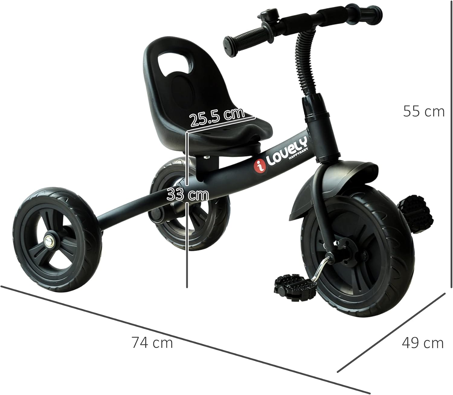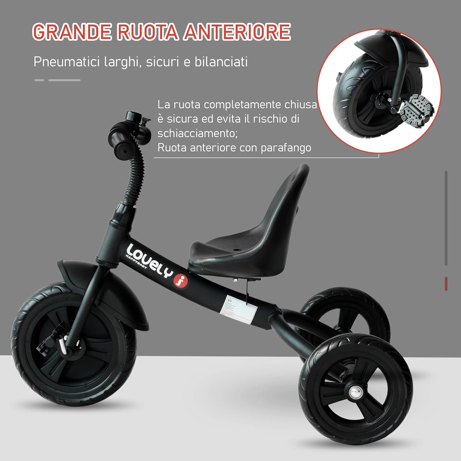 Triciclo dal design sportivo e moderno, farà felici i vostri bimbi ; Molto sicuro e resistente, adatto ai bambini dai 18 mesi in su Telaio in metallo robusto, parti in plastica di alta qualità ; Sedile con comodo schienale ; Con un pratico campanello Ampie ruote in EVA, progettate appositamente per evitare che i piedi dei bambini possano entrarne in contatto durante la pedalata. La ruota anteriore con pannello per parafango ; Passato test di EN71-1-2-3, ASTM F963, CPSIA
