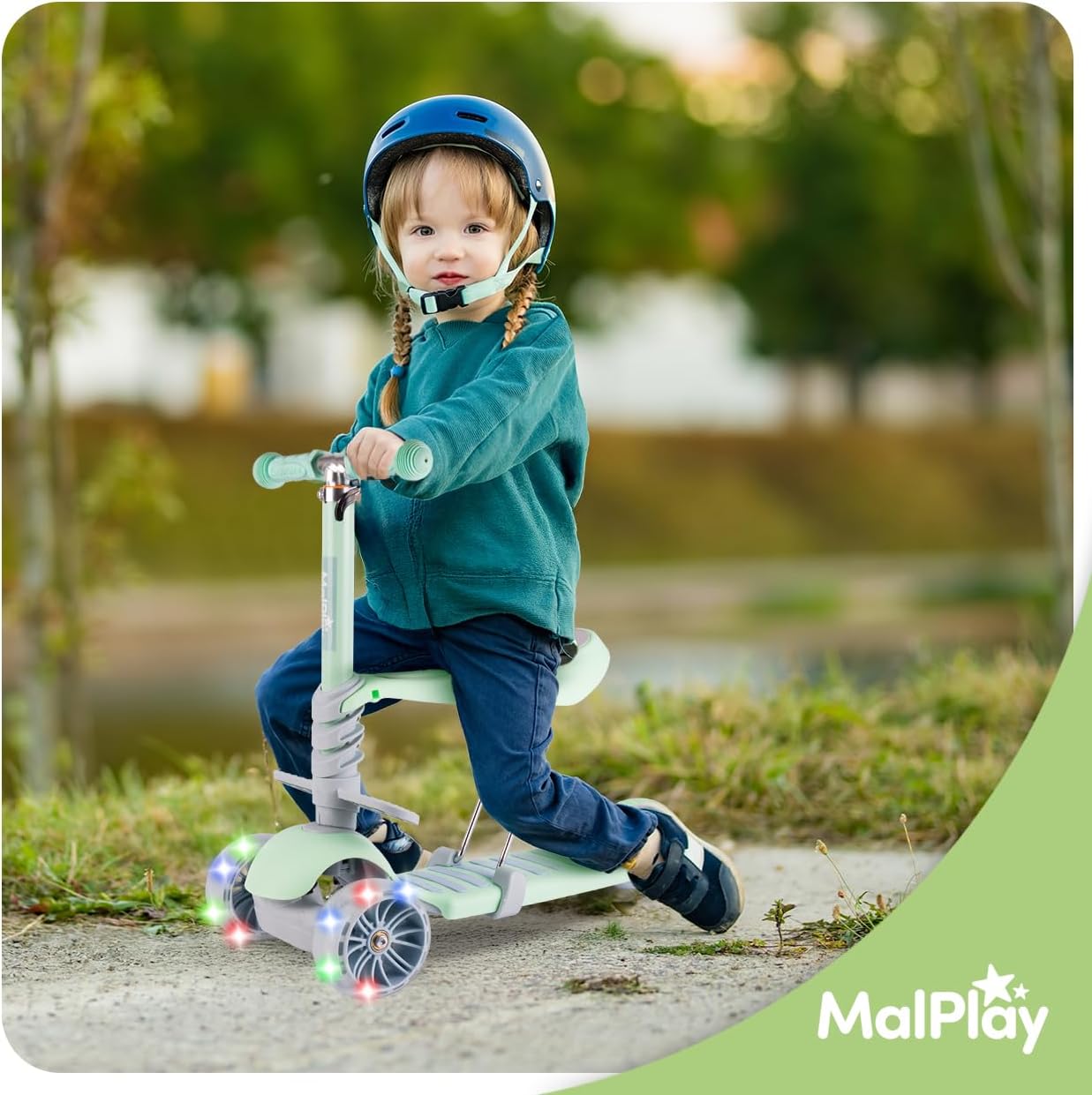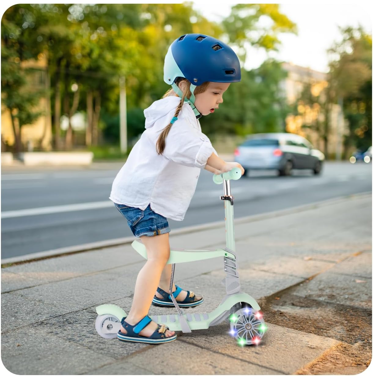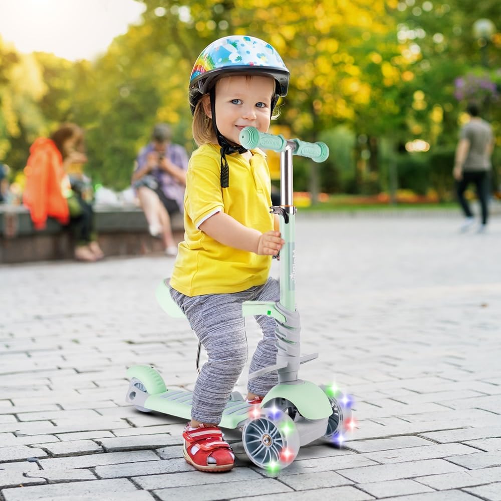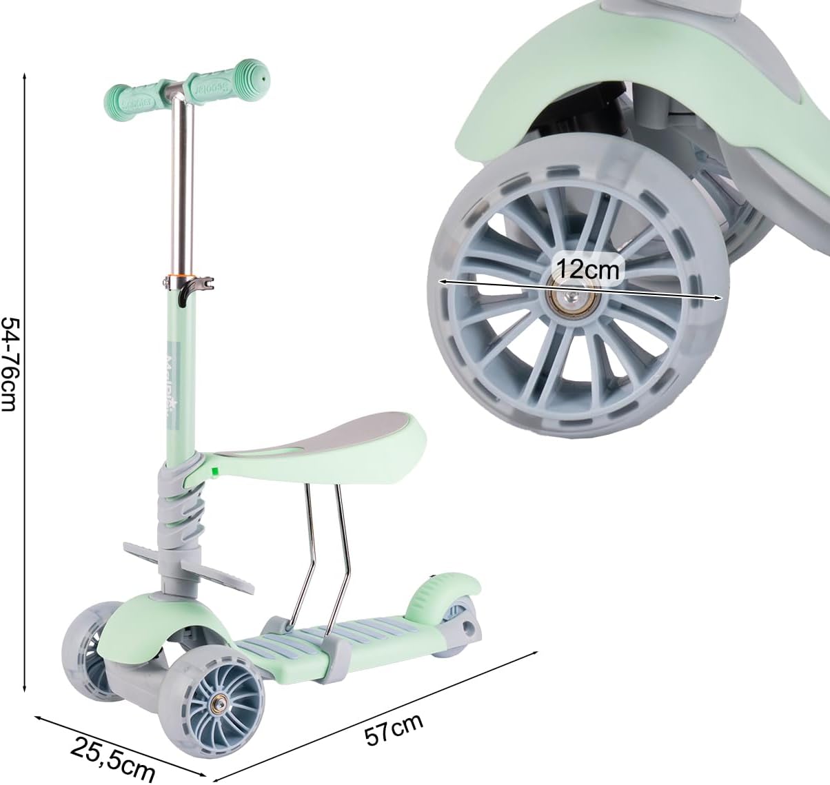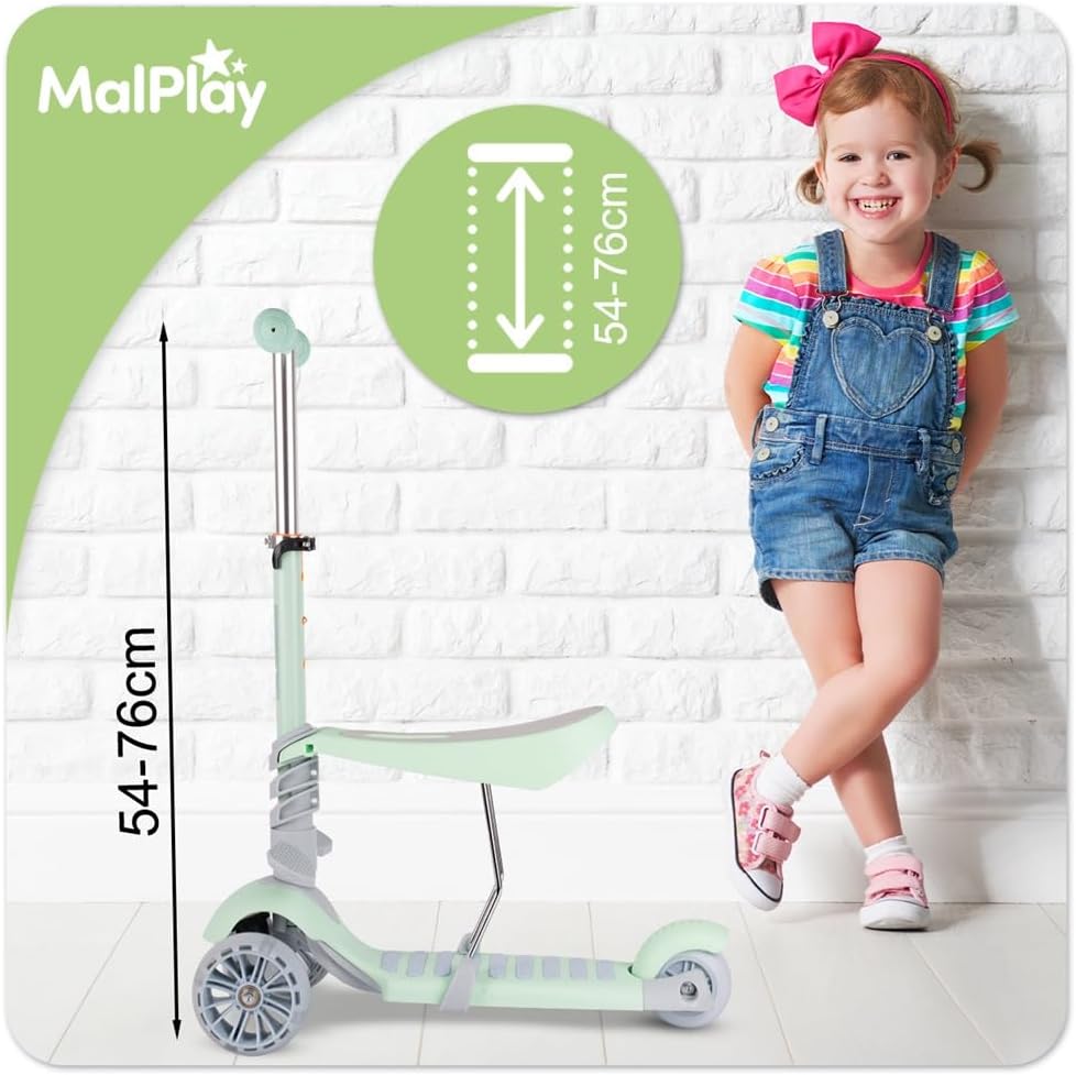 Funzione 3 in 1: può essere utilizzato come scooter in piedi, scooter seduto e veicolo in equilibrio. Ruote stabili e larghe: assicurano una guida fluida e confortevole oltre ad una maggiore sicurezza. Ruote LED luminose: le luci LED si accendono durante la guida, il che non solo è divertente ma aumenta anche la visibilità. Manubrio regolabile: può essere regolato in base all'altezza del bambino. Piattaforme gambe aggiuntive: aumentano il comfort durante la guida in posizione seduta.
