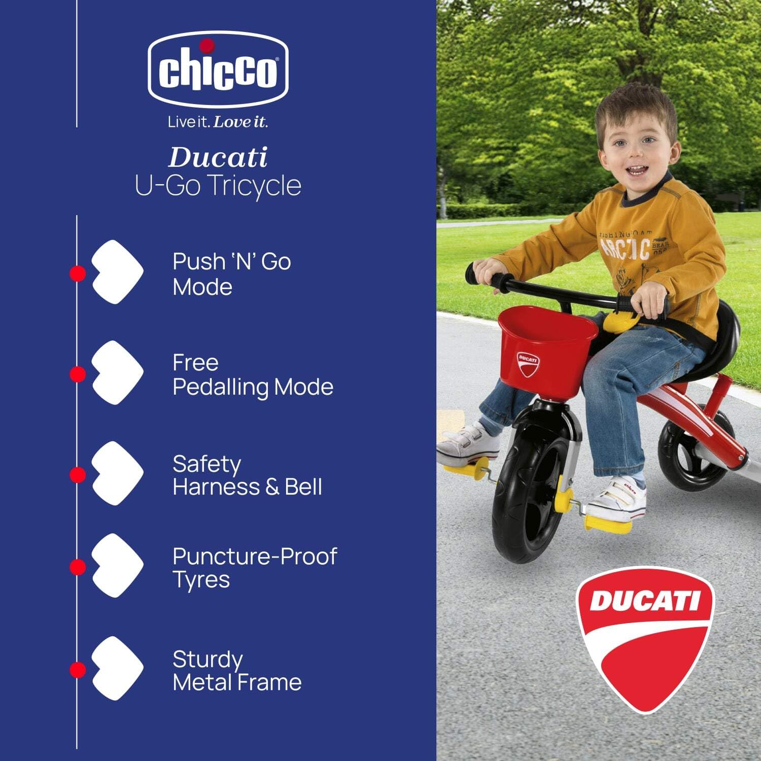 TRICICLO U-GO 2IN1: Triciclo con manico telescopico dal design sportivo e moderno, dotato di comoda seduta, resistente telaio in metallo e ampio cestello portaoggetti. 2 modalità di utilizzo MANICO TELESCOPICO: Il manico telescopico è regolabile in tre posizioni a seconda dell'altezza dell'adulto per guidare i bambini nelle prime esperienze PUSH-AND-GO: Il triciclo bimbi con manico telescopico regolabile in altezza si adatta all'altezza dei genitori ed è quindi facile da spingere PEDALATA LIBERA: Rimuovendo il maniglione i bambini possono pedalare liberamente ed esplorare il mondo che li circonda SICURO: Il triciclo Chicco U-GO è dotato di cintura di sicurezza, pedali con blocco on/off e un bloccasterzo RUOTE IN GOMMA: U-GO ha un buon grip su tutte le superfici ed è comodo da guidare grazie alle ruote in gomma morbida e antiforatura
