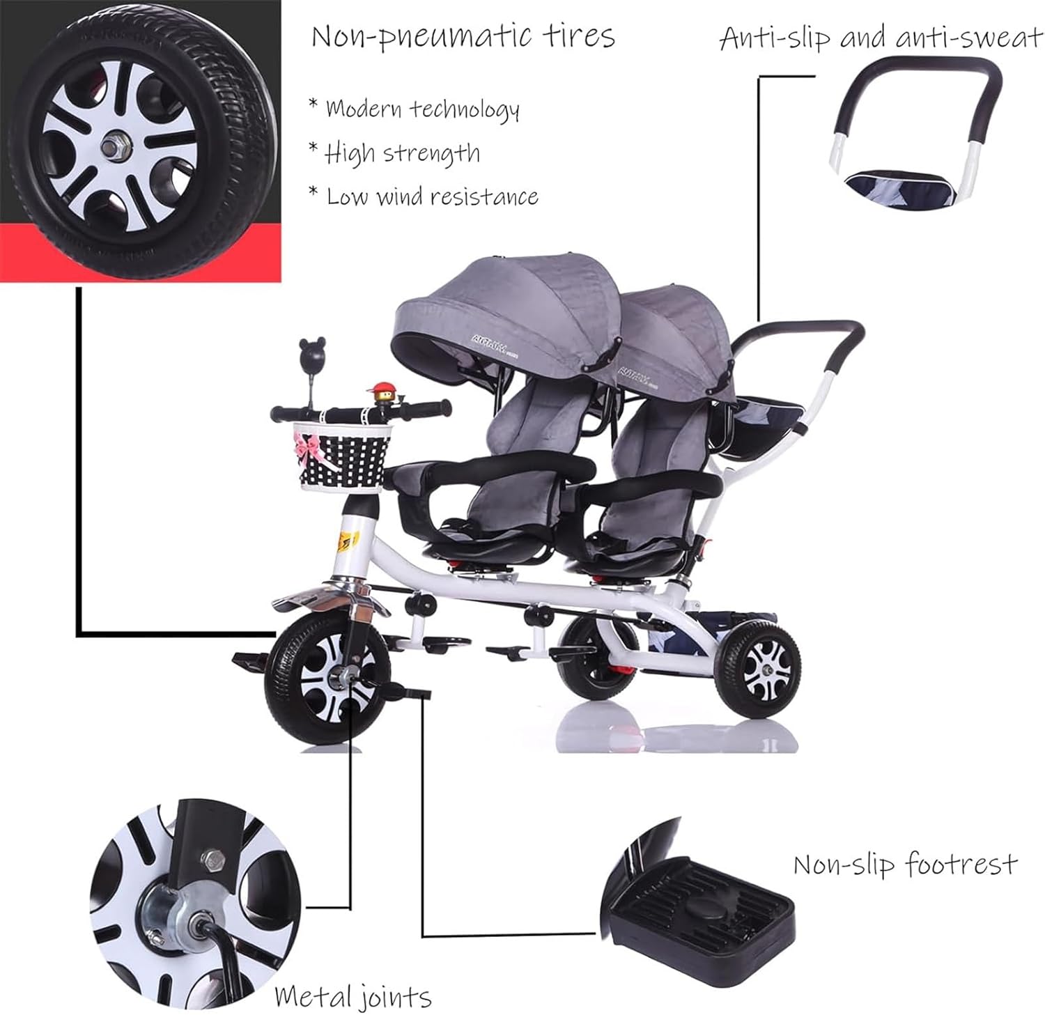 ALTA STABILITÀ E SICUREZZA: la struttura complessiva di questo triciclo biposto per bambini è realizzata principalmente in tubi di acciaio al carbonio, molto robusti. Inoltre, i doppi freni posteriori consentono di arrestare rapidamente il passeggino a tre ruote per evitare potenziali pericoli. Ruote in EVA per tutti i terreni: Per le ruote abbiamo utilizzato materiale in gomma di alta qualità, tenendo conto della diversità dei terreni esterni. Le ruote, leggere e non gonfiate, sono inoltre dotate di una struttura che assorbe gli urti e rende i pneumatici sufficientemente resistenti per un'ampia gamma di superfici. COMODO CONTROLLO DA PARTE DEI GENITORI: i genitori possono facilmente utilizzare il manico per controllare lo sterzo e la velocità del triciclo a due posti quando il bambino non è in grado di guidarlo autonomamente. Il manico è anche staccabile, per consentire ai bambini di guidare liberamente. Inoltre, il manico e la capottina del triciclo sono rimovibili, per cui è possibile riporre questo triciclo per bambini nel bagagliaio per ottimizzare lo spazio. FUNZIONALITÀ E DIVERTIMENTO: i due sedili del seggiolino girevole e della capottina regolabile possono essere ruotati di 360°, consentendo al bambino di giocare faccia a faccia in movimento, aggiungendo divertimento, attuazione attiva e godimento del paesaggio esterno. TRICICLO PER BAMBINI: Il nostro triciclo per bambini può essere utilizzato come triciclo per bambini, triciclo classico per soddisfare le esigenze dei bambini in diverse fasi della crescita. Questo triciclo a spinta a due posti è adatto a due bambini di età compresa tra 1 e 6 anni.