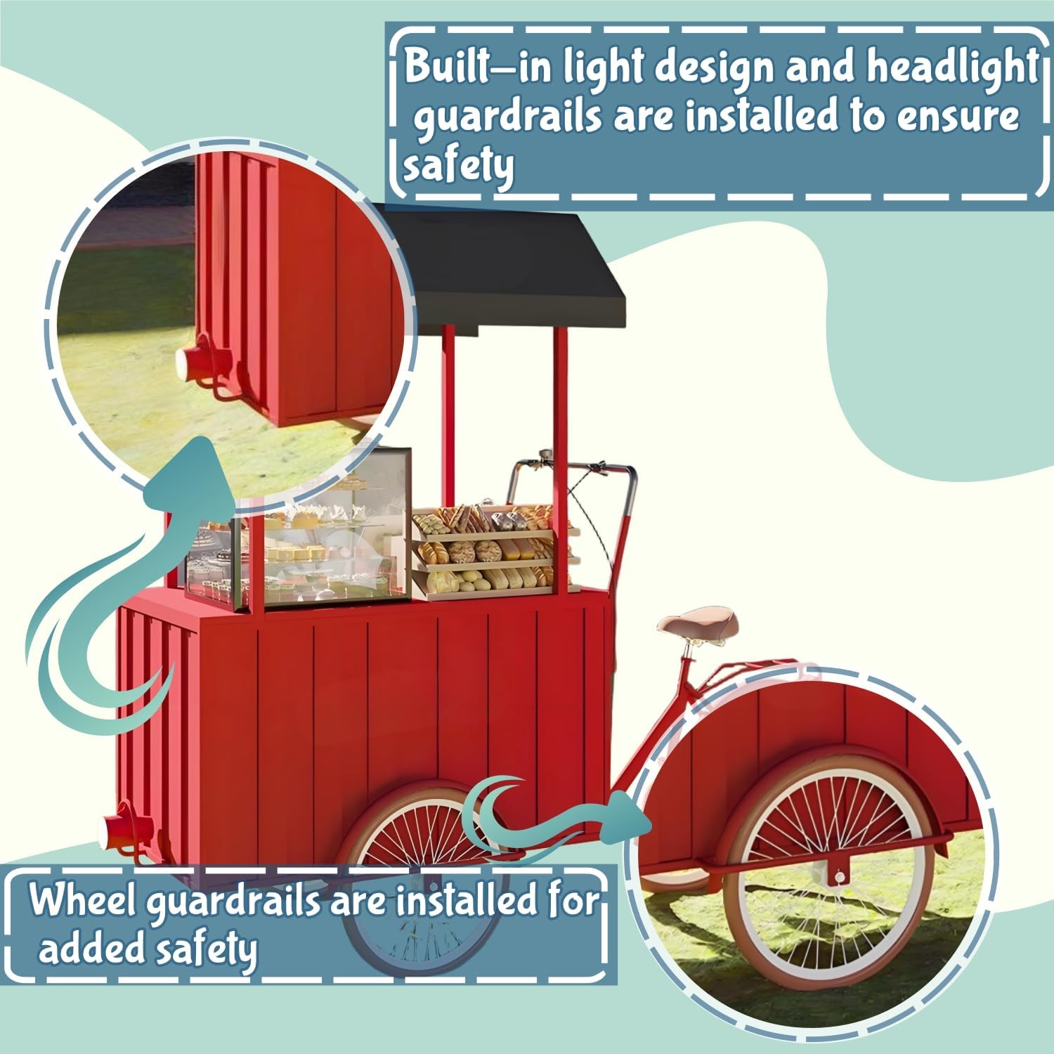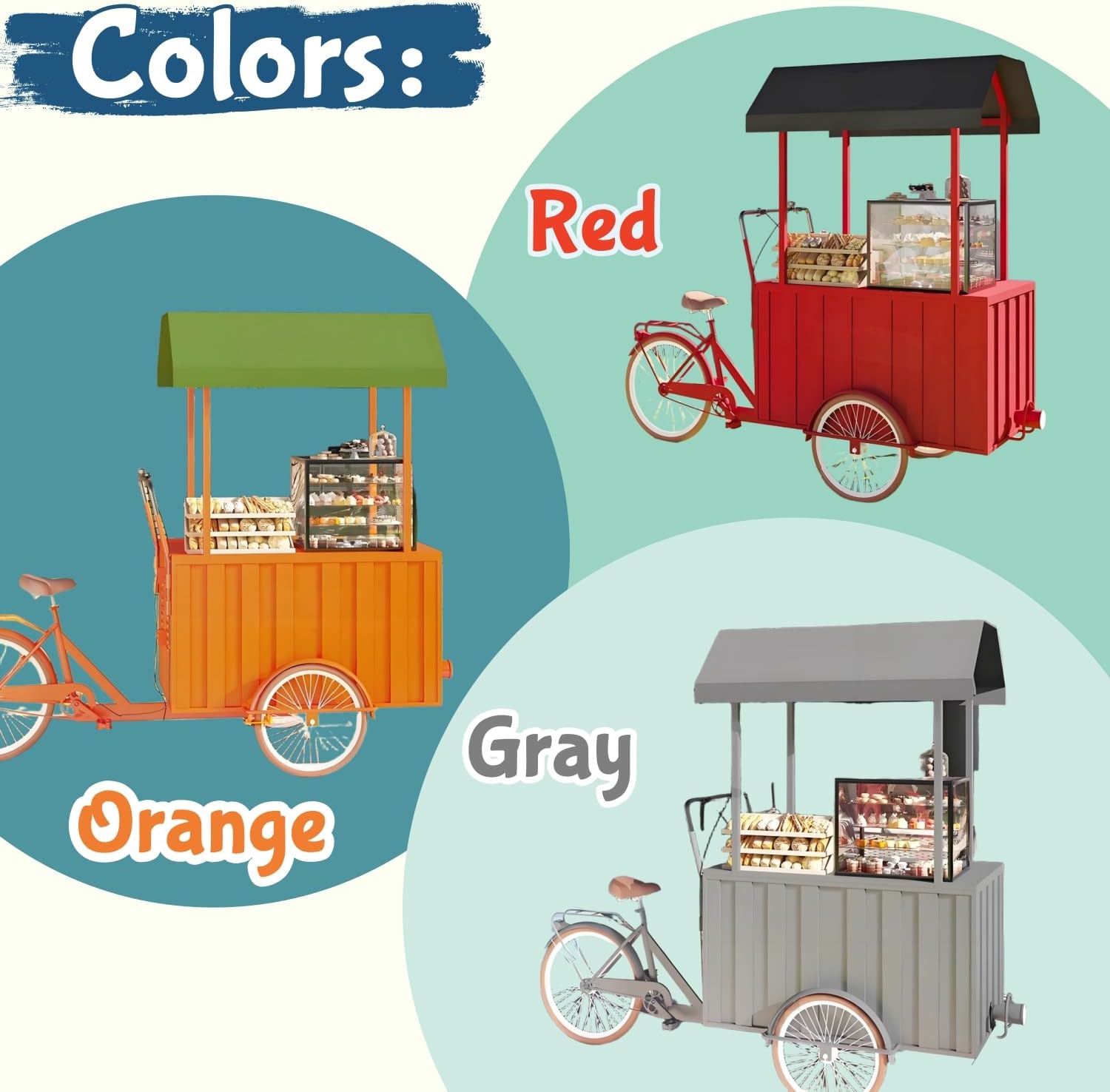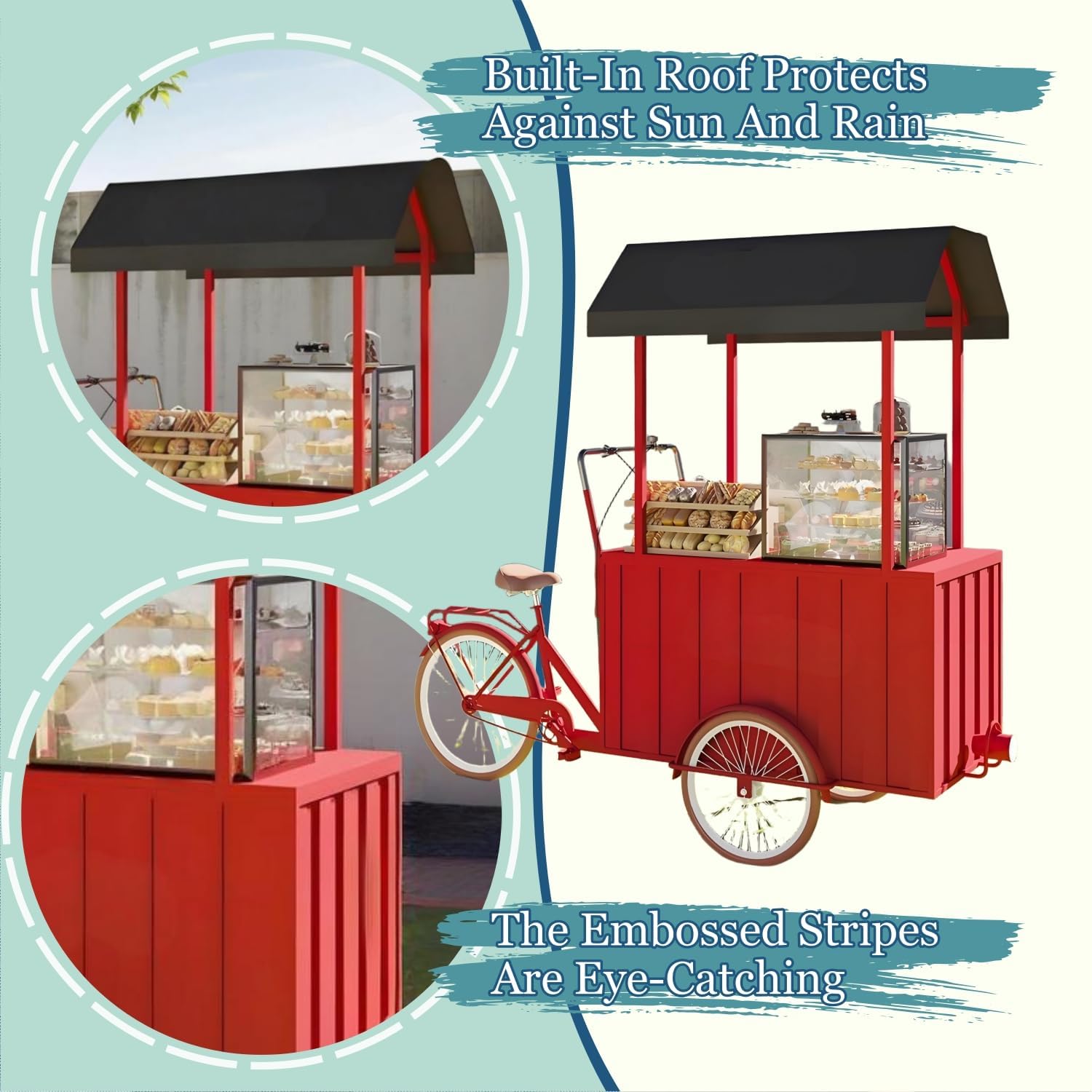 Materiali di alta qualità: questo grande carrello per bicicletta è realizzato con materiali di alta qualità e rigorosamente controllati. I suoi pontoni in ferro sono resistenti ai graffi e all'usura e offrono una forte capacità di carico. Design del movimento inverso: questo distributore automatico a tre ruote presenta un design unico del movimento inverso. Sia in posizione fissa che in movimento, offre un'esperienza di guida flessibile e senza sforzo. Stand promozionale multifunzione: questo carrello per biciclette è dotato di un'ampia superficie di ristorazione pieghevole e regolabile in modo continuo, attirando così i clienti e migliorando l'efficacia promozionale del tuo stand. Facile montaggio: il design complessivo del carrello per biciclette è semplice ed elegante e il suo assemblaggio è semplice e non richiede competenze particolari. Si piega facilmente per lo stoccaggio e il trasporto. Adattabile a molteplici scenari: un rimorchio per fiori commerciale può essere utilizzato come bancarella mobile, camion di cibo, esposizione in un centro commerciale o decorazione di un'attrazione turistica, espandendo la tua attività di vendita al dettaglio.