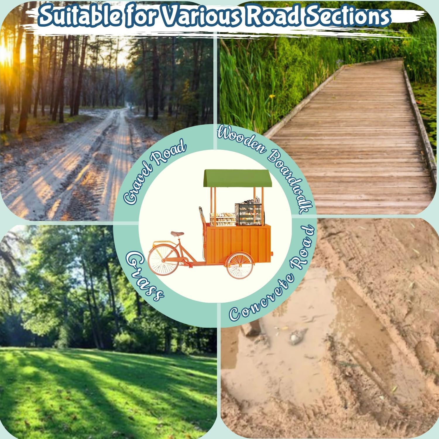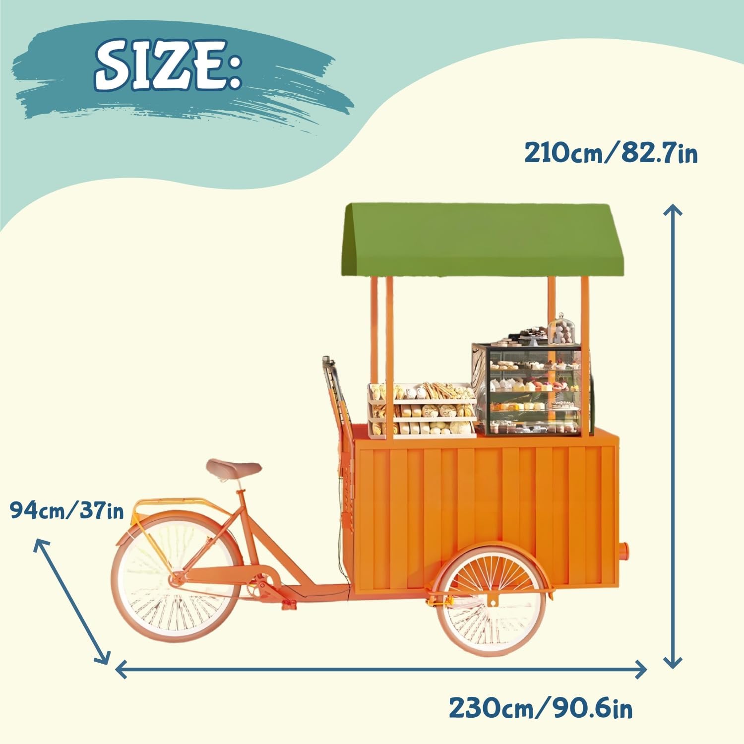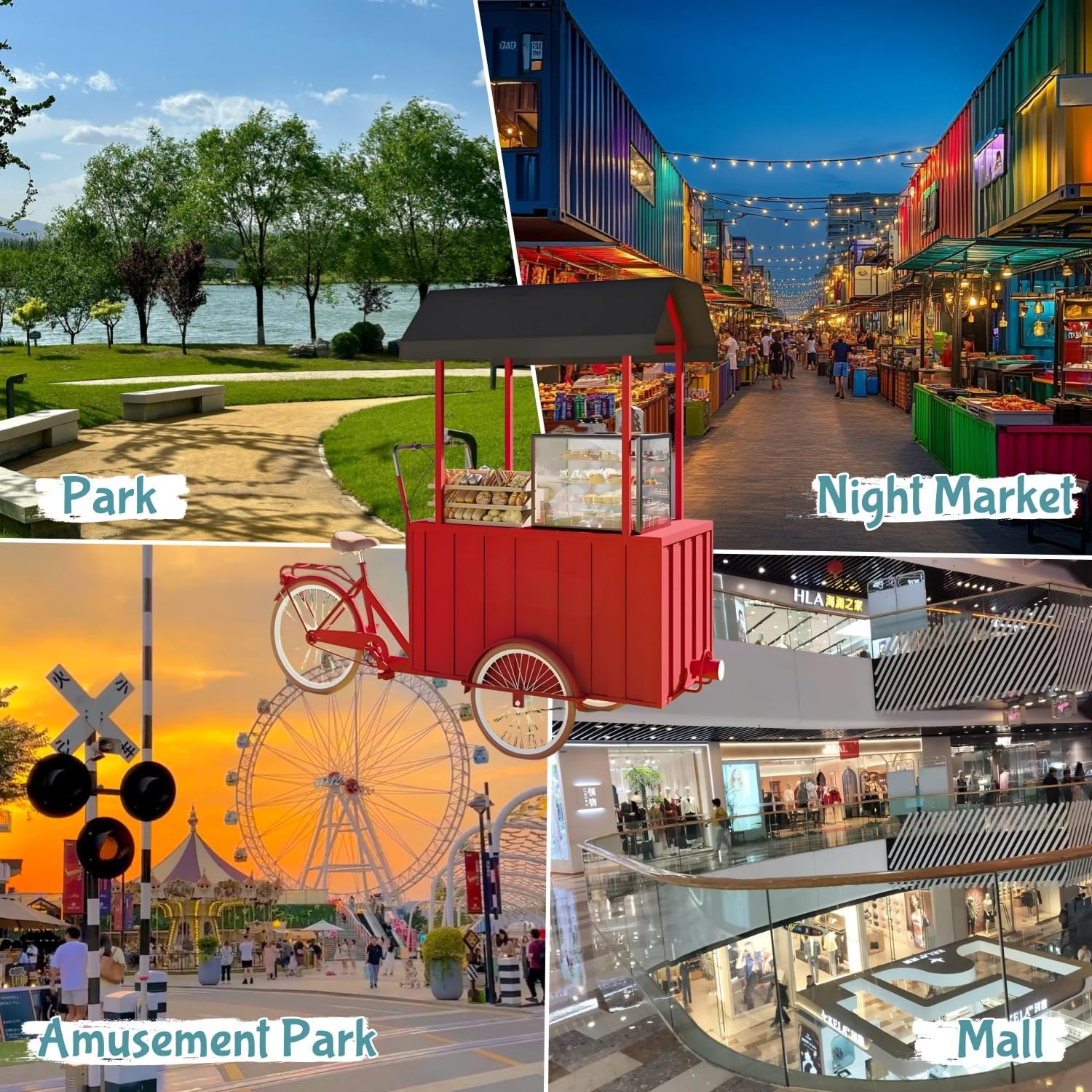Materiali di alta qualità: questo grande carrello per bicicletta è realizzato con materiali di alta qualità e rigorosamente controllati. I suoi pontoni in ferro sono resistenti ai graffi e all'usura e offrono una forte capacità di carico. Design del movimento inverso: questo distributore automatico a tre ruote presenta un design unico del movimento inverso. Sia in posizione fissa che in movimento, offre un'esperienza di guida flessibile e senza sforzo. Stand promozionale multifunzione: questo carrello per biciclette è dotato di un'ampia superficie di ristorazione pieghevole e regolabile in modo continuo, attirando così i clienti e migliorando l'efficacia promozionale del tuo stand. Facile montaggio: il design complessivo del carrello per biciclette è semplice ed elegante e il suo assemblaggio è semplice e non richiede competenze particolari. Si piega facilmente per lo stoccaggio e il trasporto. Adattabile a molteplici scenari: un rimorchio per fiori commerciale può essere utilizzato come bancarella mobile, camion di cibo, esposizione in un centro commerciale o decorazione di un'attrazione turistica, espandendo la tua attività di vendita al dettaglio.