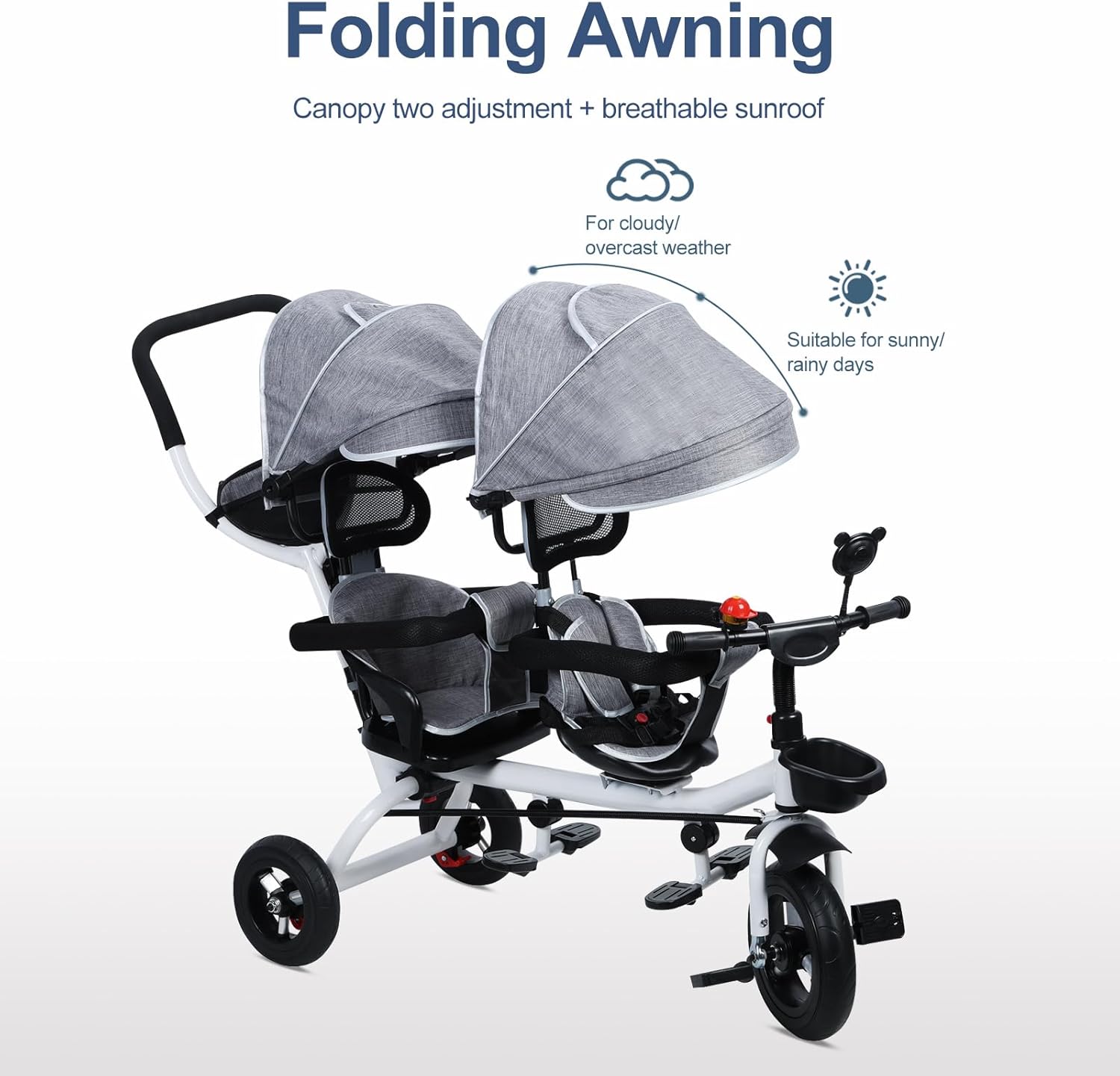 Triciclo tandem con tettuccio parasole e barra di spinta Questo triciclo tandem combina una pratica protezione solare con una barra di spinta regolabile in altezza. Ideale per pedalare insieme ai genitori, sia all'aperto nel parco che nel parco giochi. Stabilità grazie alla struttura del telaio triangolare e ai pneumatici antiscivolo La struttura del telaio triangolare offre ulteriore stabilità e protegge dal ribaltamento. Le grandi ruote in gomma completamente chiuse sono antiscivolo e proteggono i piedi dei bambini da lesioni, ideali per viaggi sicuri. Robusto telaio in acciaio e meccanismo di piegatura durevole Realizzato in robusto acciaio al carbonio con una superficie antiruggine, questo triciclo pieghevole non solo offre stabilità, ma si piega anche facilmente, ideale per il trasporto e lo stoccaggio salvaspazio. Comodo e regolabile in altezza per 2-8 anni Con una larghezza di 50 cm e una lunghezza di 98 cm, questo triciclo a due posti offre spazio sufficiente per fratelli o amici. Il design regolabile in altezza accompagna i bambini dai 2 agli 8 anni durante la fase di crescita. Versatile per la famiglia e la scuola Dai giochi quotidiani alle escursioni, questo triciclo per bambini è adatto al parco giochi, all'asilo e alla zona casa. Perfetto come regalo di compleanno, Natale o scuola: sostenibile e divertente allo stesso tempo.