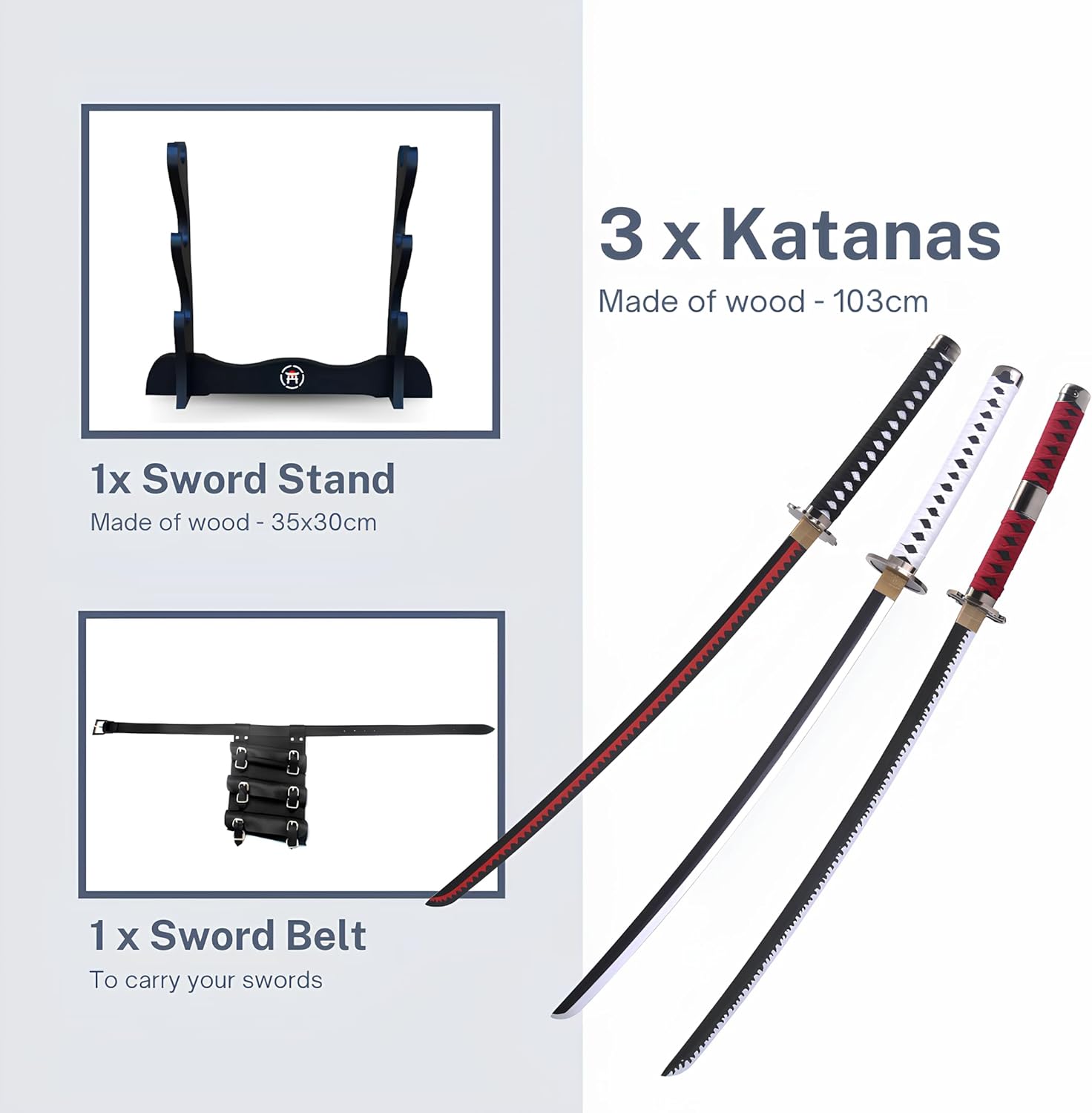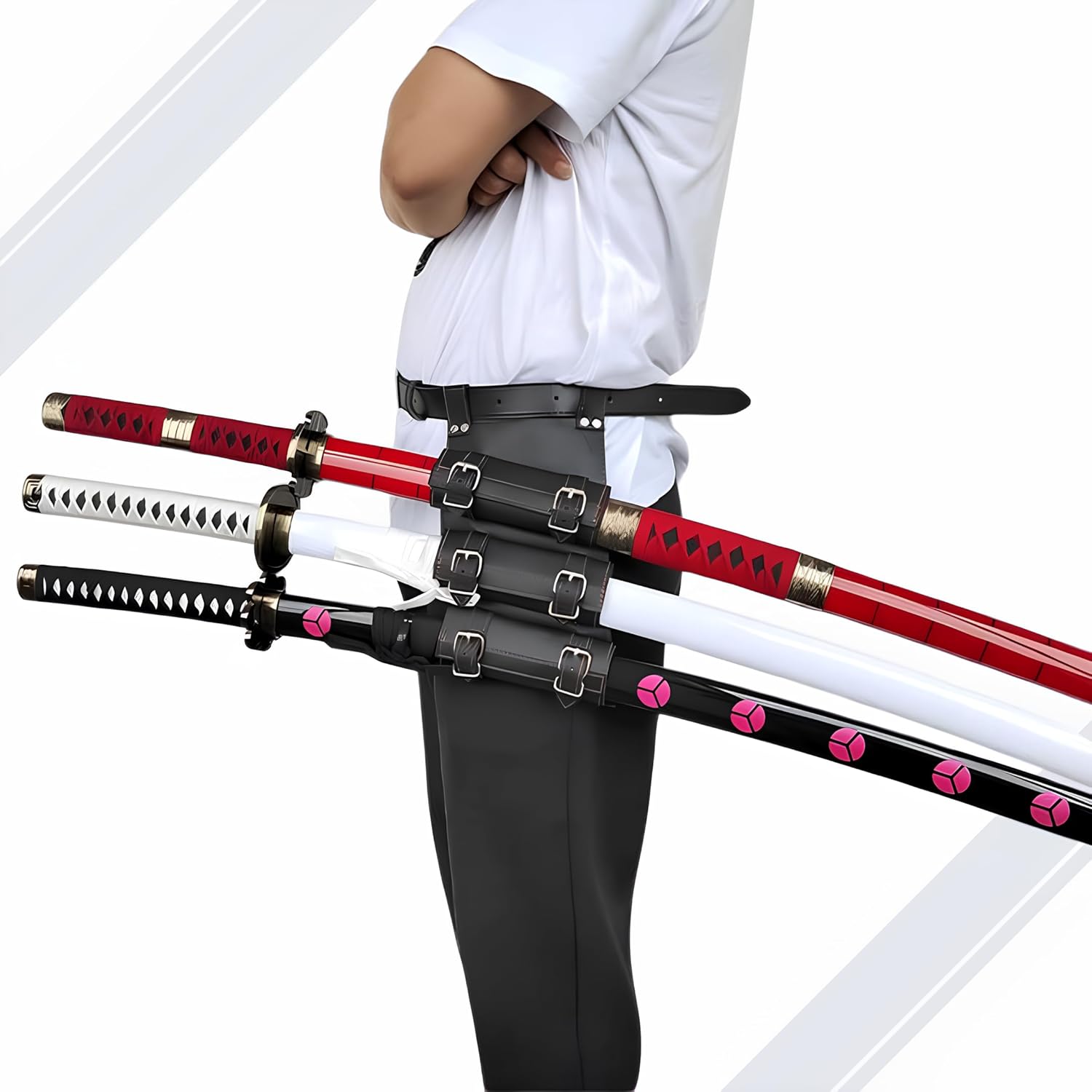 Katana in legno di bambù: le nostre tre katana Hashiman da 103 cm, ispirate a One Piece e Roronoa Zoro, sono accompagnate da un fodero in plastica. Perfetto per cosplay, allenamento o decorazione. Porta spada in legno Include: il nostro kit include un portaspada in legno a tre piani per esporre le tue katana Hashiman con eleganza e sicurezza. Perfetto per evidenziare queste repliche eccezionali. Tripla cintura di Katanas Incluse per un costume autentico: il nostro kit include una cintura che può indossare tre katana di qualità per completare il tuo outfit da samurai. Ideale per adulti appassionati di cultura giapponese. Versatile per allenamento e decorazione: queste grandi lame lunghe sono ideali per l'allenamento a spada non tagliente e ricreato l'universo dei samurai. Accessorio da collezione e replica fedele: aggiungi i nostri katana Hashiman alla tua collezione di accessori giapponesi o usali come repliche fedeli per gli appassionati di manga e anime. Robusto espositore in legno a tre piani: il nostro espositore in legno solido è perfetto per evidenziare le vostre repliche di katana Hashiman, che si tratti di una figurina, un travestimento o una decorazione.