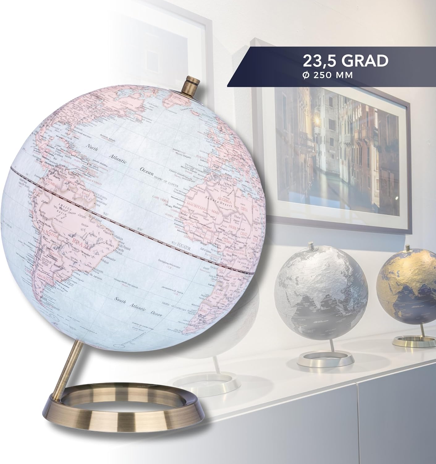 TROIKA Original Globo 23,5 gradi con 25 cm di diametro con una dimensione totale di 25 x 25 x 31 cm e 795 g. Mappamondo da tavolo di alta qualità girevole su un robusto supporto in metallo. Rivestito in feltro per proteggere le superfici dei mobili. Mappamondo bicolore opaco con una pendenza di 23,5 gradi, superfici di terra beige e mari azzurri, inscritta in inglese, con continenti, paesi, oceani, zone geografiche e città importanti. Funzione e design con questo globo. Come elegante design della stanza, sia sulla scrivania, sullo scaffale o sulla credenza. Con i suoi dettagli realistici e la lavorazione di alta qualità, il globo è un elemento decorativo e uno strumento educativo per menti curiose. Confezionato in confezione regalo di alta qualità, il mini lobus è ideale da regalare a partner, colleghi di lavoro, familiari, compagni di viaggio e amici curiosi e attenti allo stile. Collezione TROIKA design GLOBEN – Regala al mondo una casa! La nuova collezione Troika di design Globen offre eleganti combinazioni di colori, piedini eleganti, sospensioni variabili e angoli di rotazione, elemento tattile e funzioni di illuminazione. Sono gioielli e strumenti per viaggiatori, esploratori del mondo e appassionati di storia. Aiutano nella pianificazione del viaggio e nel monitoraggio di eventi storici e sono punti salienti estetici in spazi residenziali e di lavoro. Le varianti dei globi vanno dai mini lobi ai globi da tavolo, globi da terra, globi di luce ai globi dei bambini con illustrazioni di animali ricche di dettagli. Per ogni stanza c'è un globo adatto. Trova la visione molto speciale del mondo! Regalo di gioia: TROIKA è sinonimo di trasformazione delle tendenze attuali in prodotti ben studiati. Siamo esperti dell'arte di dare gioia e abbiamo scelto con cura ogni regalo. Quindi, se siete alla ricerca di un regalo per l'uomo che ha già tutto, per la donna d'affari di oggi o qualcosa che possa dare alla vostra casa o ufficio un look personale, i nostri eleganti prezzi di design sono la prima scelta.