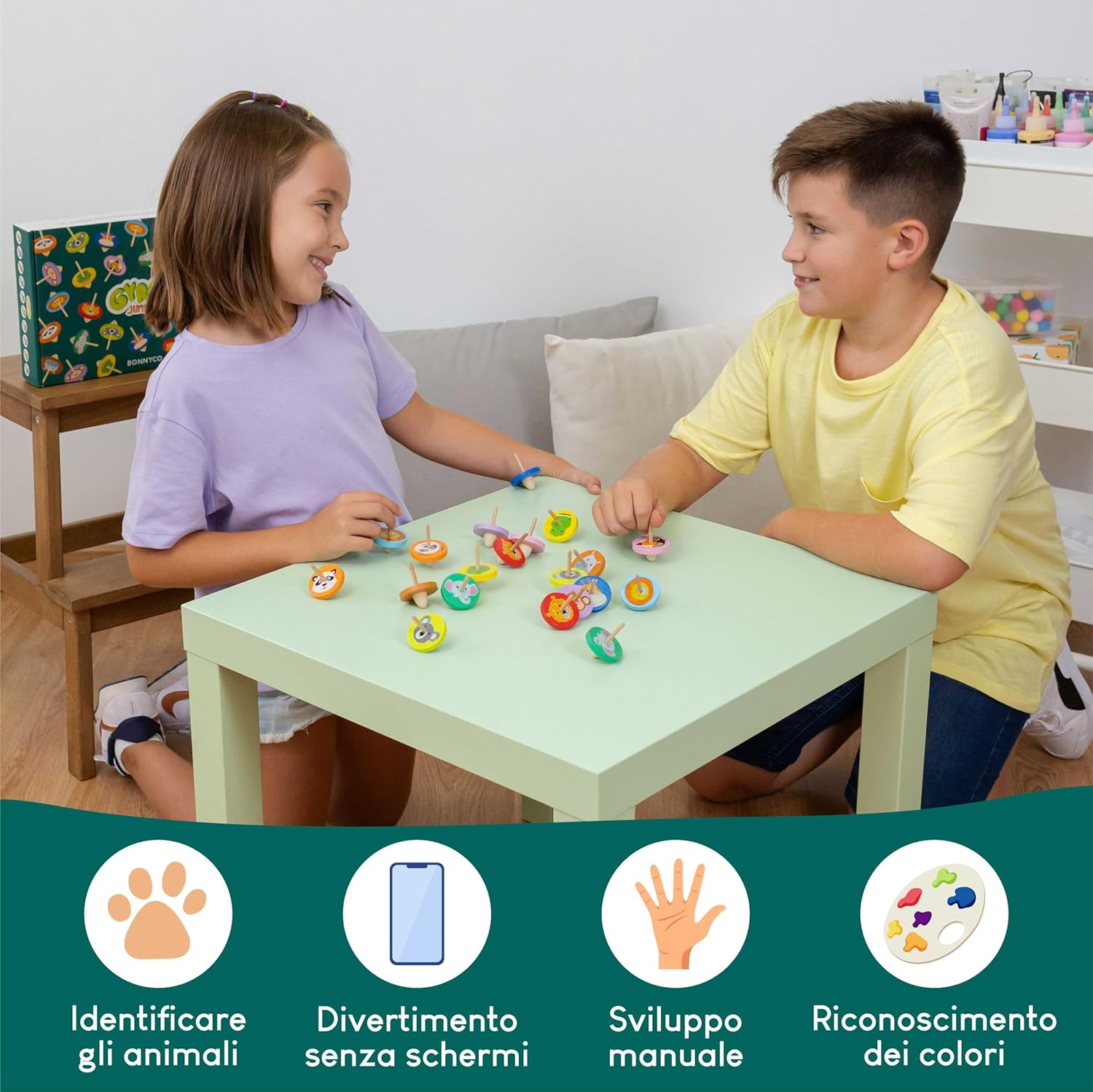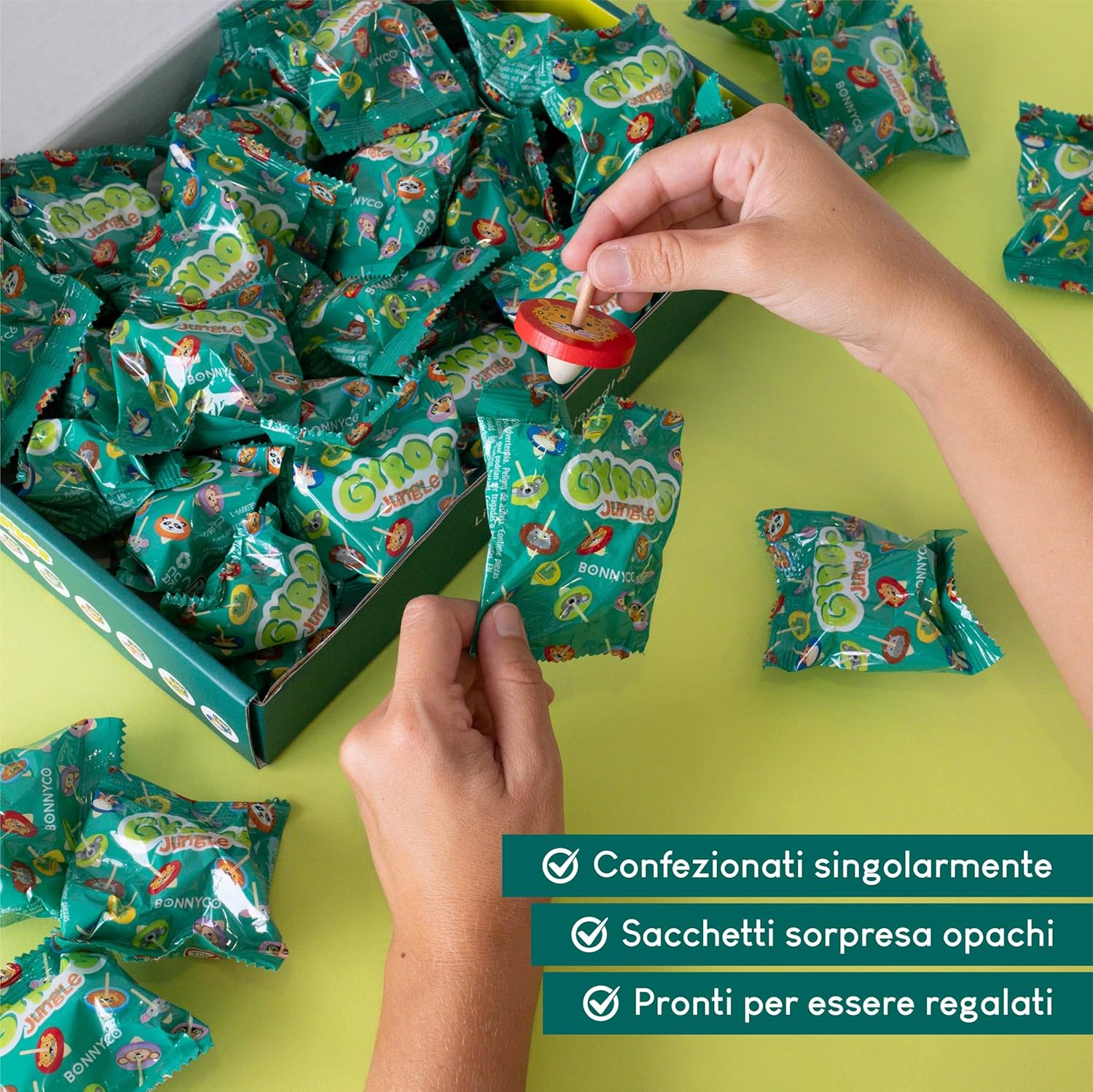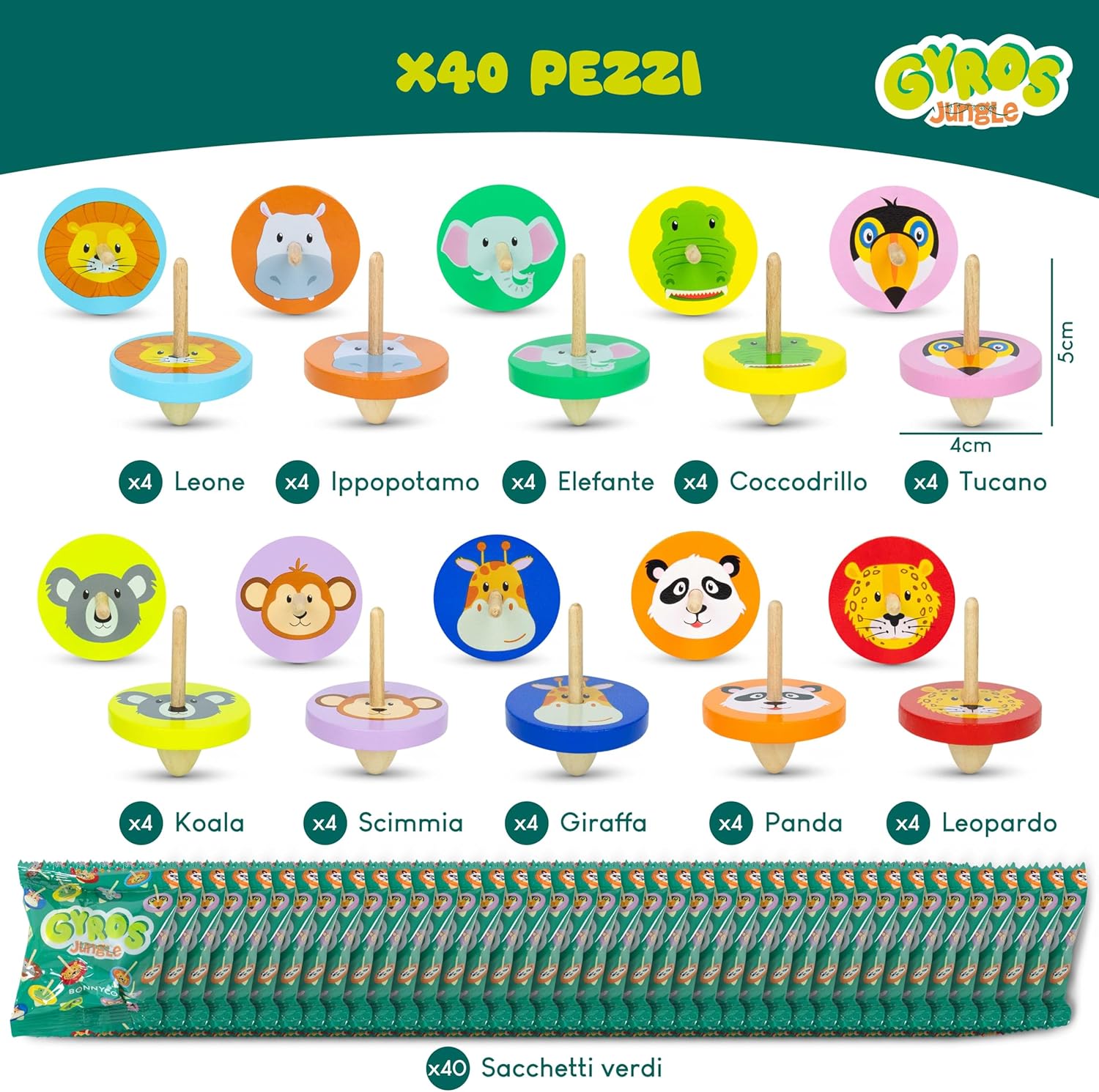 🦁 PACCHETTO DI 40 TROTTOLE IN LEGNO COME GADGET COMPLEANNO BAMBINI 🦁 Pacco di 40 trottola bambini in sacchetti individuali, perfette come regalini fine festa compleanno. Con vari colori e disegni di animali della giungla: leone, ippopotamo, elefante, coccodrillo, tucano, koala, scimmia, giraffa, panda e leopardo. Ogni trottola bambini misura 4 cm di diametro e 5 cm di altezza. Perfette per regalini compleanno bambini invitati 🐊 REGALINI FINE FESTA COMPLEANNO PRE-RIEMPITI 🐊 Vengono fornite in sacchetti individuali già preparati per essere regalati come regalino fine festa compleanno. I sacchetti sono opachi, quindi saranno un pacchetto sorpresa per festa compleanno. Ciascuno dei 10 animali della giungla è ripetuto 4 volte. Scoprire quale riceveranno sarà super emozionante! Il divertimento è garantito con questi gadget festa compleanno bambini 🐨 GADGET BAMBINI PER FESTE DI COMPLEANNO 🐨 Questi giochi in legno sono perfetti come pensierini compleanno bambini, giochi bambina i bambino, riempitivi per calendari dell'Avvento, pignatta compleanno bambino i bambina, bomboniere comunione bambino, gadget matrimonio per invitati, uova di Pasqua, regalo per alunni fine anno e gadget scuola, premi per bambini, riempitivi gadget natale per bambini e altri eventi 🐼 PENSIERINI PER BAMBINI DOPO FESTA DI ALTA QUALITÀ 🐼 Ogni trottola bambini è realizzato con materiali attentamente selezionati. Sono resistenti, privi di schegge e hanno punte arrotondate. Lanciate la trottola con il dito indice e il pollice su una superficie piana per farla girare. Vedrete l'effetto giroscopico che l'animale crea con il suo movimento. È ipnotico! Fantastici pensierini dopo festa bambini e regali compleanno bambini gadget 🦒 TROTTOLA LEGNO SENZA SCHERMO 🦒 Le loro dimensioni compatte da mini giochi regalini fine festa le rendono facili da portare ovunque per intrattenimento durante i momenti di noia. La trottola bambini è un'ottima alternativa ai telefoni cellulari e agli schermi. Sono anche molto divertenti da usare con amici e famiglia. Quale trottola girerà più a lungo? Economici gadget compleanno bambino, regali fine festa compleanno bambina 🐒 SVILUPPO DELLE COMPETENZE E DELLE CAPACITÀ 🐒 Questi riempitivi per regali fine festa compleanno bambino e bambina, offriranno molti momenti di divertimento e apprendimento. Possono essere organizzati giochi per bambini educativi come caccia al tesoro. I bambini si divertiranno molto sviluppando le loro abilità motorie fini, la coordinazione occhio-mano e la destrezza manuale con questo fidget toy pack 🐘 GIOCATTOLI INOFFENSIVI CON CERTIFICATI 🐘 Questo pacchetto di trottole per bambini ha superato le certificazioni pertinenti ed è sicuro per i bambini di età superiore ai 3 anni. Trottole legno per regalini festa compleanno bambini realizzate in legno di gomma. Con questi regali festa compleanno bambini gadget, avranno ore di divertimento sicuro e tranquillità