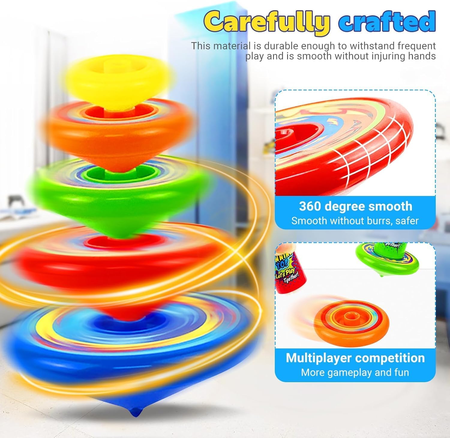 DIVERTIMENTO VIBRANTE CON LE TROPPE: aumenta il tempo di gioco con 3 set (15 pezzi) di trottole colorate! Impilale in un imponente caleidoscopio o divertiti singolarmente per un divertimento senza fine. MECCANISMO DI ROTAZIONE FACILE: trova semplicemente una superficie piana, attacca la trottola, avvolgila tre volte e premi per farla partire. Queste trottole ruotano in modo ipnotico. DUREVOLI E SICURI: realizzati in plastica, questi giocattoli rotanti sono costruiti per durare e garantire un gioco sicuro, resistendo a ore di divertimento. È un modo divertente ed efficace per i bambini di concentrare l'attenzione, migliorare la coordinazione, alleviare lo stress e l'ansia. ESSENZIALE PERFETTO PER LE FESTE: ideali come bomboniere, sacchetti regalo o premi, queste trottole rendono divertente qualsiasi riunione. BOMBONIERE IDEALI PER LE FESTE: questo set di trottole è abbondante in quantità e di qualità affidabile, è un'ottima scelta per le tue feste a tema, come feste di compleanno, feste di carnevale scolastiche, ecc.; possono anche essere utilizzate come riempitivi per compleanni, cestini pasquali, riempitivi per sacchetti regalo, premi, regali per feste, ecc.