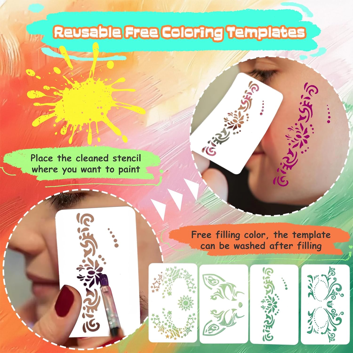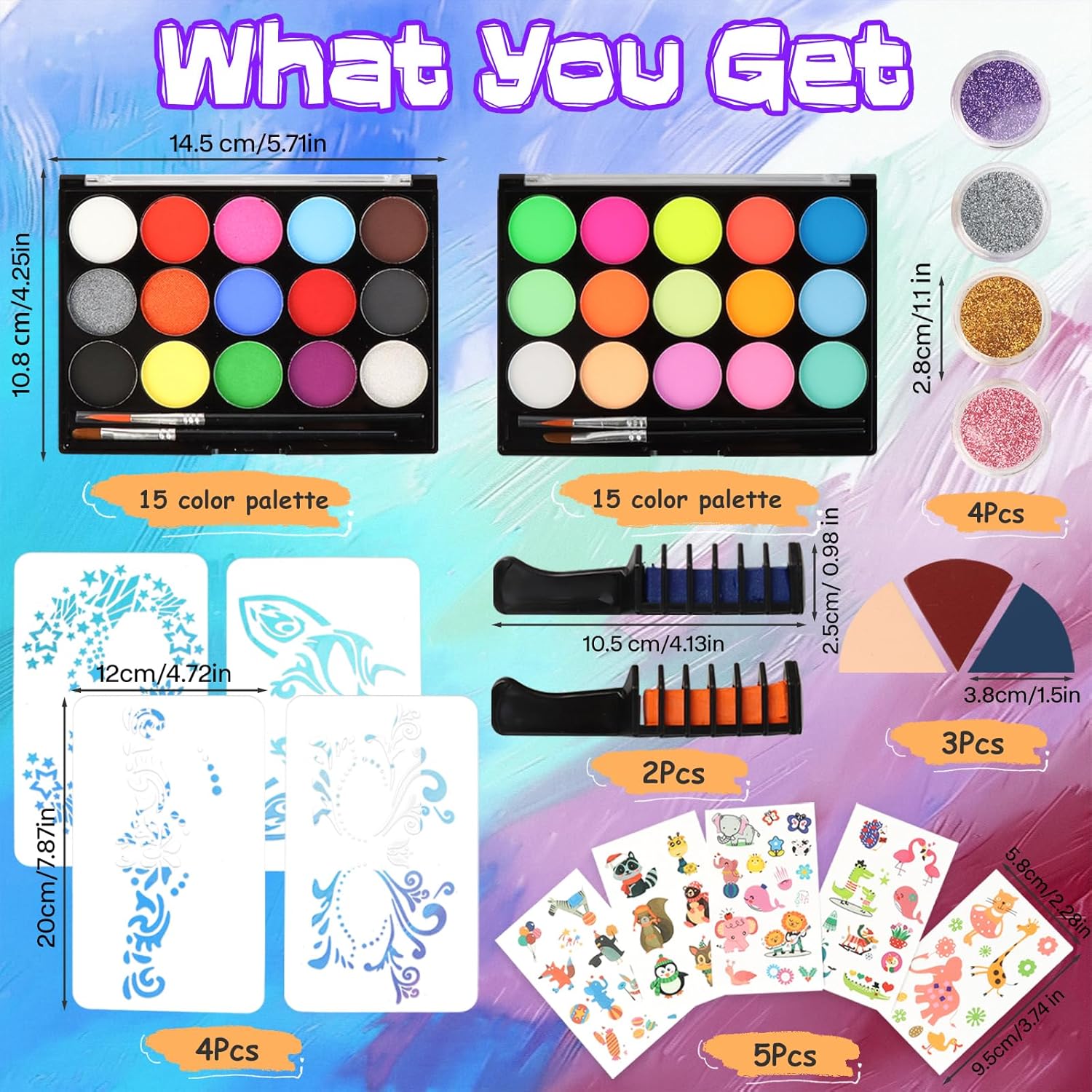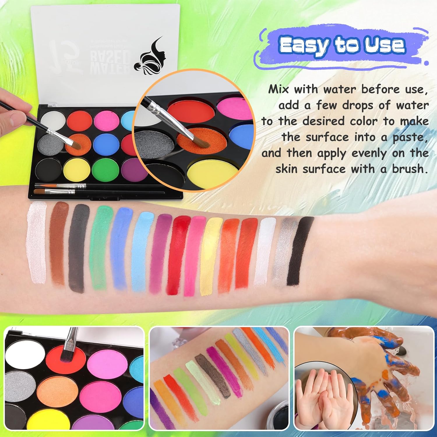 👑【Sicuro da Usare】Questo set per il face painting è adatto a bambini e adulti. Materiale ipoallergenico, atossico e delicato, non provoca prurito o irritazione cutanea. Nota: effettuare prima un test. In caso di irritazione, interrompere l'uso. 👑【Facile da Applicare e Pulire】La pittura per il viso è completamente a base d'acqua. Prima dell'uso, mescolarlo con acqua, aggiungere qualche goccia d'acqua al colore desiderato per trasformare la superficie in una pasta, quindi applicarlo uniformemente sulla superficie della pelle con un pennello. Per lavarli, puoi usare un panno umido o un panno insaponato. 👑【Pagine da Colorare】Offriamo 4 modelli di face painting, adatti ai principianti che vogliono dipingere diversi motivi sui volti degli altri. Possono essere fantasiosi e creativi e soddisfare i requisiti per realizzare vari dipinti sul viso o sul corpo. 👑【Utilizzo Versatile】Questo set per il trucco del viso è perfetto per tutti gli eventi di trucco come Halloween, feste di compleanno, balli in maschera, Natale, lezioni di trucco, pittura per festival, ecc. Un fantastico regalo per bambini e adulti. 👑【Set di Pittura per il Viso a Base D'acqua】Include 2 pitture per il viso in 15 colori (fluorescenti e opache), 2 pettini per lo styling, 3 piumini da cipria triangolari, 4 stencil per pittura per il viso, 5 adesivi per tatuaggi luminosi, 4 glitter, un set completo per le tue esigenze di trucco.