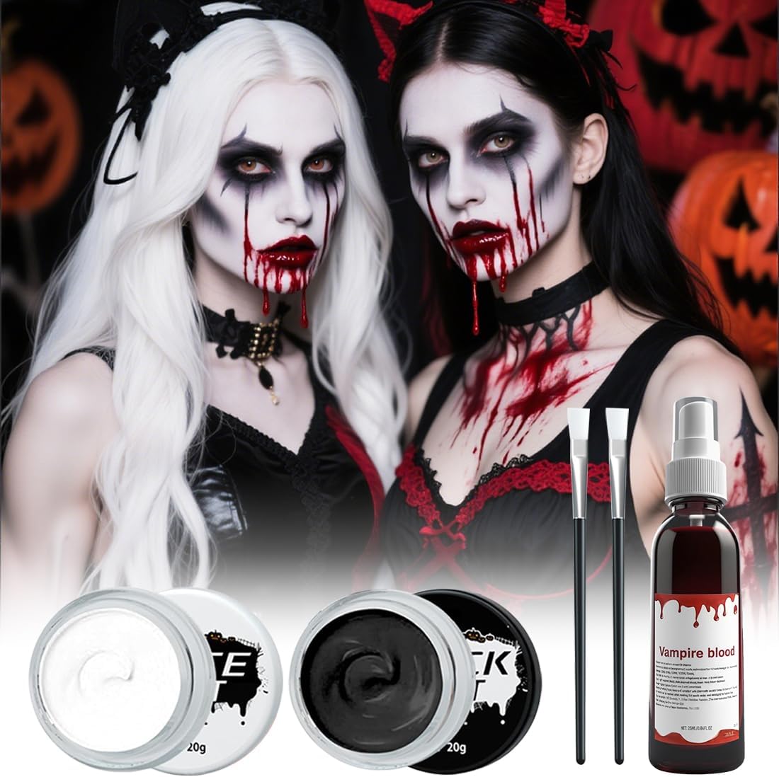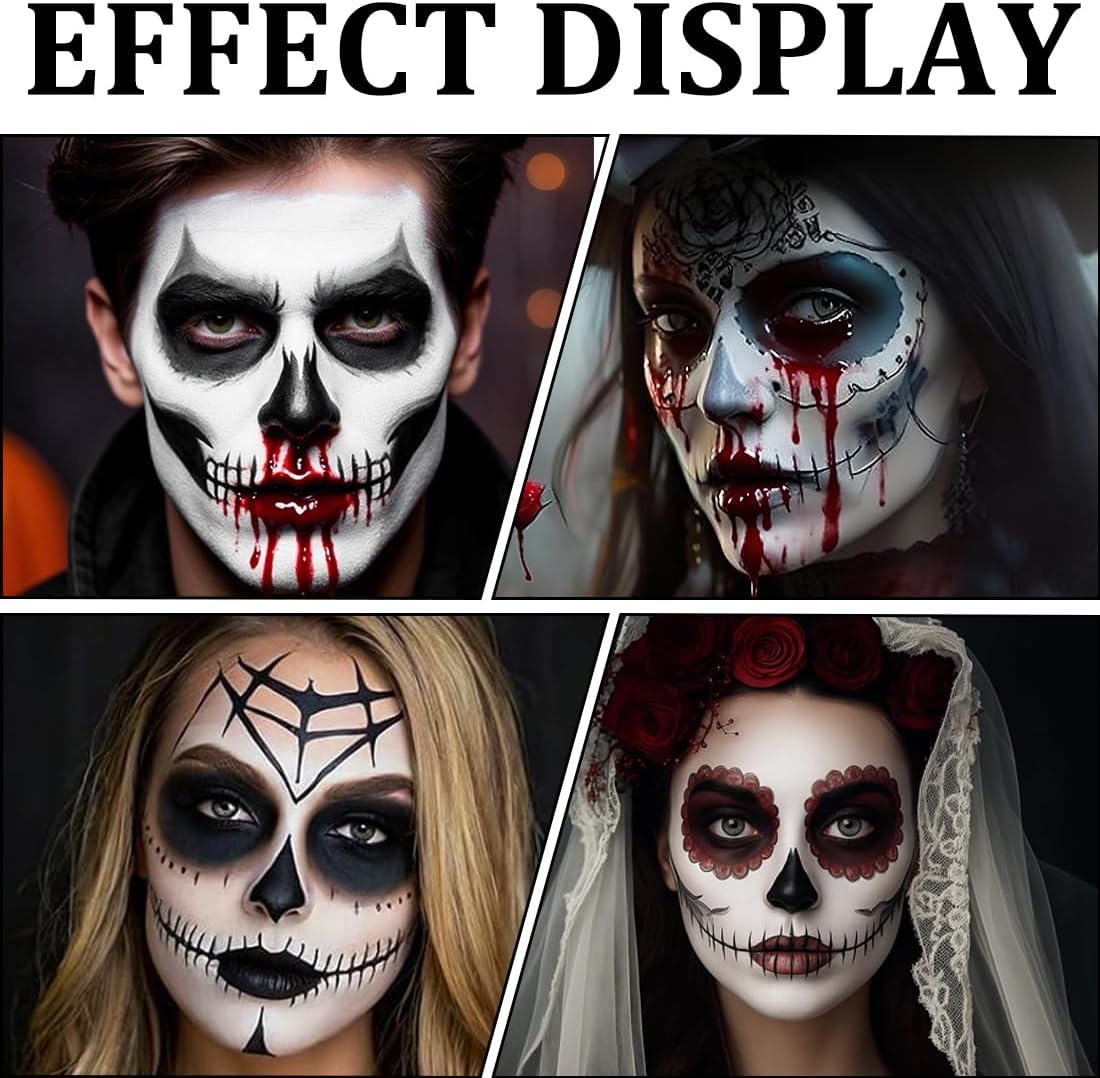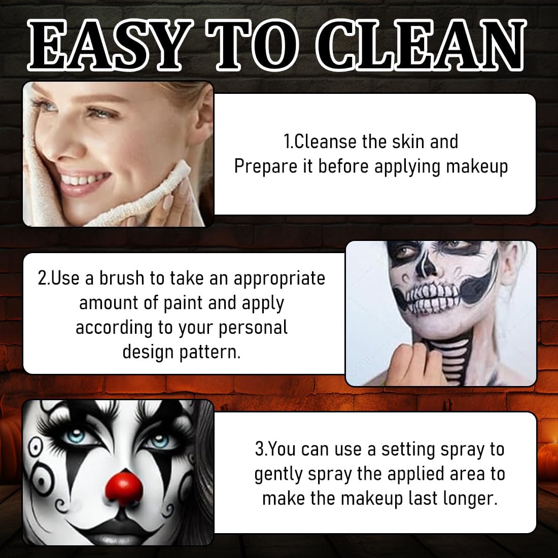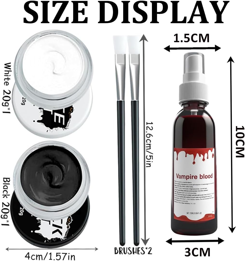 SET PER IL TRUCCO PER HALLOWEEN: il nostro Trucchi Halloween contiene 2 colori nero, bianco, Ci sono 2 penne e 1 flacone da 25 g di sangue finto, il set di trucco per Halloween può essere utilizzato direttamente o miscelato con altri colori, perfetto per la pittura del corpo e del viso. CONFORTEVOLE E DELICATO SULLA PELLE: adatto per bambini e adulti di tutti i tipi di pelle. Questo Trucchi Bianco e Nero per Viso Halloween è realizzato con materie prime sicure di alta qualità e ha una consistenza morbida e delicata che copre facilmente tutto il viso. Prima dell'uso, si raccomanda un test allergico dietro l'orecchio. TRUCCO REALISTICO HORROR: classico trucco per Halloween in bianco e nero e sangue artificiale, con il nostro set per il trucco da vampiro di Halloween è possibile creare effetti horror e trucco realistico. Avrai il trucco più spaventoso della festa. FACILE DA APPLICARE E PULIRE: il Trucchi Bianco e Nero per Viso Halloween è molto facile da applicare e rimuovere. Usa un pennello o una spugna con un po 'd'acqua per truccare il viso e il corpo. Pulisci il trucco con uno struccante e poi sciacqualo dopo aver pulito il viso con un detergente. ADATTO A MOLTE OCCASIONI: Il Trucchi Bianco e Nero per Viso Halloween è perfetto per diverse situazioni, come feste in maschera, celebrazioni di Halloween, spettacoli teatrali, eventi scolastici o dell’asilo. È l’ideale per feste a tema, cosplay, feste di compleanno, rappresentazioni teatrali e molto altro! Trasformati in un vampiro, uno zombie, un clown o un mostro, lasciando libera la tua fantasia.
