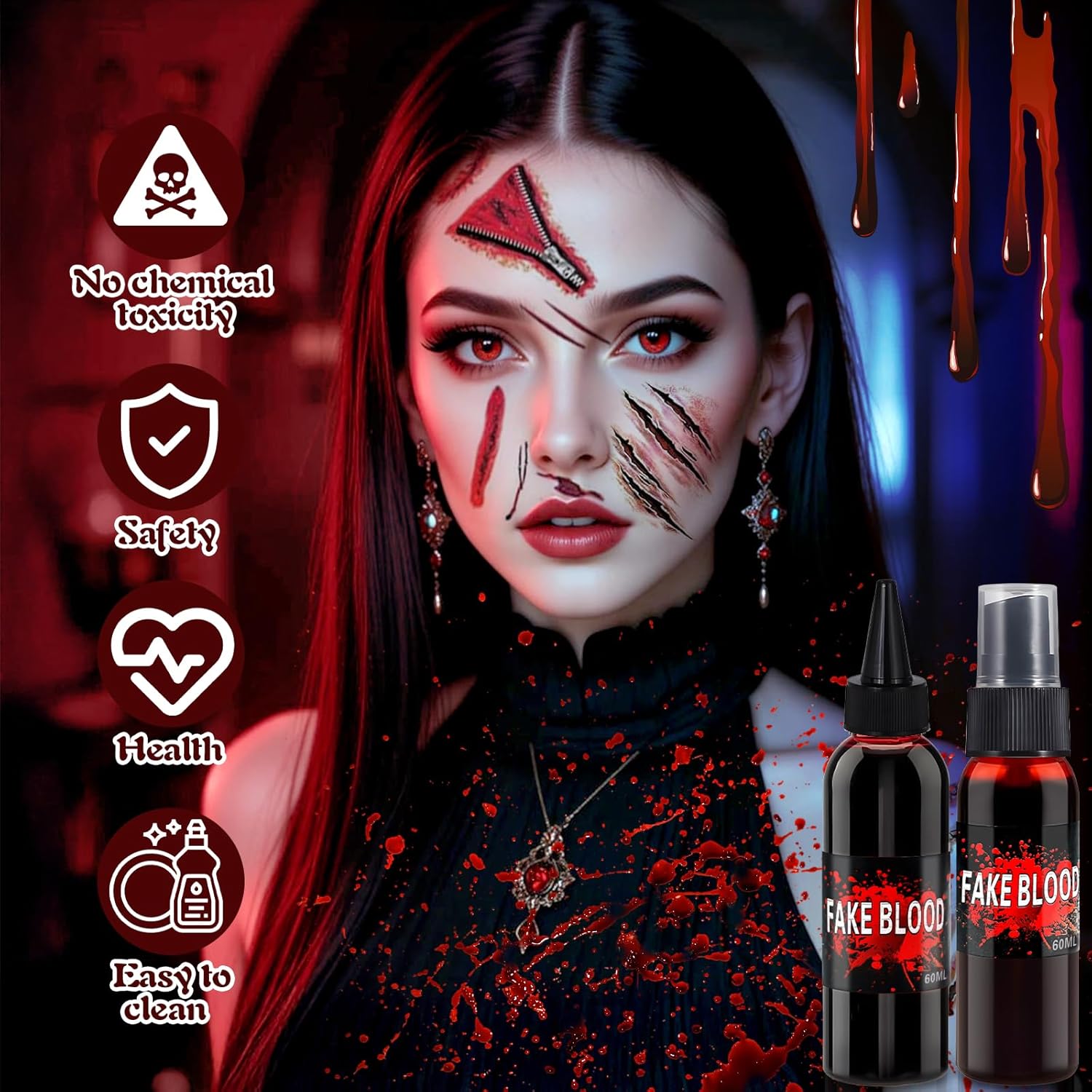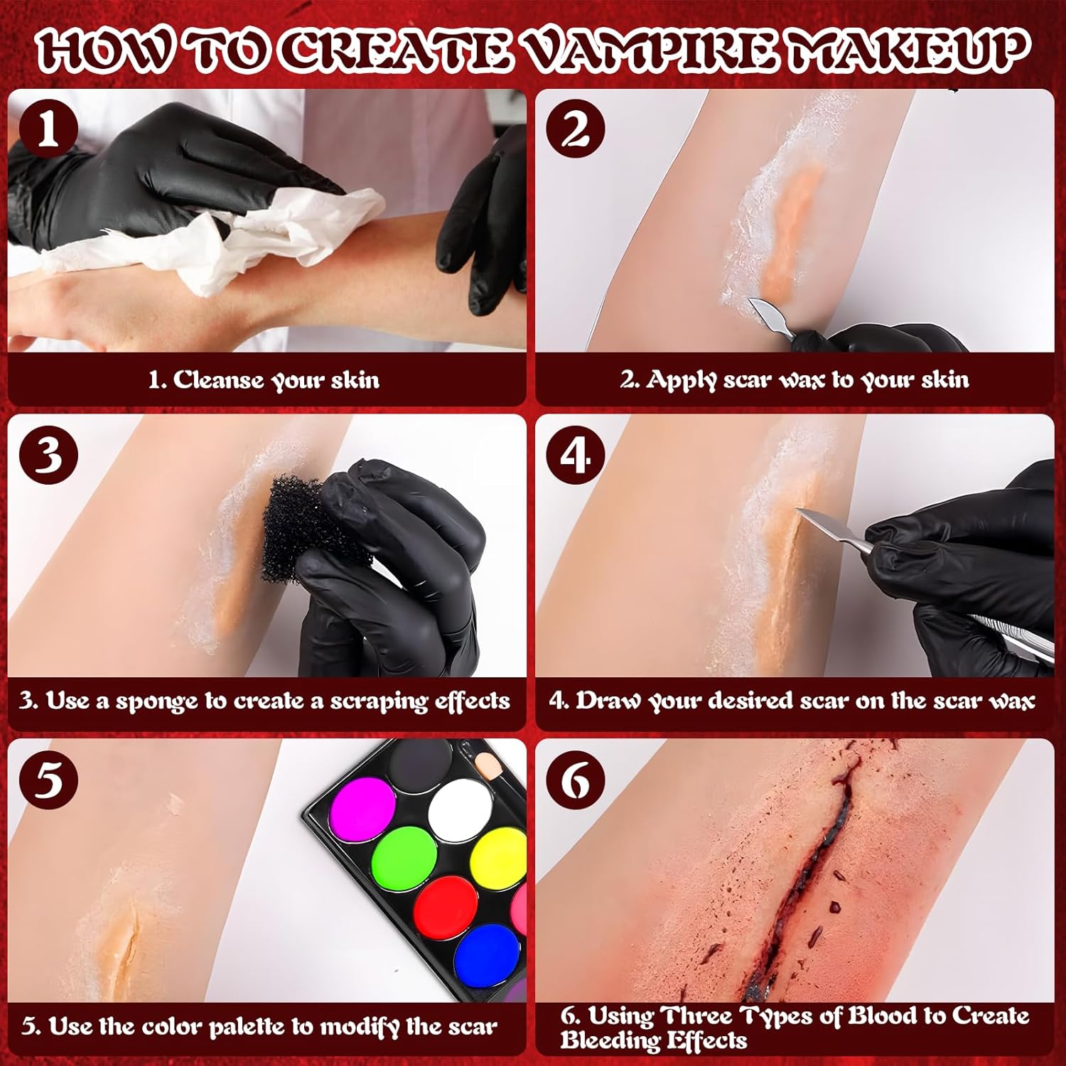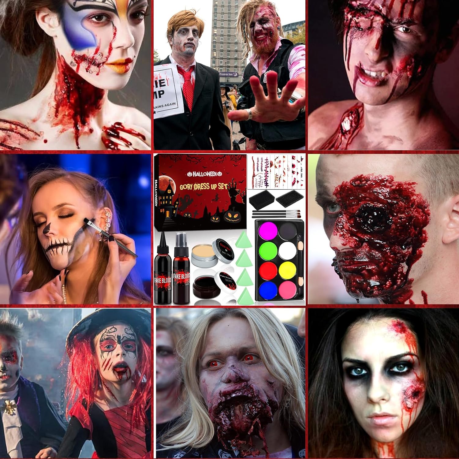 🎃 [Set di Halloween] Halloween sangue finto set contiene 1×30 ml plasma, 1×60ml sangue finto fresco, 1×60ml sangue finto spray, 1×30 g cera per la pelle, 2x spugna, 3×pennelli, 4×piumini da cipria, 30×adesivi per tatuaggi, 1×Palette da 8 colori. Crea il trucco di Halloween più spaventoso e realistico utilizzando il nostro set! 🩸 [Effetti Realistici] Set trucco per halloween ti aiuta a creare facilmente cicatrici, graffi, lividi, bruciature, squarci, morsi, tagli o ferite e altro ancora. Il sangue spray rende l'area della ferita più realistica e la cera per cicatrici aiuta a modellare la pelle intorno alla ferita, questo set di trucco con lividi di sangue ti consente di creare un'atmosfera convincente e terrificante per Halloween o effetti speciali di trucco. 🌟 [Sicurezza Degli Ingredienti] Il nostro sangue finto di halloween è realizzato con materiali atossici, delicati e non irritanti per la pelle, adatti sia ad adulti che a bambini. Sono inoltre facilmente lavabili con acqua e non macchiano indumenti o oggetti di scena.Per il primo utilizzo si consiglia di effettuare un test di sensibilità sulla pelle dietro l'orecchio. 👹 [Facile da usare] Questo set professionale di sangue finto make up è facile da usare e adatto a principianti e truccatori professionisti. Detergi la pelle prima dell'uso, applica la cera per cicatrici e delinea la cicatrice. Quindi usa una spugna e una palette per modificare la cicatrice. Infine, applica del sangue finto intorno alla ferita. La tua orribile ferita è completa. 🎁 [Ampiamente Usato] Il trucchi viso halloween non è adatto solo per le feste di Halloween, ma anche per cosplay, feste, clown, carnevali, festival, performance sul palco, giochi di ruolo o qualsiasi arte del trucco del corpo. Lascia correre la tua immaginazione e crea look indimenticabili.