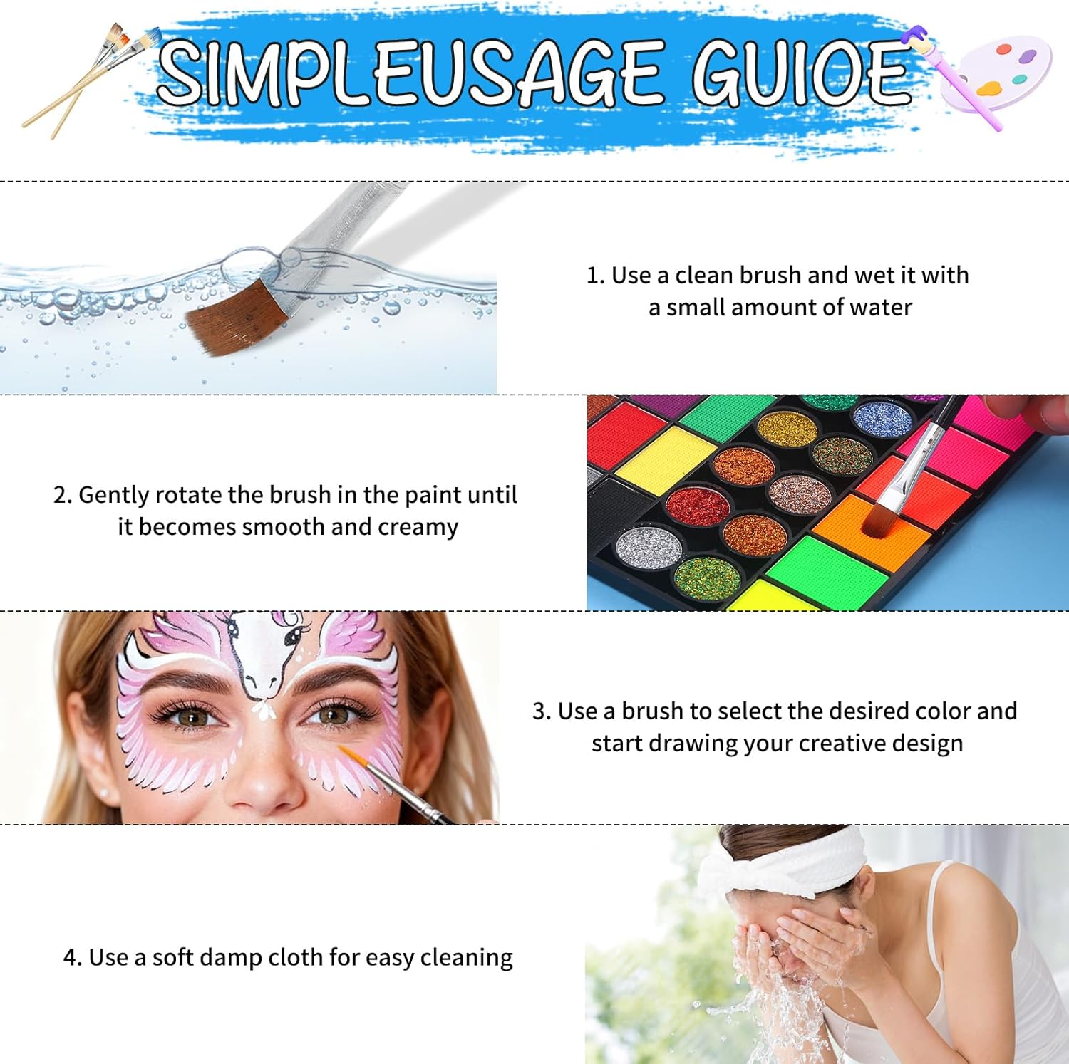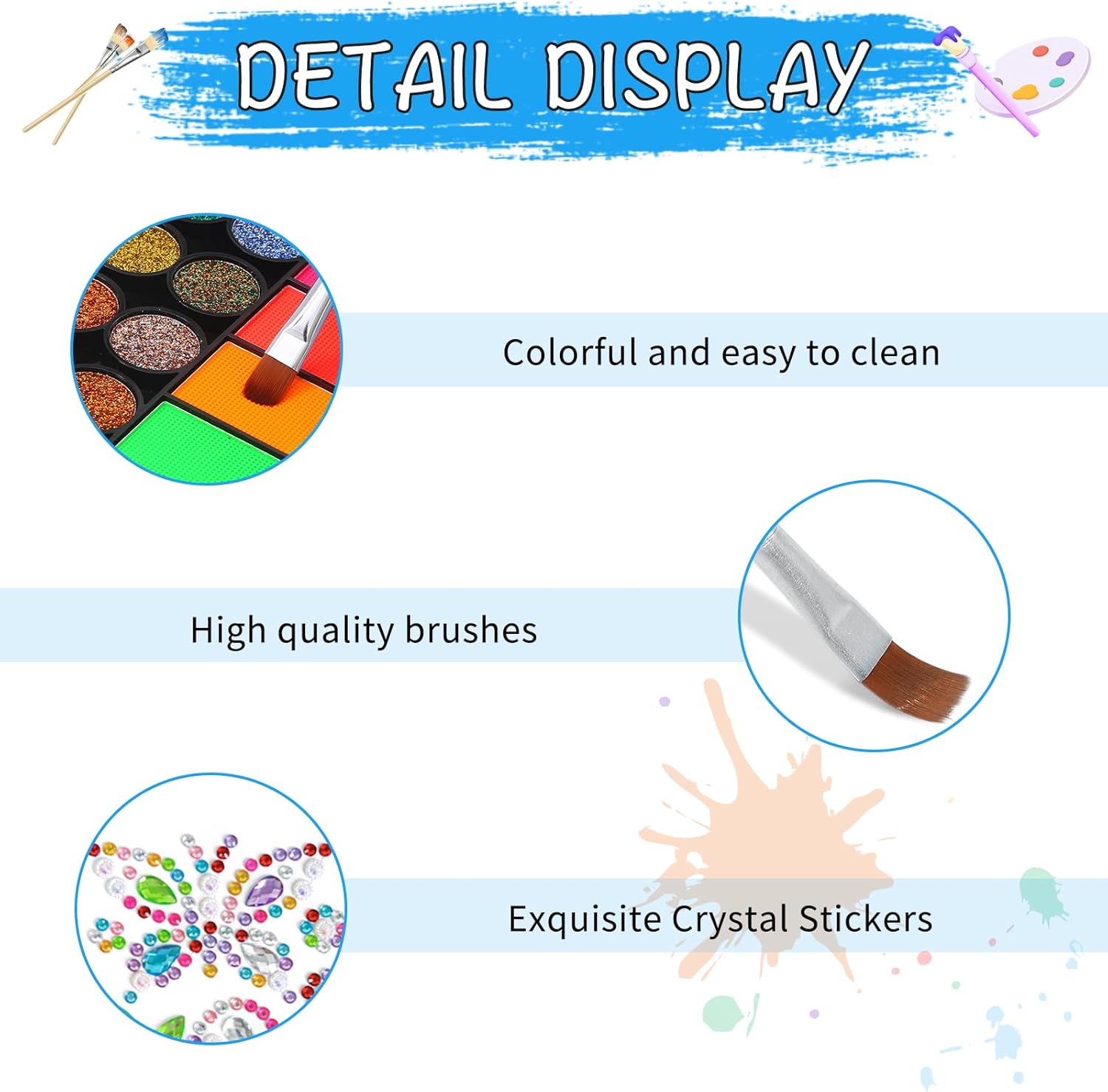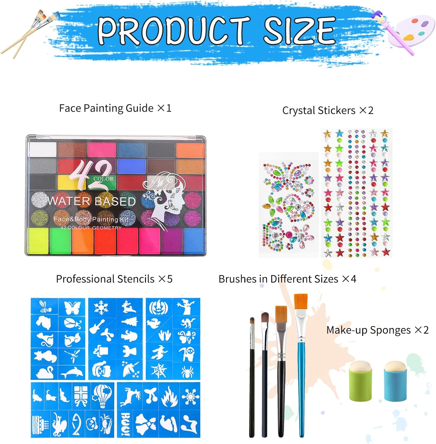 Set Trucco di Halloween: Set di trucchi per Halloween con 42 colori per il trucco del viso, 4 pennelli, 5 modelli per il trucco del viso, 2 spugne e 2 adesivi di cristallo. Offre un'ampia varietà di colori per look creativi. I modelli per il trucco del viso aiutano i bambini a sviluppare la loro immaginazione illimitata e le loro abilità con i colori. Regala gioia con questo set di trucchi per bambini Materiali di alta Qualità: Gli ingredienti sono atossici, ipoallergenici e senza profumo. Adatto a bambini e adulti con pelle sensibile. Per evitare potenziali disagi, si consiglia di effettuare un test allergologico prima di utilizzare la tavolozza di colori per il trucco facciale. Se si mescolano due o più colori diversi, si otterrà un colore nuovo Set di Pittura per il viso e il Corpo Lavabile: Questa tavolozza di colori per il trucco facciale contiene 42 colori per il trucco facciale, ed è anche possibile mescolare i colori per crearne di nuovi. Nota: la pomata non si asciuga rapidamente dopo l'uso e potrebbe macchiare il trucco. Per un'asciugatura rapida, si consiglia di utilizzare la polvere prima di applicare la pittura professionale per il viso Facile da Usare e da Pulire: Mescolare con acqua prima dell'uso. Aggiungere qualche goccia d'acqua al colore desiderato per formare una pasta, quindi stenderla uniformemente sulla pelle con un pennello. Il set di pittura per il viso e il corpo lavabile può essere facilmente rimosso con acqua tiepida e sapone o un panno umid Ampiamente Utilizzato: Kit di pittura per il viso e il corpo per un trucco teatrale divertente, trucco di carnevale, spettacoli di pittura per il corpo, trucco di carnevale, trucco da festival e cosplay. Il nostro set di pittura per il viso per bambini renderà ogni evento un'esperienza indimenticabile. Usare il trucco fosforescente sarà un'esperienza divertente