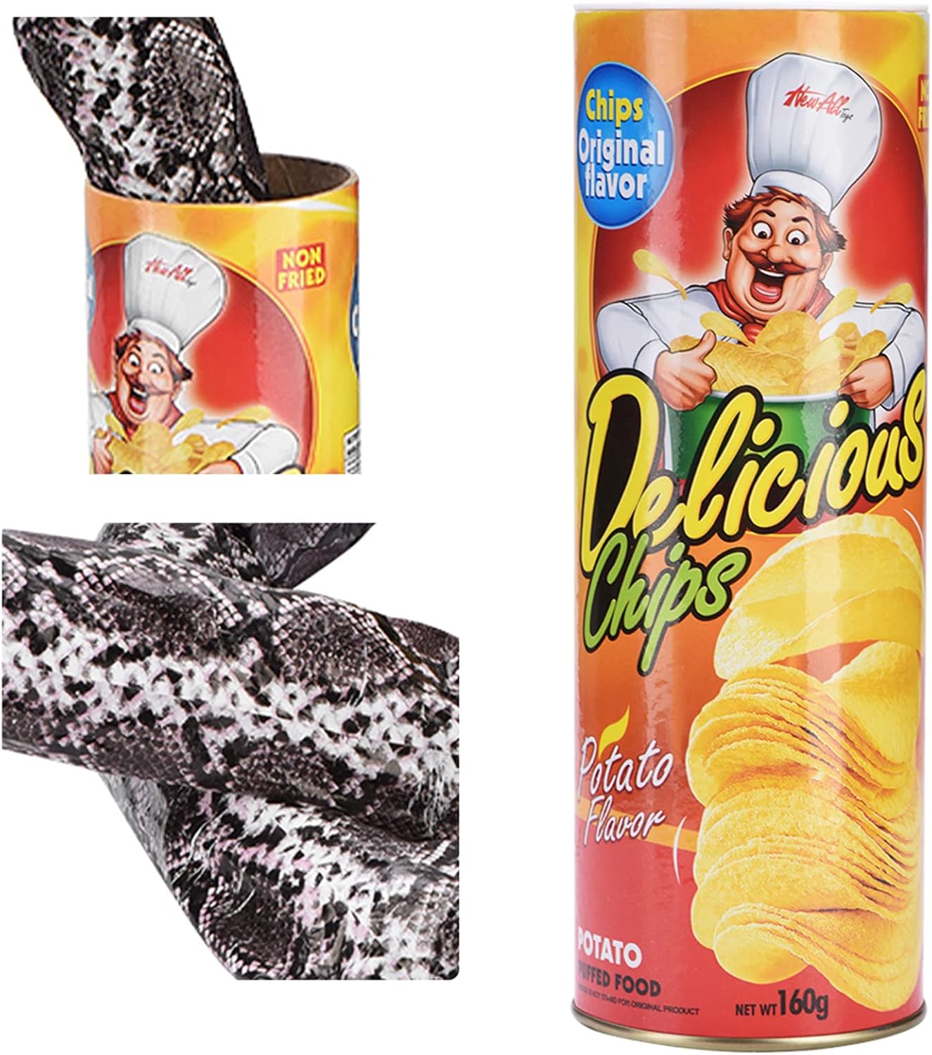 per divertimento, non fare del male o pericolo per le persone Un simpatico gadget per portare infinite gioie Il serpente primaverile uscirà una volta aperto il coperchio, davvero scioccante Adatto per aumentare l'atmosfera alla festa Il chip fotografico realistico può essere imballato, non facile da scoprire