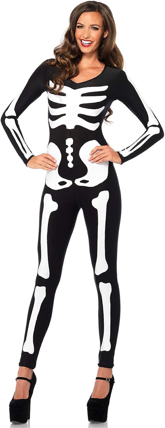 This costume will make you appear slimmer than you actually are...which is great, considering that you're dressing up as a skeleton. I am 5'-8" and 137#. I was conflicted as to ordering the medium or the large. I finally went with the large, because I was concerned that the medium might not be long enough in the leg and arm lengths. (NOTE: I ordered and received a Large, but for some reason it shows on this review as a Medium) This suit has enough length in both the arms and legs for me. It has enough Spandex to be form-fitting without being too revealing in the crotch and rear areas. It is slimming and comfortable. I've purchased some gloves with the bone shape, and will apply some temporary face tattoos to complete the look. I dock one star in the rating because it only has the bones in the front. I also wish that the neckline was higher so that the pattern would show up to the jawline--as it is, I'll have to use body paint to keep all my skin from showing. But I'm very happy with this purchase and am anxious to wear it.