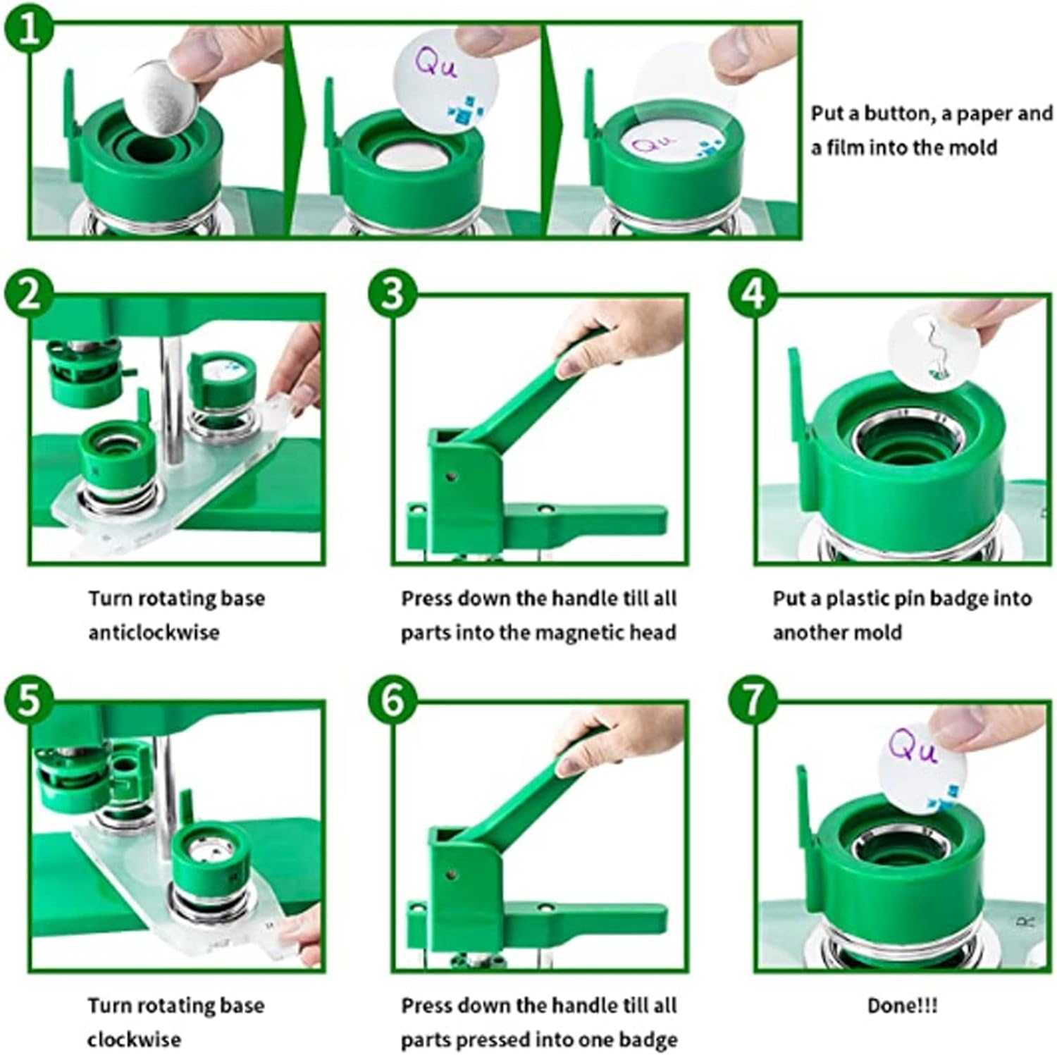 Senza assemblaggio: macchina per la produzione di bottoni in un unico pezzo. Quando ricevi la macchina per la produzione di aghi, puoi iniziare immediatamente a creare bottoni senza assemblare parti complicate della macchina. Risparmia tempo ed energia. Design unico: fai da te 44 mm, una sorta di macchina per la produzione di badge che può realizzare piccoli regali come spille, apriscatole, portachiavi, ecc. Questa macchina utilizza tecnopolimeri ad alta resistenza, il corpo della macchina e lo stampo sono integrati, è leggera, lunga durata e funzionamento facile, sfruttando appieno l'abilità pratica del bambino. Facile da usare: per prima cosa taglia l'immagine alla giusta dimensione con una fustellatrice circolare semplice e facile da usare. In secondo luogo, posizionare a turno la parte anteriore in metallo, l'immagine e il foglio di plastica trasparente nel cubo A; Terzo, reinserire il perno nello stampo B con il perno rivolto verso l'alto; Successivamente, ruota il cubo A direttamente sotto il cubo superiore, premi la maniglia - non passare attraverso i fori; Trasforma l'ultimo regalo speciale: il kit per la creazione di bottoni stesso può essere regalato ai tuoi figli o amici. Allo stesso tempo, i bottoni fai da te realizzati con macchine bottoniere sono particolarmente adatti anche per regali personalizzati. Il kit per la creazione di badge per bottoni fai-da-te include: macchina per badge da 44 mm (1,7 pollici), 100 pezzi di bottoni, taglierina circolare, 12 penne colorate, chiave inglese, custodia protettiva, taglierina e manuale utente.