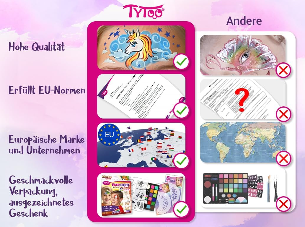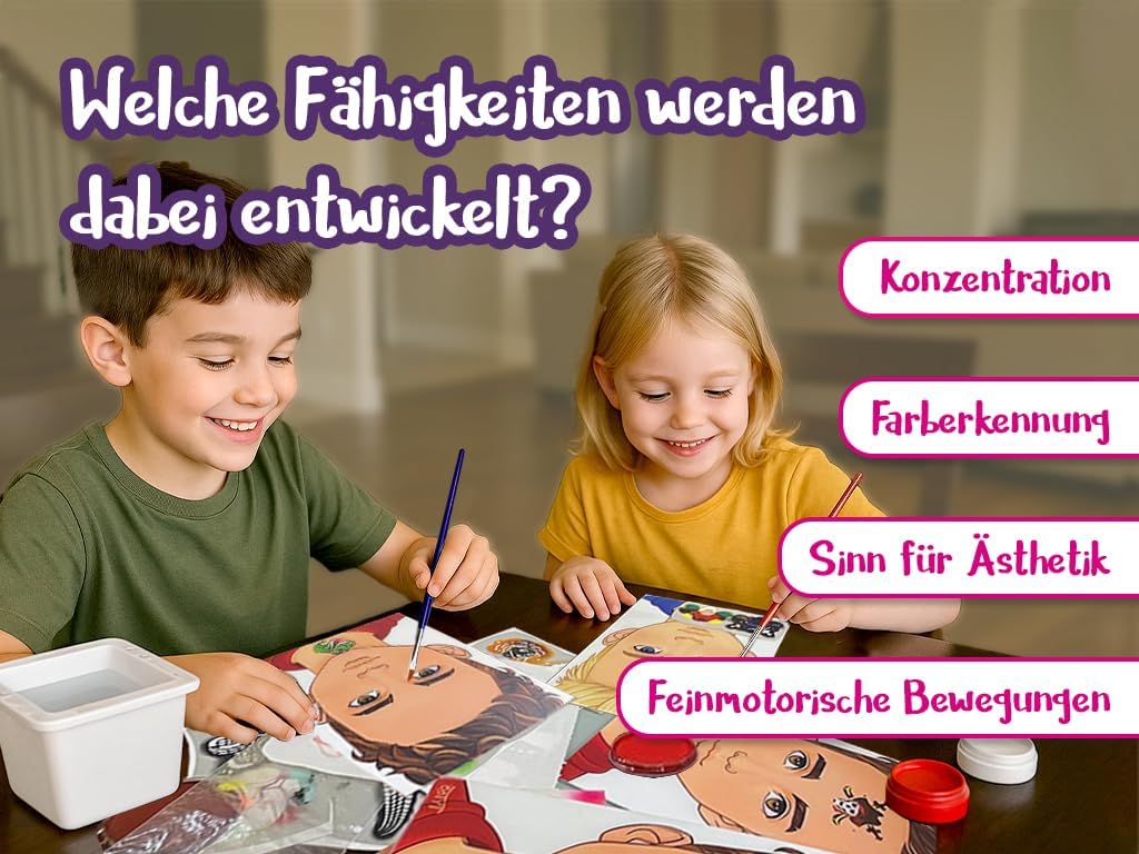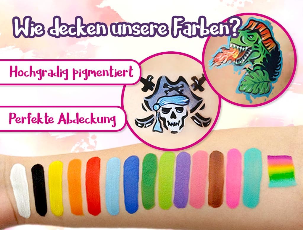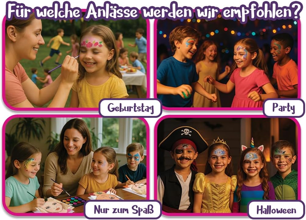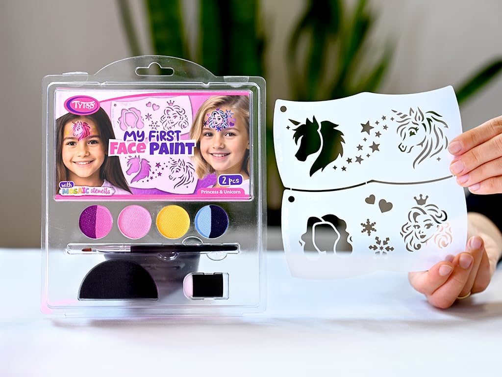 Trucco per bambini per principianti e professionisti - Con gli stencil Mosaico puoi creare disegni perfetti anche senza esperienza. Le ragazze adorano i design creativi. 6 colori vivaci con un forte potere coprente - Il trucco a base d'acqua copre istantaneamente, dura a lungo ed è sufficiente per molti volti. Ideale per un compleanno, un carnevale. Delicato sulla pelle e testato: trucco per bambini registrato nell'UE, testato CPNP, privo di fragranze e allergeni non necessari. Sicuro per la pelle sensibile dei bambini. Facile da pulire: le vernici per il viso possono essere rimosse rapidamente con acqua e sapone. Nessuna lacrima durante la rimozione del trucco Consigliato dai professionisti: gli stessi colori di trucco degli artisti internazionali di Facepainting e dei finalisti della Coppa del Mondo. Stencil principessa e unicorno inclusi: stencil riutilizzabili realizzati in materiale resistente che può essere utilizzato innumerevoli volte. Indispensabile per feste creative per bambini. Kit completo per il trucco per bambini: contiene tutto ciò di cui hai bisogno: 6 colori, 1 pennello, 1 spugna, 1 spugna per le dita, 2 stencil. Pronto all'uso per il trucco dei bambini a casa.