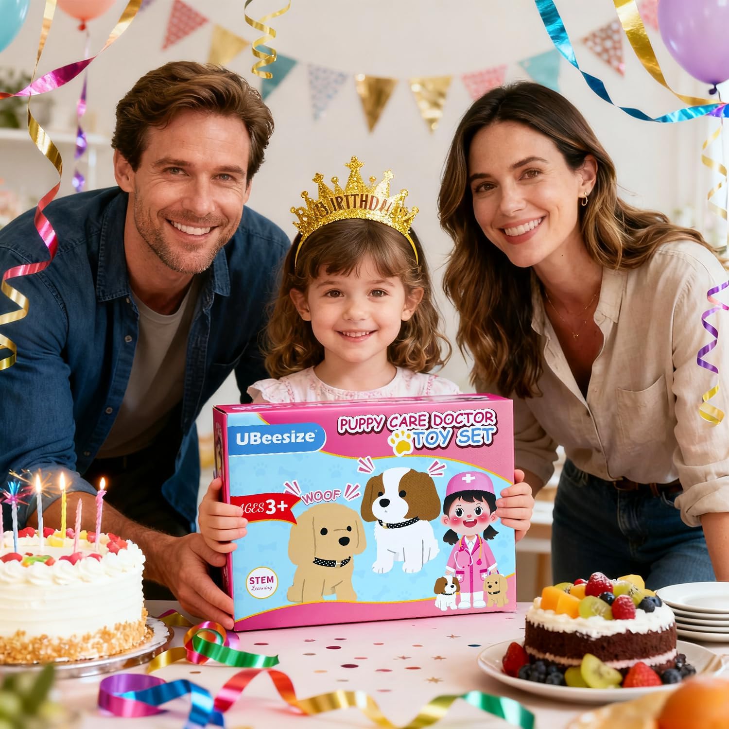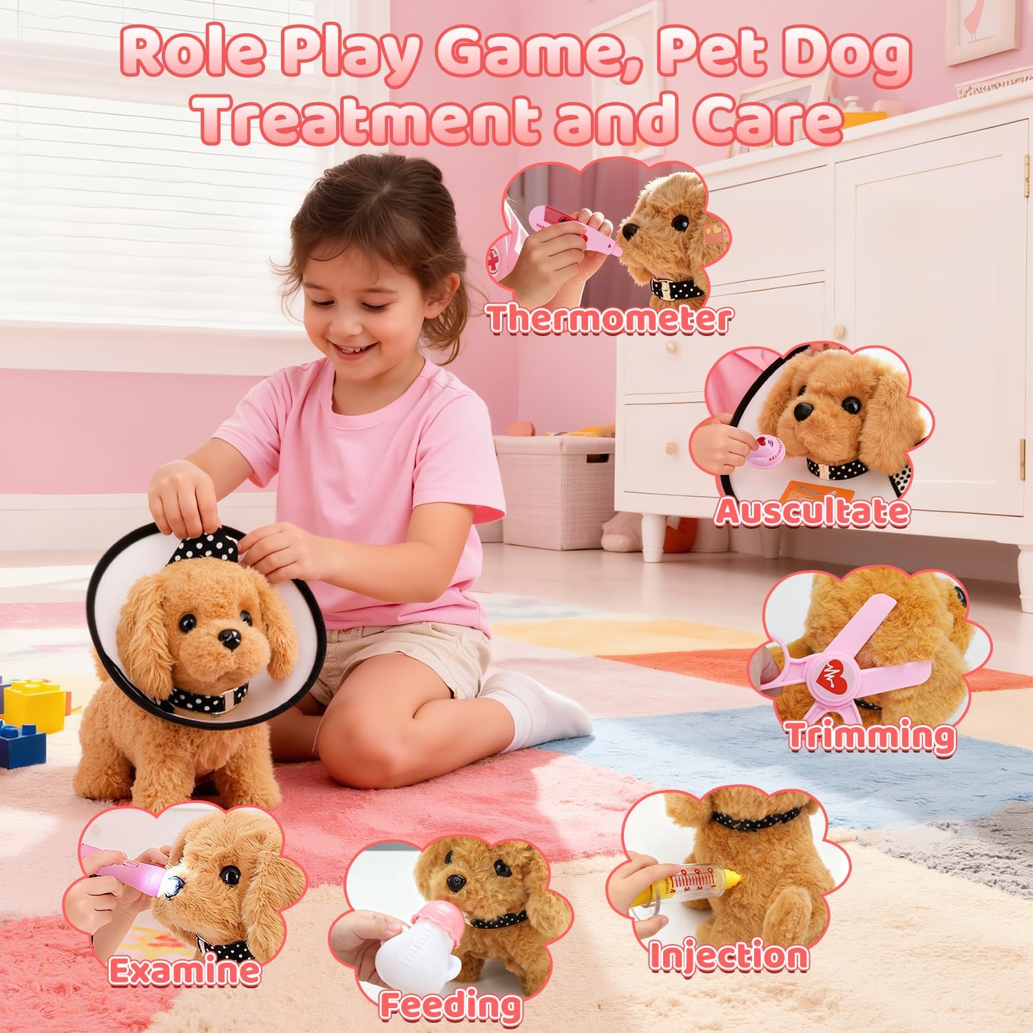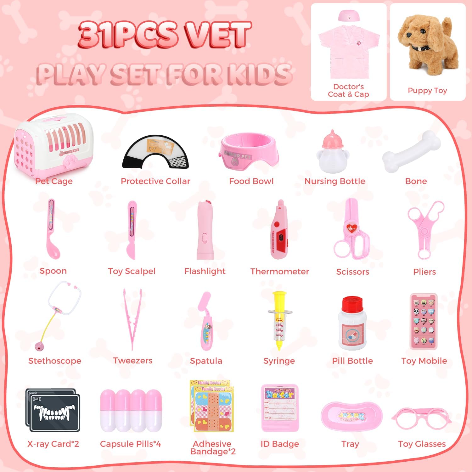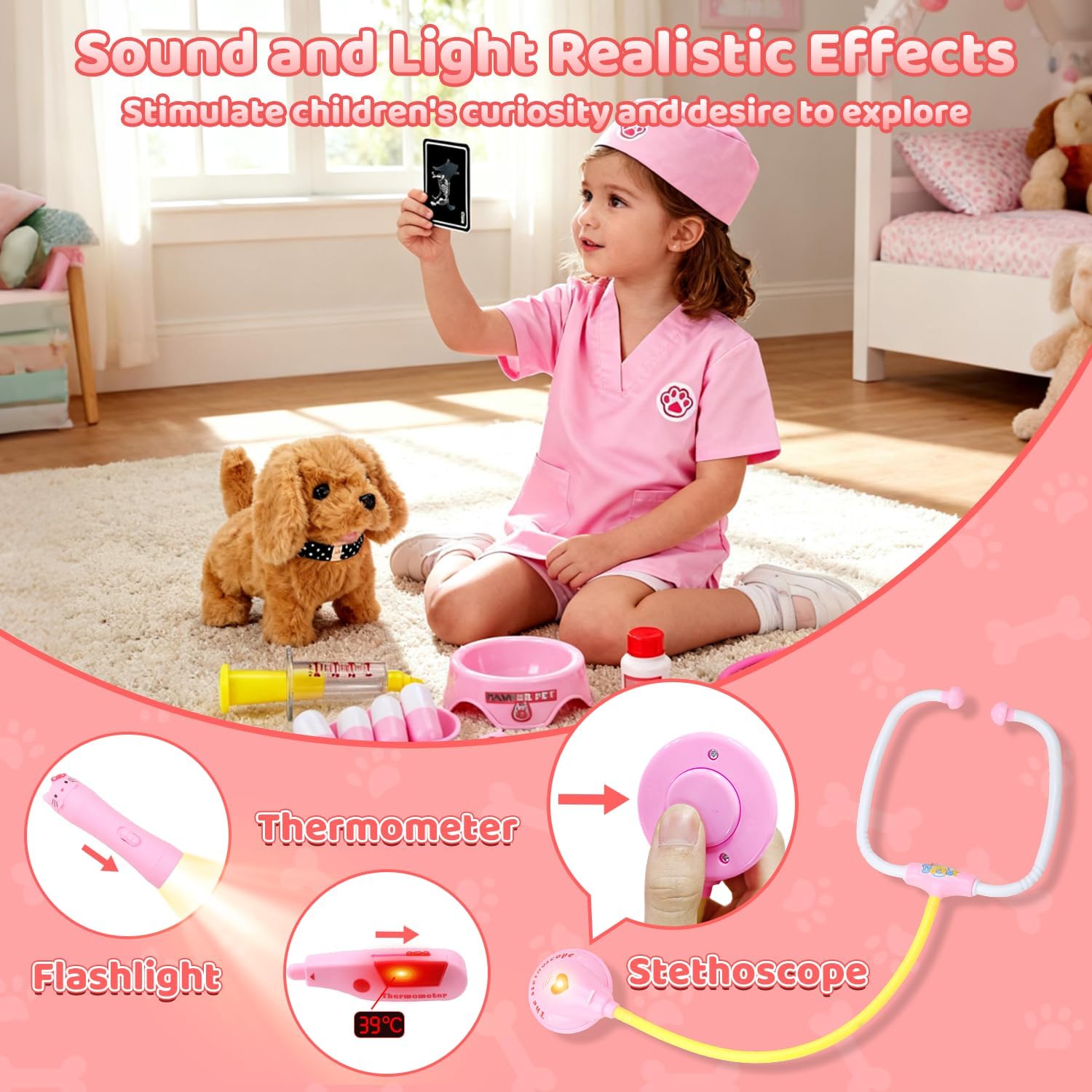 【Kit medico per bambini da 31 pezzi】 Questo set da gioco di ruolo per pediatra contiene tutti gli accessori medici: giocattolo elettrico per cani di peluche, costume da medico, scatola di immagazzinaggio, stetoscopio, termometro, siringhe e altri giocattoli medici. Valigetta del medico per bambini dai 3 anni in su per molteplici scenari di gioco. Lascia che il bambino svolga il ruolo di medico a suo piacimento. Ogni sessione di gioco è piena di nuova gioia. Allo stesso tempo, incoraggiamo l’esplorazione di diversi scenari per la cura degli animali. 【Cane elettrico per bambini】Dopo aver inserito le batterie e acceso l'alimentazione. Questo peluche per cani può camminare e abbaiare come un vero cane. I bambini dai 3 ai 6 anni possono assumere il ruolo di veterinario per prendersi cura dei cani da compagnia. Con questo kit da medico realistico, i ragazzi e le ragazze possono divertirsi a prendersi cura degli animali domestici. Sperimenta un momento di gioco felice. Nota: il cane giocattolo richiede due batterie AA (vendute separatamente). 【Valigia del medico per bambini】 Questo giocattolo da medico per bambini è progettato per una facile conservazione e trasportabilità. Dotato di trasportino per cani per un maggiore comfort. Realizzato con materiali plastici di alta qualità. La superficie è liscia e uniforme. Maggiore sicurezza e praticità per i bambini piccoli. 【Giocattoli educativi per bambini】 Questo set di giochi di ruolo veterinario è adatto a bambini dai 3 ai 5 anni. Può migliorare le abilità pratiche, le capacità comunicative e l’empatia. Assumendo il ruolo di un veterinario che si prende cura di un cane interattivo, i bambini possono acquisire conoscenze mediche di base e possono anche alleviare la paura di andare dal medico. Incoraggia la creatività e l'immaginazione attraverso la gioia e rafforza la fiducia in se stessi. 【Il regalo perfetto】Giocattolo da dottore per bambini appositamente progettato per bambini dai 3 ai 6 anni. Disponibile in rosa e blu. Insieme a un adorabile cane elettrico per bambini. È il regalo perfetto per ragazzi e ragazze. Particolarmente adatto ai bambini piccoli che amano giocare con i giocattoli di ruolo. Che si tratti dell'educazione della prima infanzia, dei compleanni, del Natale, di Halloween o della festa dei bambini, questo set di giocattoli veterinari per bambini porterà sicuramente gioia.