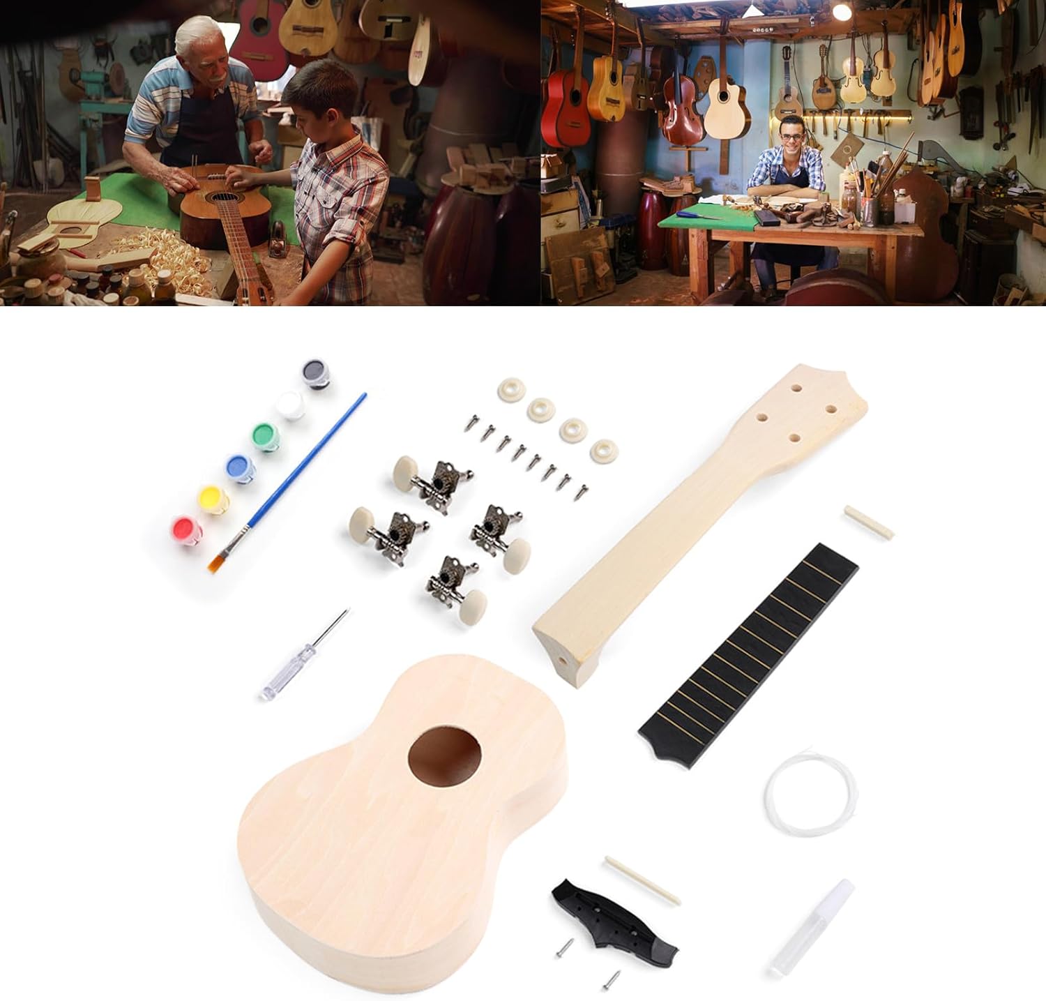 Dipingi il tuo ukulele: set di decorazioni portatili fatte a mano, realizzato in materiale di legno di alta qualità e presenta un'eccellente artigianalità Ukulele per bambini: bellissimi ornamenti per casa, ufficio, caffetteria, ristorante e ovunque, per rendere ogni luogo unico e bello Ukelele Kits Strumento Regalo Giocattolo: Rendi la tua chitarra hawaiana un ukulele speciale fatto a mano. Un dolce regalo da condividere con bambini, amici e familiari Colore: i kit per ukelele in legno non sono dipinti, puoi dipingere come vuoi. Interessante e utile, può mostrare interesse per il ricamo e migliorare le abilità Giocattoli di strumenti musicali per bambini incompiuti difettosi: Hawaiian fatto a mano 4 corde kit ukulele ogni e persino musicista