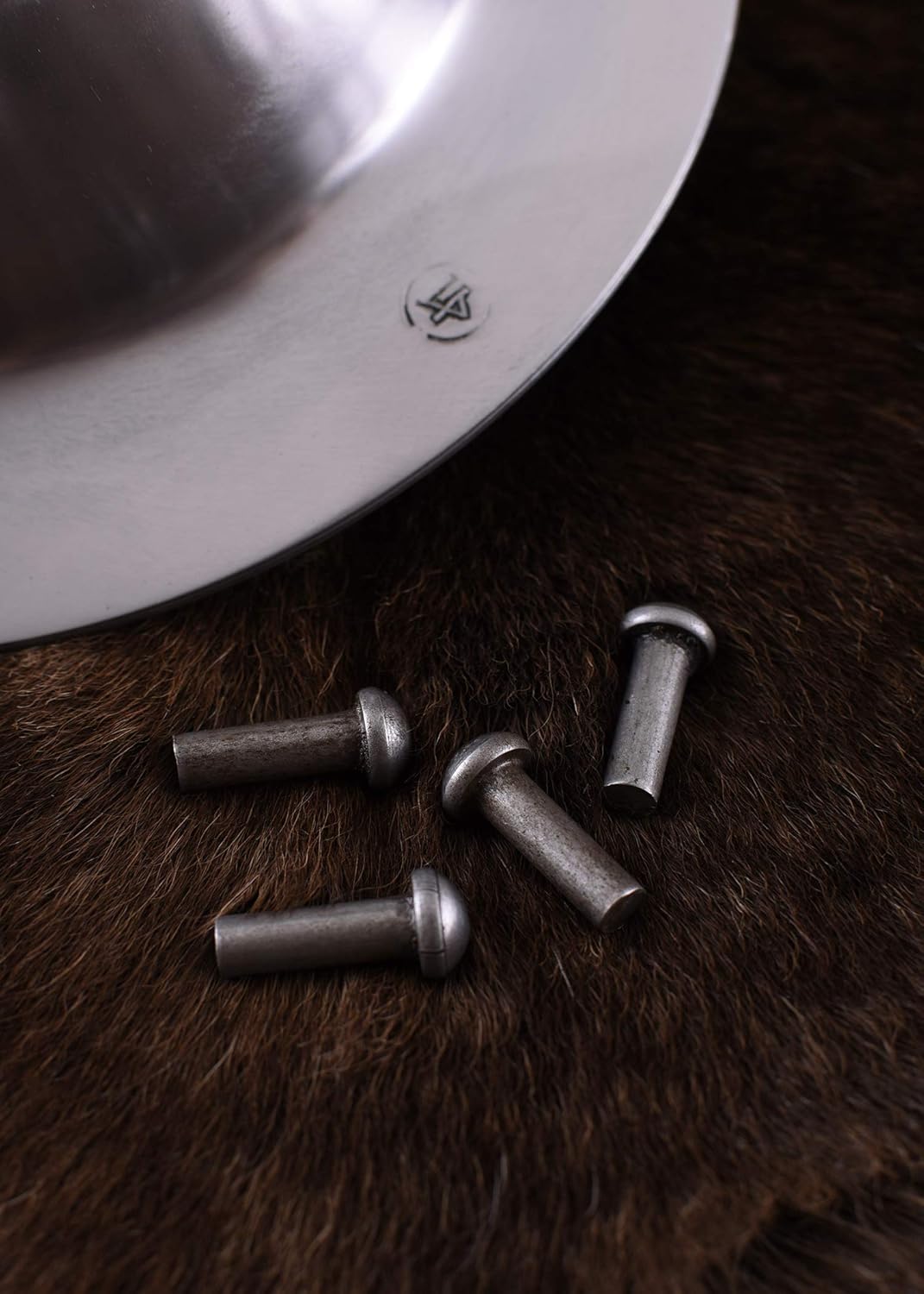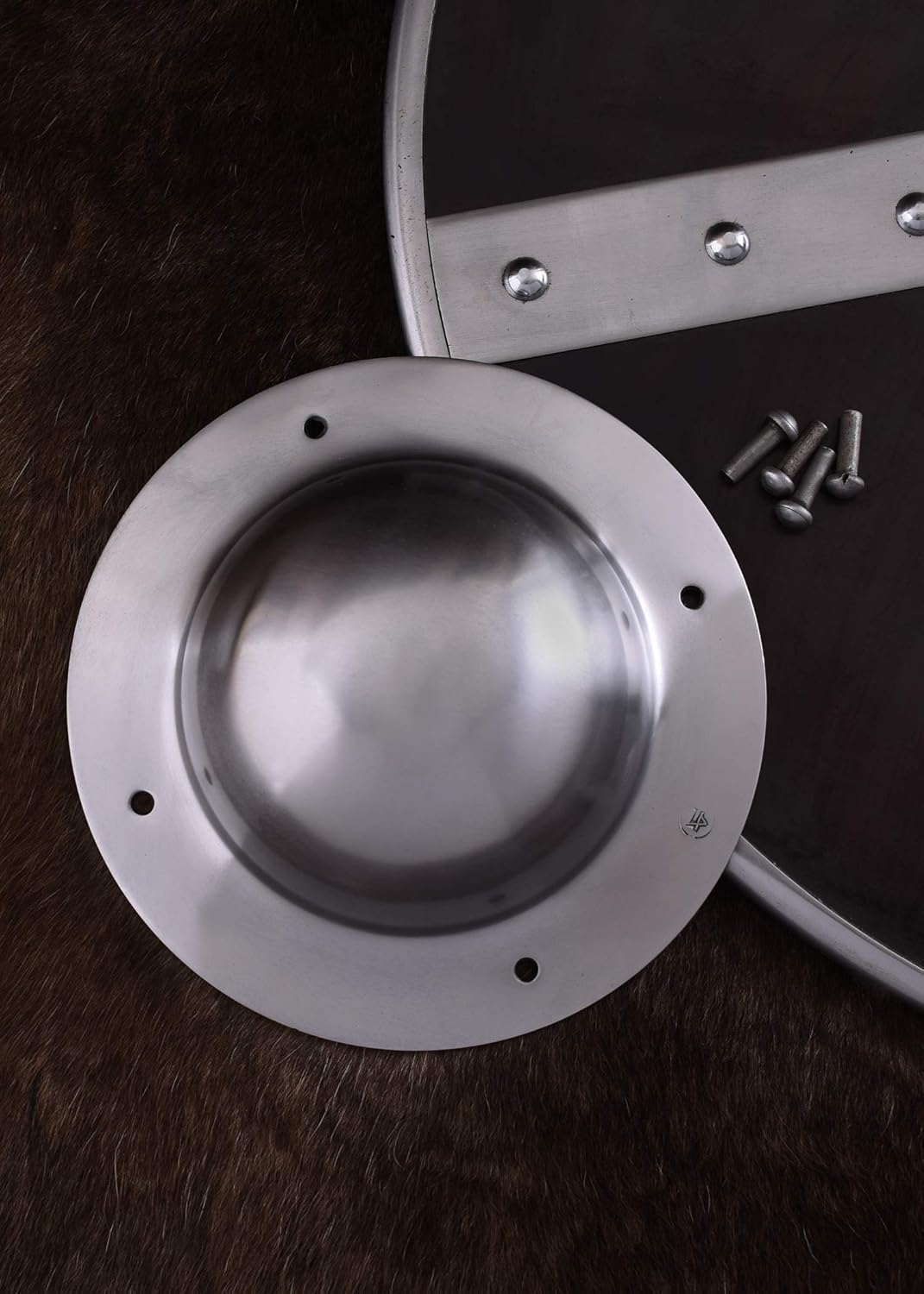 Ricostruzione autentica di un mozzo di scudo medievale in robusto acciaio da 2 mm, ideale per gli appassionati di rievocazioni e collezionisti medievali - diametro totale ca. 19 cm, diametro del boss 12,5 cm Adatto per battaglie show con spessore del materiale di 2 mm per un uso duraturo in rappresentazioni storiche, inclusi quattro rivetti per il fissaggio - profondità della curvatura ca. 6,5 cm Leggero a ca. 500 g, fatto a mano per un tocco vintage rustico - perfetto come aggiornamento per scudi rotondi in attrezzature di rievocazione Uso versatile come protezione centrale per scudi fatti in casa, ispirato a reperti archeologici - un must per gli appassionati di guerra dell'epoca germanica e vichinga Design robusto con fori per rivetti da 5 mm per un'installazione sicura, integra qualsiasi collezione medievale - immergiti nel mondo degli antichi guerrieri e delle battaglie epiche