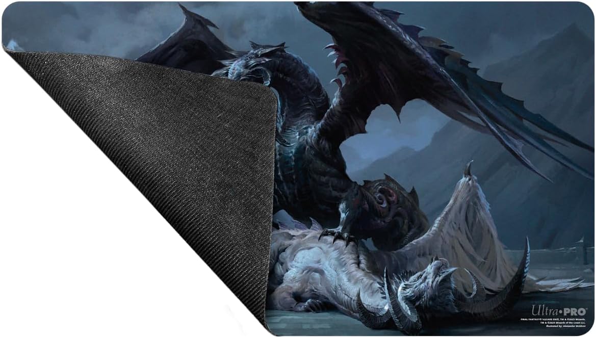 Tappetino con licenza ufficiale per Magic: The Gathering Final Fantasy x Universes Beyond - Un accessorio da collezione di qualità approvato da entrambi i franchise, perfetto per i fan e i giocatori che desiderano migliorare la propria configurazione di gioco con autenticità. Include illustrazioni esclusive di Bahamut e Ifrit (in confezione regalo) di Corbin Schroeder - Presenta vivaci illustrazioni in edizione limitata dell'universo di Final Fantasy, portando un tocco cinematografico alle tue sessioni di Magic: The Gathering. Circa 61 cm. x 34,3 centimetri. e si appiattisce - Dimensioni ideali per il gioco o l'uso in ufficio, offrendo ampio spazio e garantendo che il tappetino rimanga senza pieghe e pronto all'azione. La parte superiore in morbido tessuto protegge le carte durante il gioco - Progettata per ridurre al minimo l'usura e i danni delle carte, rendendola una superficie affidabile per mescolare, toccare e disegnare. Il supporto in gomma antiscivolo impedisce al tappetino da gioco di muoversi durante l'uso - Fornisce stabilità durante le partite intense o l'uso quotidiano sulla scrivania, fungendo anche da tappetino per mouse resistente ed elegante.