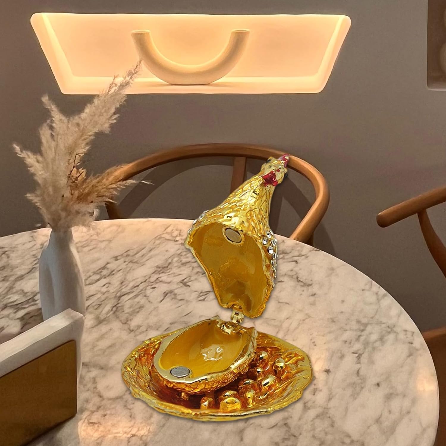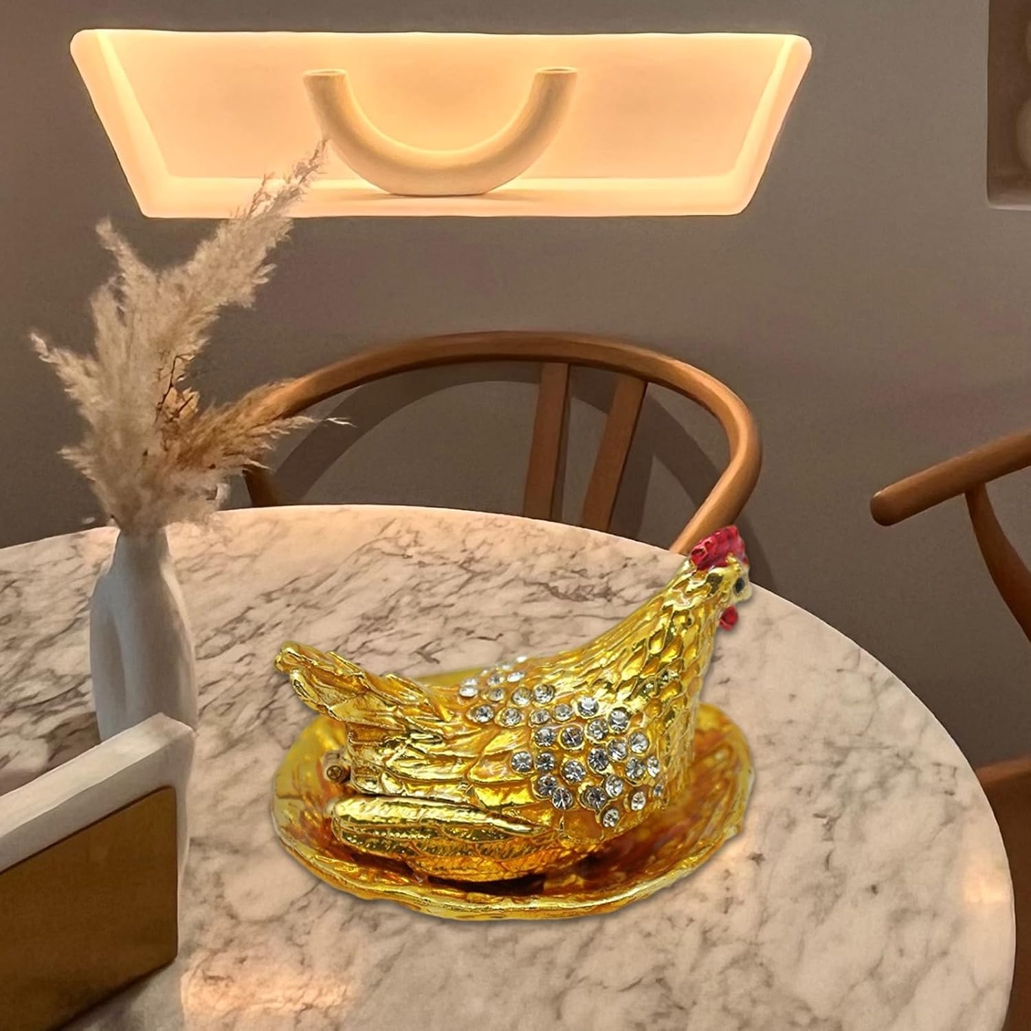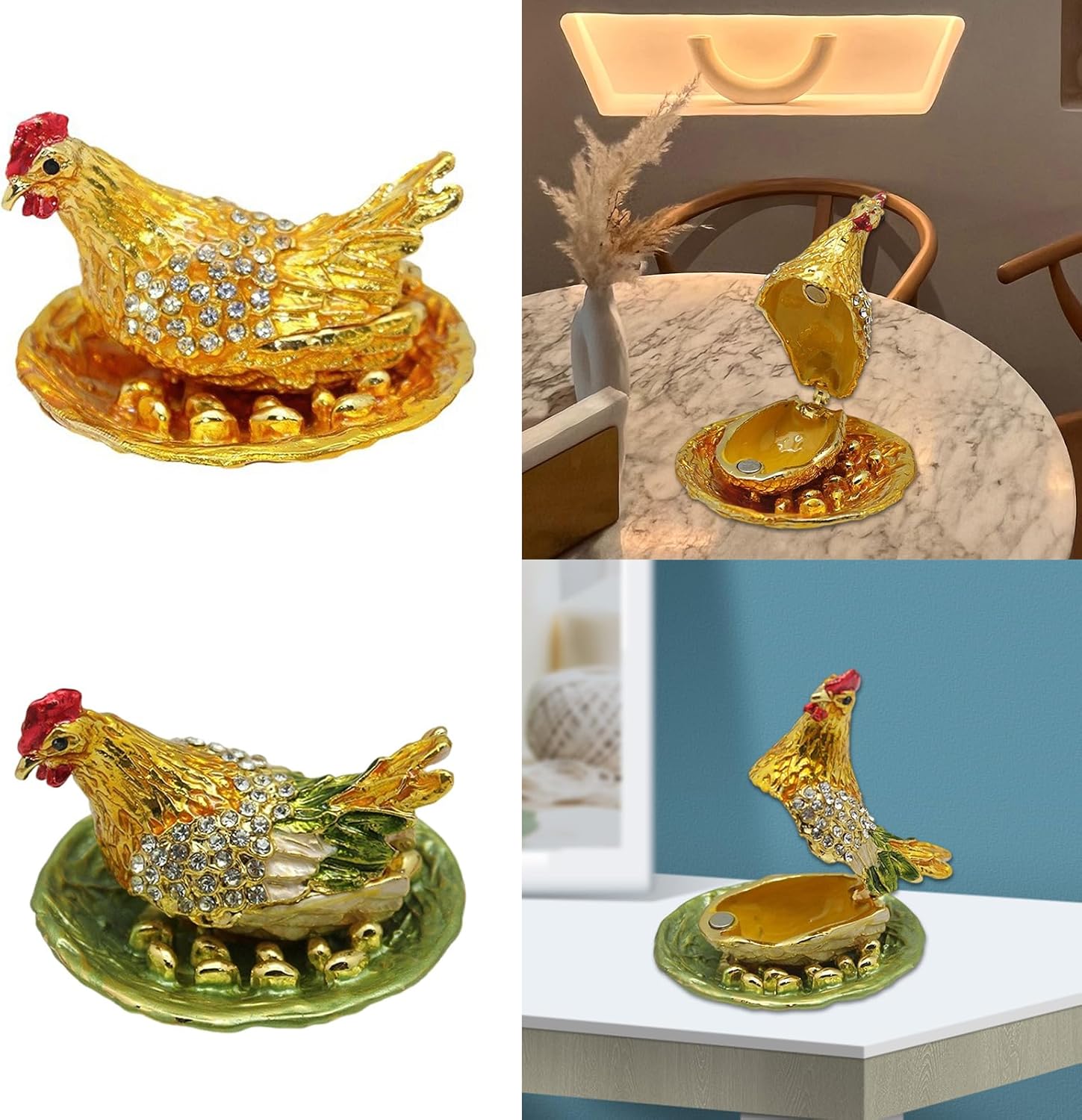 Riempie il tuo spazio con le essenze di prosperità e felicità con i nostri polli d'oro e depone le uova Fengshui Ornamento, un simbolo di continui flussi di ricchezza In salotti, uffici o negozi, questo ornamento è perfettamente adatto per mostrare in salotti, uffici o negozi, e non serve solo lo spazio, ma serve anche come simbolo di prosperità e positivo Ottimo per gli appassionati di pratiche Fengshui, collezionisti del manufatto cinese o qualcuno che porta fortuna e successo finanziario in lei Artigianato realizzato in metallo di alta qualità, questa figura dorata brilla brillantemente e aggiunge un tocco di eleganza a qualsiasi casa Un grande regalo o un tesoro personale, questo ornamento Fengshui è più che estetico; un faro di speranze e frequenze in qualsiasi ambiente