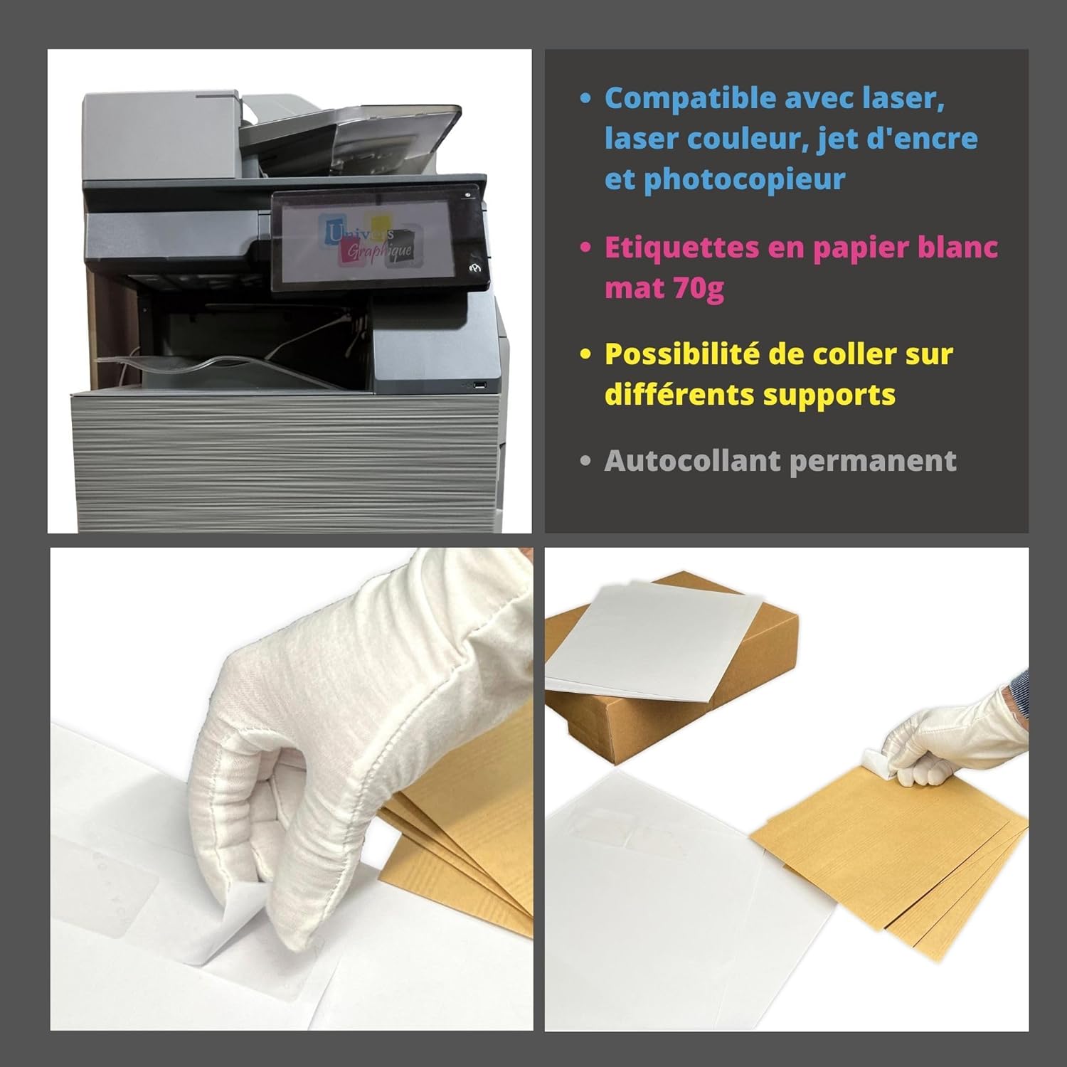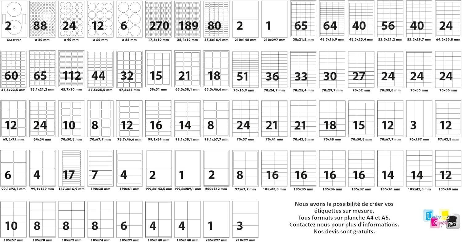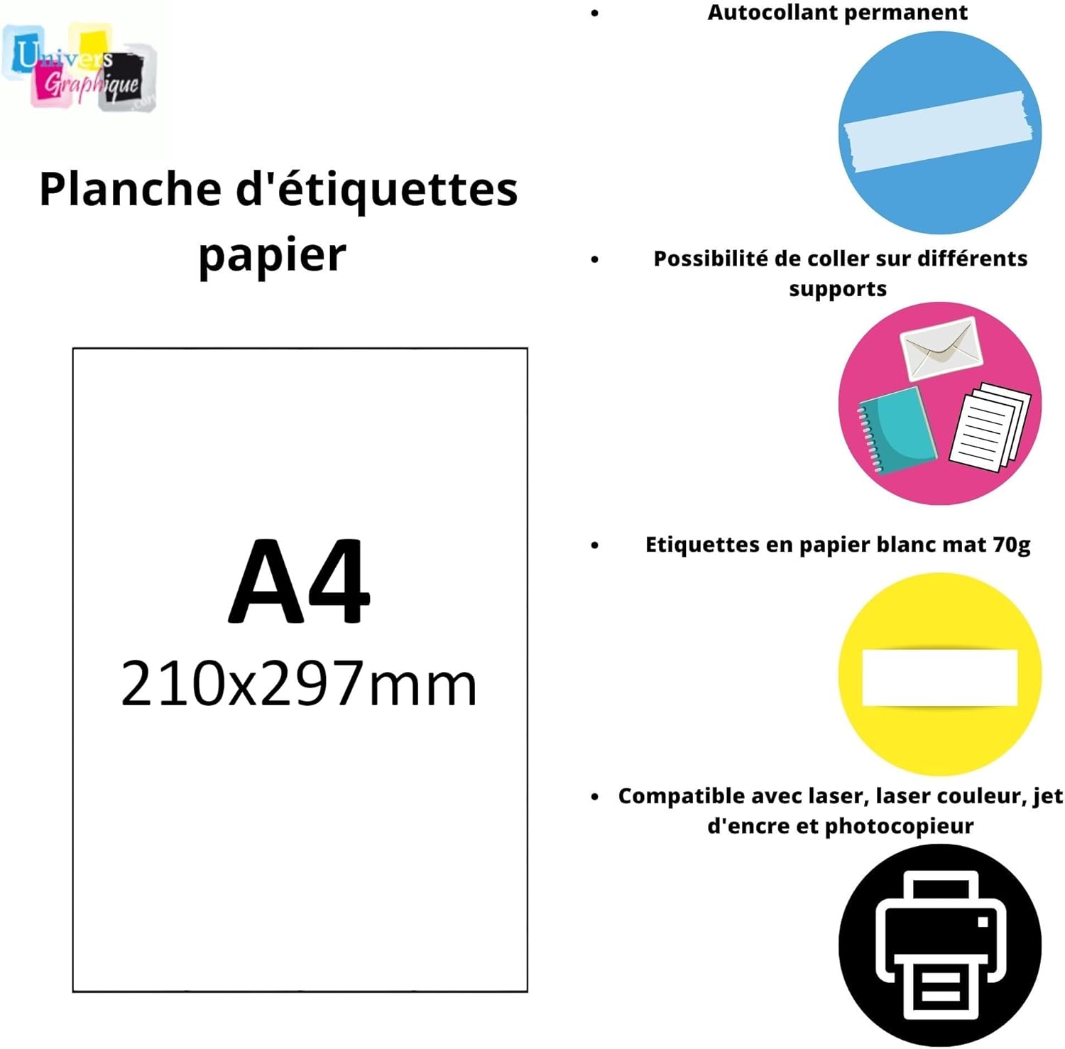 Norme dell'Unione Europea. Queste etichette adesive sono standardizzate e si distinguono per la loro finitura di alta qualità in linea con gli standard europei. Certificati FSC. 50 etichette, dimensioni 21 x 29.7 cm, fogli A4. Fogli adesivi bianchi opachi. Etichette personalizzabili. Ideale per la creazione di etichette multiuso con design personalizzati. Compatibile con stampanti laser, a getto d'inchiostro. IVA deducible