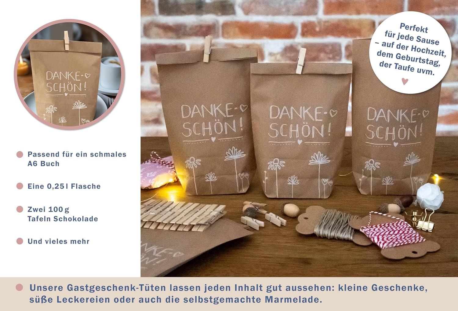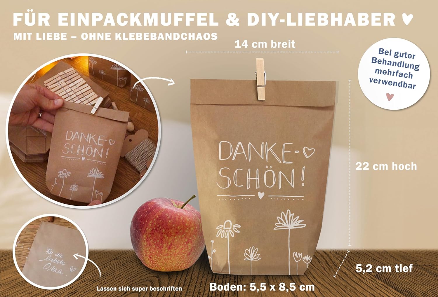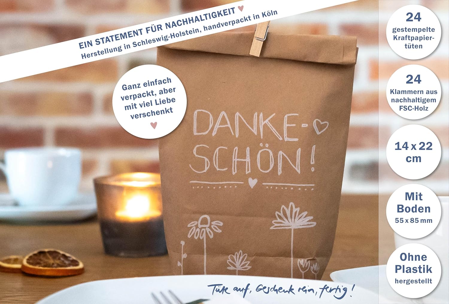Cerchi un piccolo regalo per dire grazie? Tutti sono contenti di questi bellissimi sacchetti regalo in carta kraft e del loro delizioso contenuto :) ECCO COSA RICEVERAI: Un set di sacchetti regalo con 24 sacchetti di carta kraft marrone (14 x 22 cm, base 5,5 x 9 cm) e stampa - Grazie - in bianco e 24 mini clip in legno in legno FSC per la chiusura ► Altro Puoi trovare uno dei buoni sacchetti regalo con la parola di ricerca: sacchetti edg ECCO CHE Il bello: che si tratti di un matrimonio, compleanno, Natale, Capodanno, cresima, addio al nubilato, nozze d'argento o laurea: i sacchetti regalo stampati sono sempre adatti quando è in programma una grande festa. BUONO PER QUESTE OCCASIONI: Ideale come regalo per le feste, ma anche come piccolo regalo per il tuo collega, la squadra... e il corriere, il postino, il fattorino, il vicino disponibile e il tuo aiuto domestico ne saranno sicuramente felici! NOTA: i sacchetti non sono adatti per conservare biscotti e alimenti non confezionati poiché non sono repellenti ai grassi. QUINDI UNO DEI BUONISSIMI: Siamo una piccola casa editrice di Colonia con molta passione per il bel design fatto a mano. La sostenibilità è molto importante per noi: ecco perché facciamo piantare, spedire e produrre alberi in modo neutro dal punto di vista climatico e, ogni volta che possiamo, con carta FSC o riciclata.