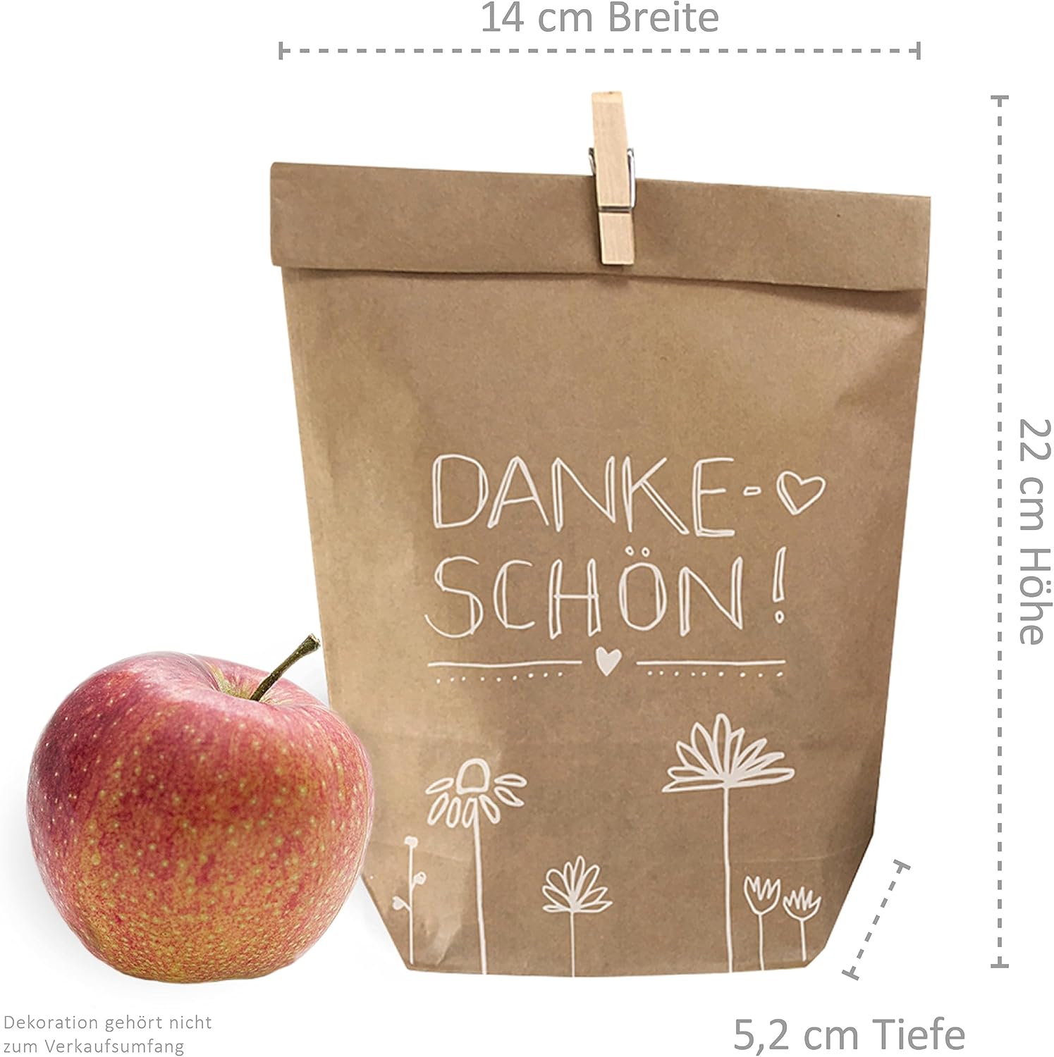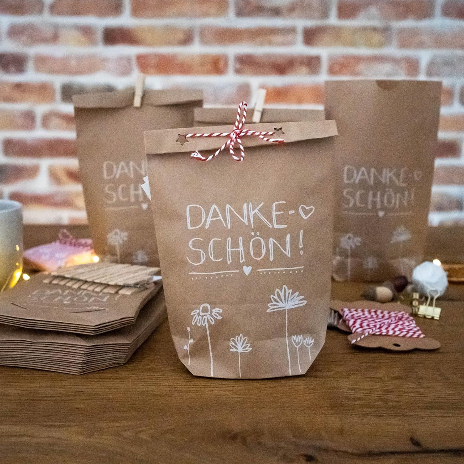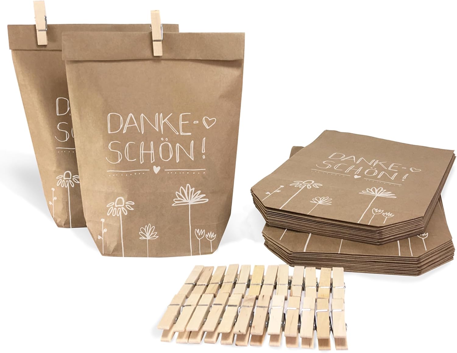 Cerchi un piccolo regalo per dire grazie? Tutti sono contenti di questi bellissimi sacchetti regalo in carta kraft e del loro delizioso contenuto :) ECCO COSA RICEVERAI: Un set di sacchetti regalo con 24 sacchetti di carta kraft marrone (14 x 22 cm, base 5,5 x 9 cm) e stampa - Grazie - in bianco e 24 mini clip in legno in legno FSC per la chiusura ► Altro Puoi trovare uno dei buoni sacchetti regalo con la parola di ricerca: sacchetti edg ECCO CHE Il bello: che si tratti di un matrimonio, compleanno, Natale, Capodanno, cresima, addio al nubilato, nozze d'argento o laurea: i sacchetti regalo stampati sono sempre adatti quando è in programma una grande festa. BUONO PER QUESTE OCCASIONI: Ideale come regalo per le feste, ma anche come piccolo regalo per il tuo collega, la squadra... e il corriere, il postino, il fattorino, il vicino disponibile e il tuo aiuto domestico ne saranno sicuramente felici! NOTA: i sacchetti non sono adatti per conservare biscotti e alimenti non confezionati poiché non sono repellenti ai grassi. QUINDI UNO DEI BUONISSIMI: Siamo una piccola casa editrice di Colonia con molta passione per il bel design fatto a mano. La sostenibilità è molto importante per noi: ecco perché facciamo piantare, spedire e produrre alberi in modo neutro dal punto di vista climatico e, ogni volta che possiamo, con carta FSC o riciclata.