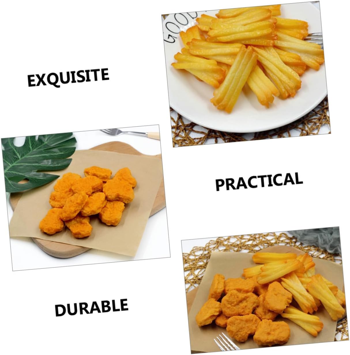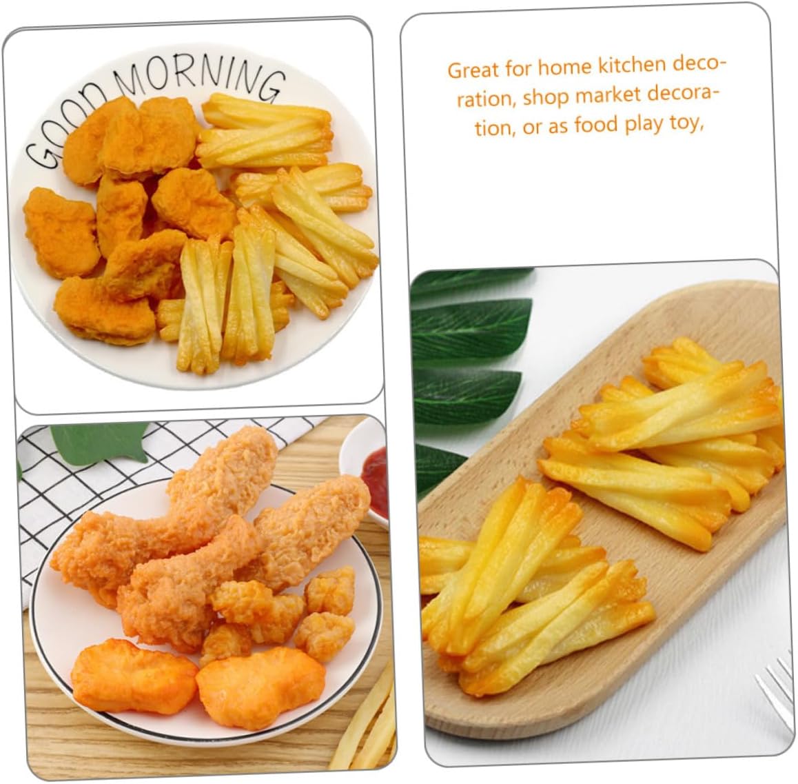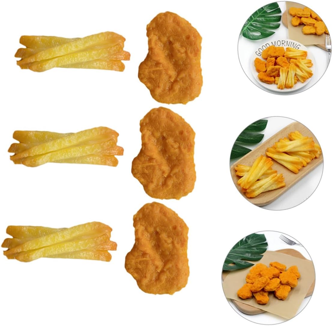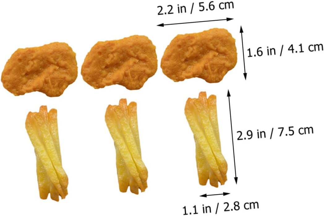 Nuggets di pollo: aspetto realistico, sembrano proprio come quelli veri, il che li rende molto attraenti e deliziosi, giocattolo di nuggets di pollo e patatine fritte I bocconcini di pollo sono cibo artificiale: di piccole dimensioni e leggeri, sono facili da trasportare e da usare sempre e ovunque Giocattoli di crocchette di pollo e patatine fritte: ottimi per decorare la cucina di casa, i negozi e i mercati o come giocattoli alimentari finti Nuggets di pollo di scena: realizzati in materiale pvc, sicuri e inodori, affidabili, puoi usarli con sicurezza, nuggets di pollo da gioco Finti bocconcini di pollo e patatine fritte: con un design realistico, colori bellissimi, aspetto grazioso, delicato e raffinato, finti bocconcini di pollo e patatine fritte