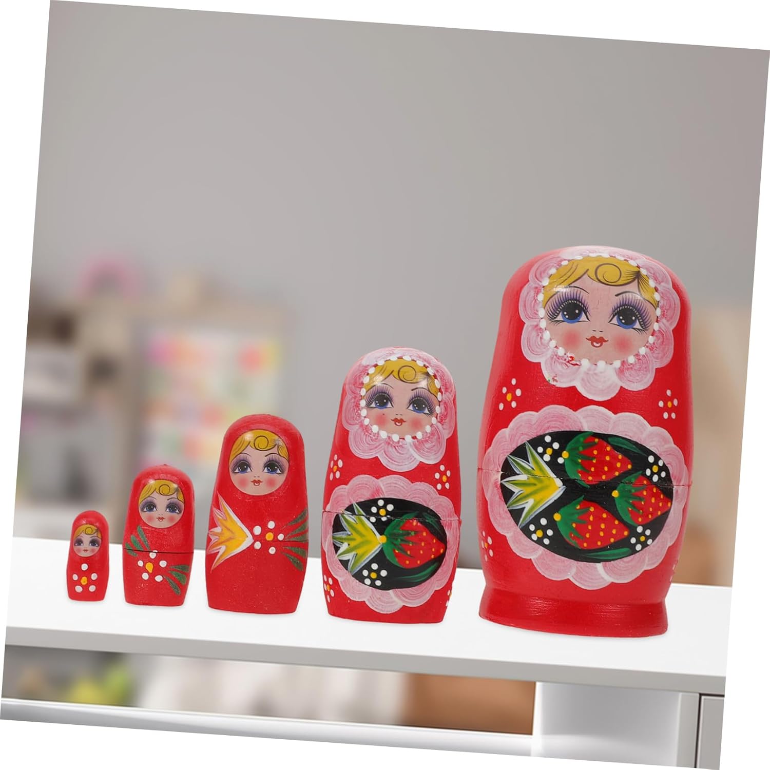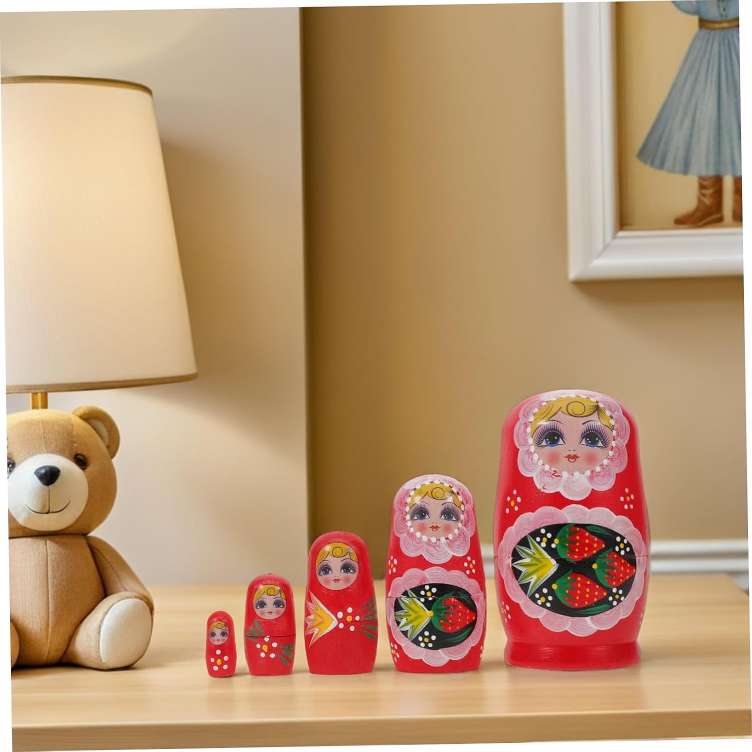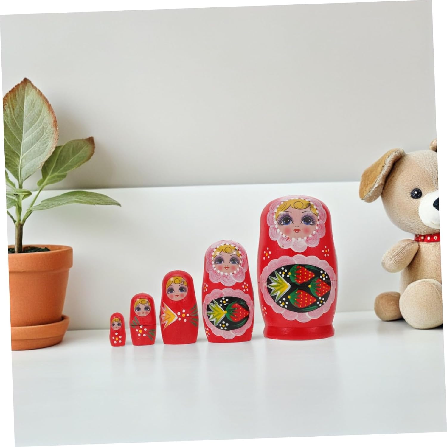 DURATA DEL LEGNO A LUNGA DURATA: matrioske realizzate a mano in legno di alta qualità garantiscono durata, fornendo matrioske per l'arredamento della casa e le famiglie da godere per anni, oggetti di scena fotografici a tema fragola, matrioske per famiglie Cinque strati per versatilità: le matrioske a cinque strati servono come giocattoli educativi impilabili, pratico contenitore o come pezzi artigianali per presentazioni creative, giocattoli alla fragola, bambole matrioska in legno dipinte Dettagli artistici: queste matrioska dipinte a mano Le bambole per gli amanti dell'arte evidenziano l'artigianato russo, offrendo figurine matrioska uniche perfette per la decorazione della tavola, bambole russe dipinte a mano, bambole matrioska colorate per la casa, decorazioni per feste di Natale o bambole russe in legno. Versatilità: con un set di matrioska a cinque strati, questi giocattoli impilabili in legno sono ideali per riporre piccoli oggetti o abbellire decorazioni matrioska invernali, bambole matrioska e tradizionali bambole russe.