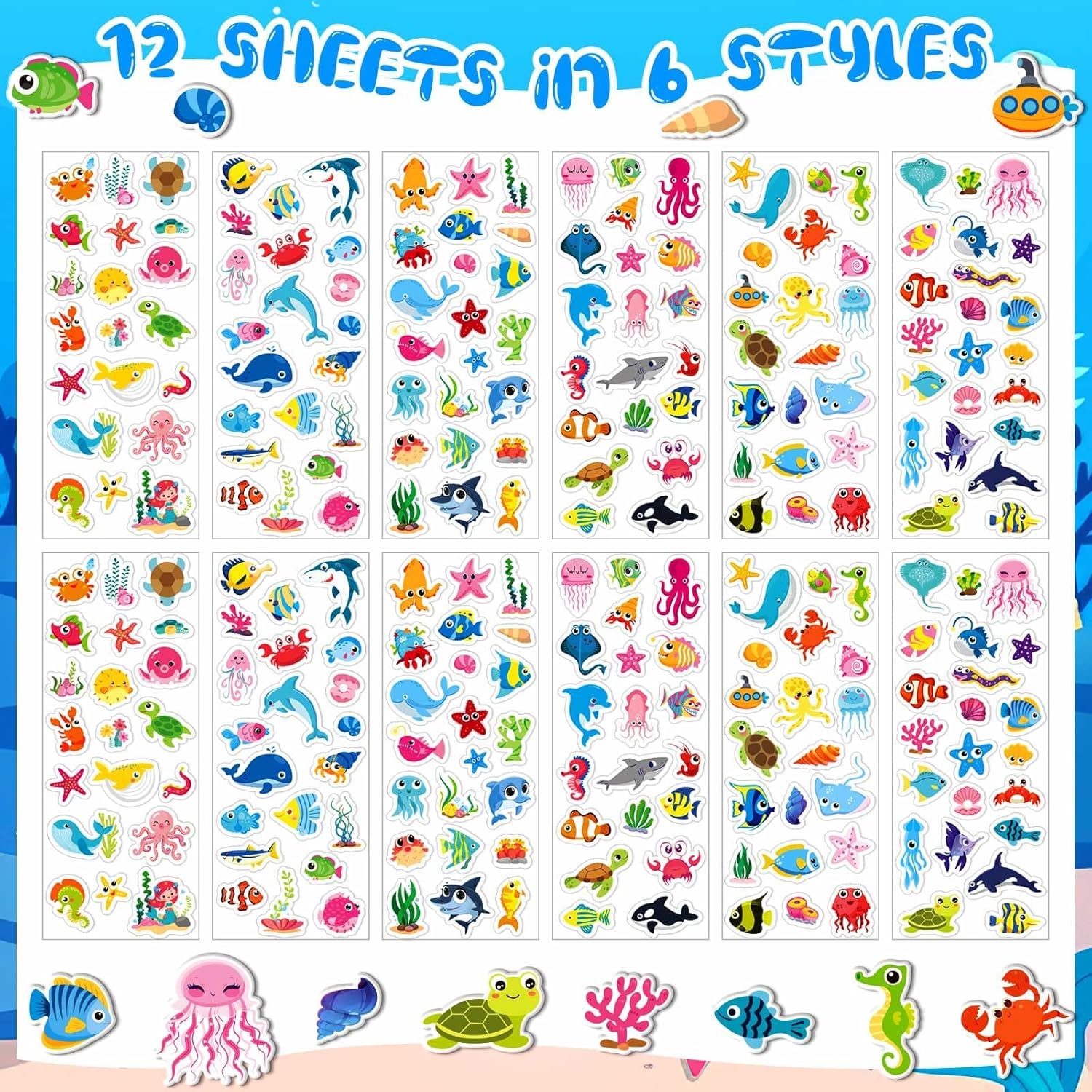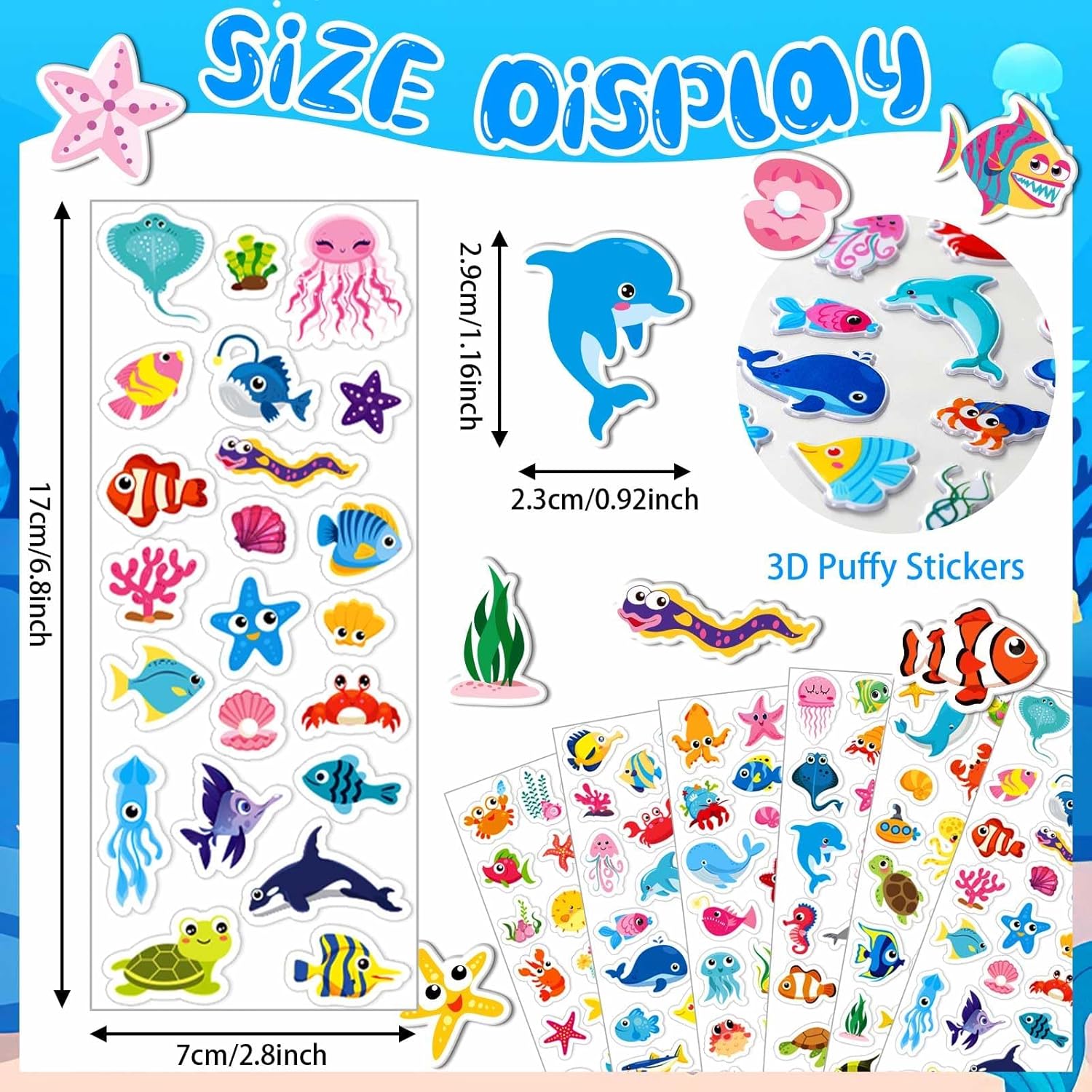 【Impermeabile e buona adesione】 Gli adesivi delle creature marine sono realizzati in PVC, sono inodore, idrorepellenti, hanno una buona durata, non sono facili da strappare, hanno una buona adesione e non lasciano segni dopo la rimozione. Ogni adesivo è unico nel design, ragazzi e ragazze possono creare i loro stili preferiti e offrire ai bambini una buona esperienza manuale. 【Tema carino con animali marini】 Il set di adesivi per bambini contiene 6 diversi tipi di adesivi con animali marini, come: B. Polpo, stelle marine, balene e delfini, che sono carini e vivaci. Ogni adesivo per bambini ha un design unico e una regolazione del colore per soddisfare le diverse preferenze dei bambini. Non importa se i bambini amano esplorare il mondo sottomarino o sono interessati alla vita marina, da noi troveranno gli adesivi giusti con le creature marine. 【Contenuto della confezione】 Riceverai 12 fogli di adesivi marini 3D per bambini in 6 stili, condensando il profondo e misterioso mondo sottomarino nelle tue mani. Ogni adesivo oceanico è splendidamente progettato e di qualità affidabile, inclusi pesci, crostacei e coralli di diverse dimensioni, che mostrano il fascino unico del mondo marino e soddisfa le varie esigenze di decorazione.,Facile da usare: il set di adesivi ha un design autoadesivo, senza colla o nastro aggiuntivo. Basta staccare gli adesivi gonfi dalla carta posteriore e attaccare facilmente gli adesivi marini su superfici lisce come quaderni, astucci, scrivanie e pareti. Inoltre, gli adesivi oceanici sono facili da staccare e non danneggiano la superficie degli oggetti. Lascia che i bambini mostrino la loro personalità e creatività.,Ampia applicazione: questi adesivi oceanici possono essere utilizzati per decorare quaderni, buste, biglietti di auguri, sacchetti regalo e pareti o per attività genitore-figlio, feste di compleanno e lezioni di artigianato a scuola. Che si tratti di un regalo di compleanno, di una sorpresa per le vacanze o di una ricompensa per i progressi nell'apprendimento dei bambini, i simpatici adesivi possono mostrare cuore e gusto, ai bambini piaceranno gli adesivi del mare
