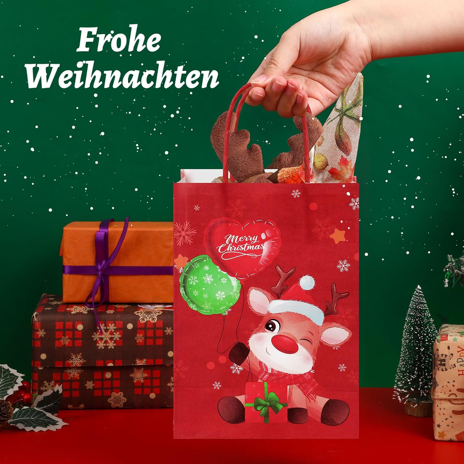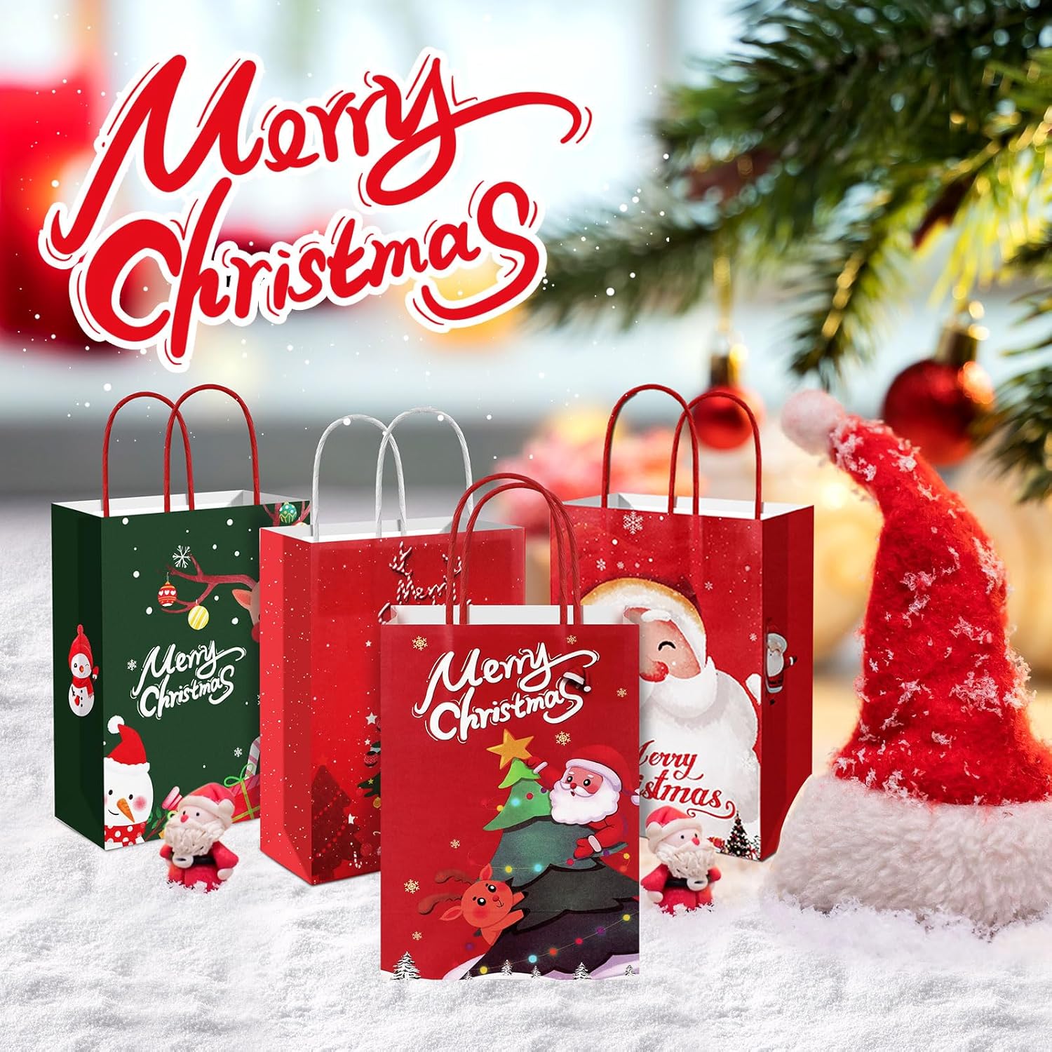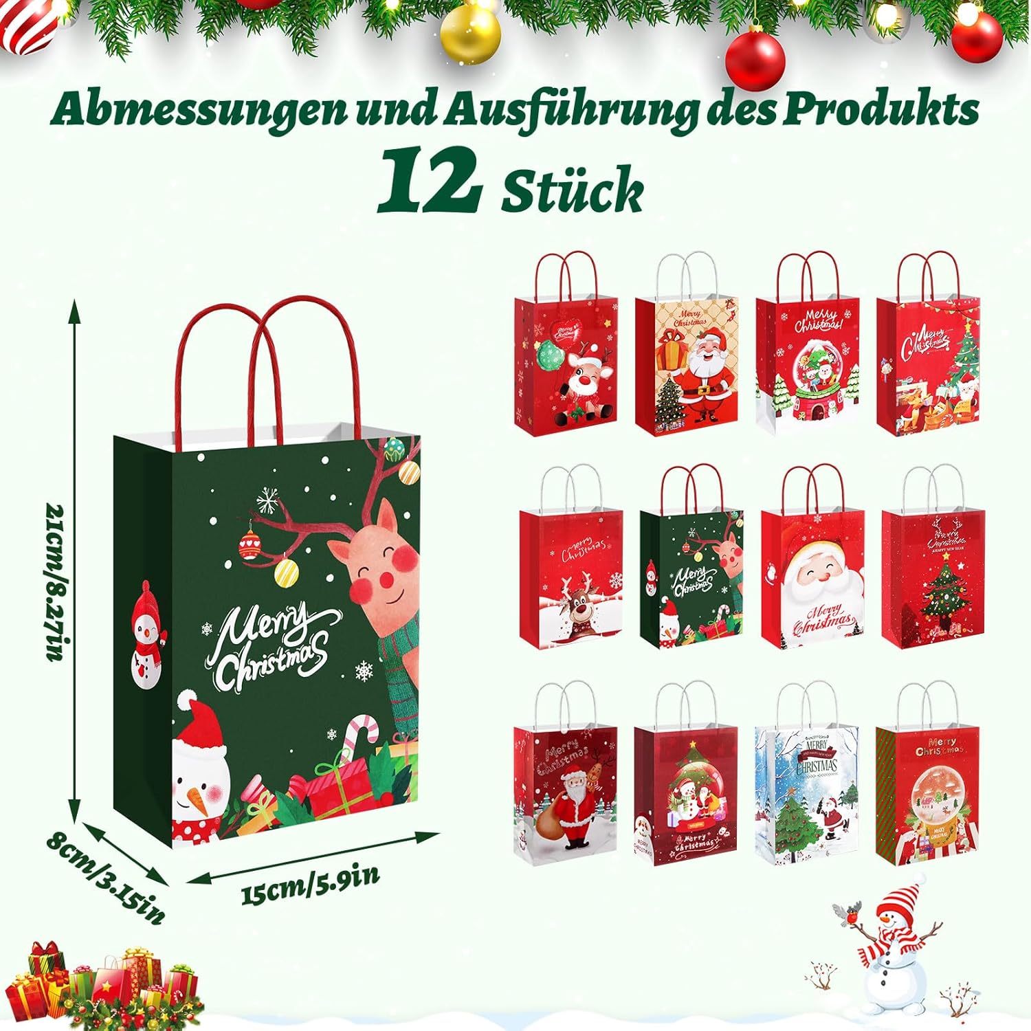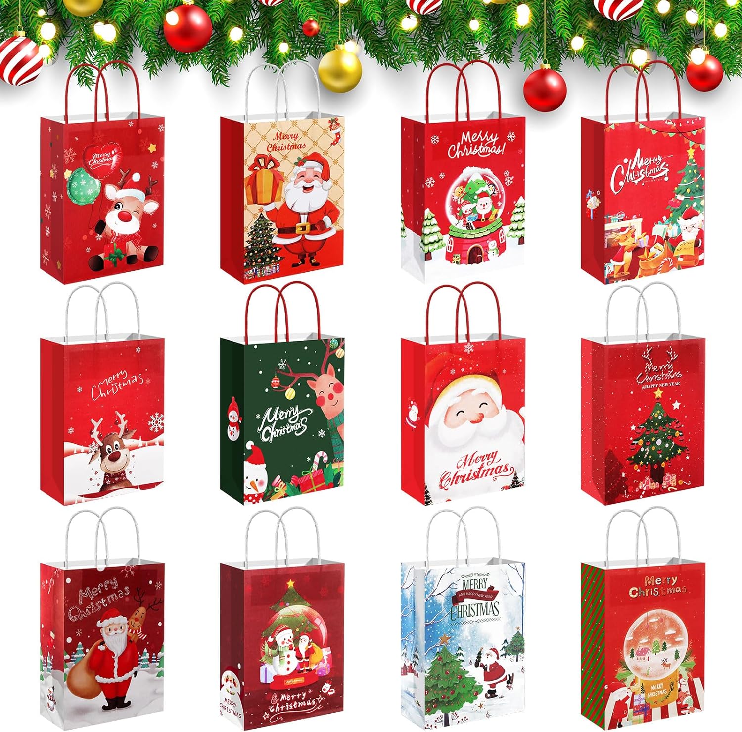 Set di sacchetti natalizi: riceverai 12 diversi modelli di sacchetti regalo natalizi. Ogni sacchetto di carta natalizio contiene elementi a tema natalizio, tra cui Babbo Natale, pupazzo di neve, alce, albero di Natale, ecc. Riempi istantaneamente la confezione regalo con un'atmosfera festosa Materiale di alta qualità: questo sacchetto regalo di Natale è realizzato in carta kraft, che è robusta, durevole, non facile da strappare, riutilizzabile e fornisce una protezione completa per i tuoi regali. Allo stesso tempo, la carta kraft ha una trama di alta qualità che rende i tuoi regali più eleganti. Misura adatta: la dimensione di ogni sacchetto regalo di Natale è 21 x 15 x 8 cm, che può contenere la maggior parte dei regali di piccole e medie dimensioni. Che si tratti di caramelle natalizie, gioielli o altri piccoli regali, è facile da imballare, rendendolo la scelta ideale per confezionare regali di Natale. Facile da usare: ogni sacchetto di carta natalizio ha una maniglia robusta, quindi puoi sollevare e trasportare facilmente il sacchetto regalo in qualsiasi momento. Allo stesso tempo, i sacchetti regalo di carta sono facili da piegare e aprire per riporli e riutilizzarli. Ciò consente di risparmiare spazio e offrire più comodità alla tua vita. Ampia applicazione: questi sacchetti regalo di Natale sono adatti per Natale, Ringraziamento, feste di compleanno, feste a tema, ecc. Puoi utilizzare i sacchetti di Natale per confezionare libri, articoli di cancelleria, gioielli, caramelle, frutta, snack, giocattoli, ecc. per rendere i tuoi regali più speciali e premurosi