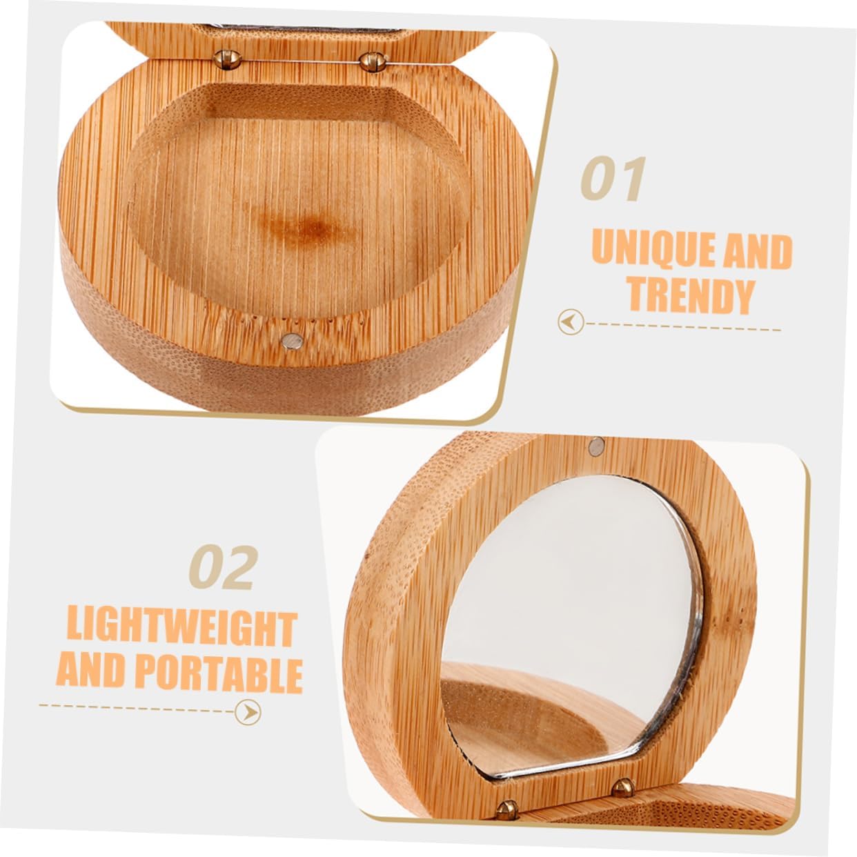 Materiale in legno: realizzato in bambù nanmu, questo specchio è facile da usare e sicuro, dandoti fiducia nel suo utilizzo, specchio cosmetico pieghevole, specchio cosmetico in legno Portatile e leggero: il design pieghevole in bambù assicura che questo specchio sia leggero e facile da trasportare, offrendo comodità per il trucco in movimento, specchio da scrivania in legno, specchio pieghevole in bambù Alta definizione: la superficie dello specchio è realizzata in ad alta definizione, offrendo elevata chiarezza e riflessione dettagliata per un'applicazione precisa del trucco, piccolo specchio tascabile, mini specchio in legno Leggero e portatile: il design pieghevole in bambù rende questo specchio facile da trasportare, assicurandoti di avere un comodo strumento per il trucco in movimento, specchio compatto portatile, specchio da borsetta pieghevole Trendy e unico: il design esterno in bambù è elegante e unico, rendendo questo specchio un accessorio alla moda che riflette il tuo stile personale, specchio pieghevole portatile in legno, specchio cosmetico in legno