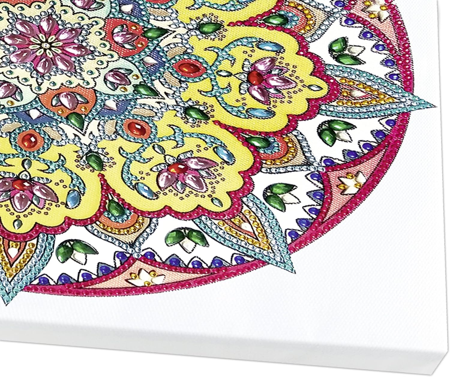 Kit per diamond painting colorato e decorativo "Mandala 3" nei colori giallo, bianco e rosso I piccoli strass devono essere incollati su una tela con un cuscinetto adesivo e un pennino Contenuto del kit: 1 mandala su tela (30 x 30 x 1,5 cm), 1 penna con cuscinetto adesivo, 1 vassoio, 1 pinzetta, 1 kit di montaggio, diversi diamanti acrilici Stimola la creatività e le abilità motorie Nella confezione sono incluse le istruzioni e la leggenda per le pietre