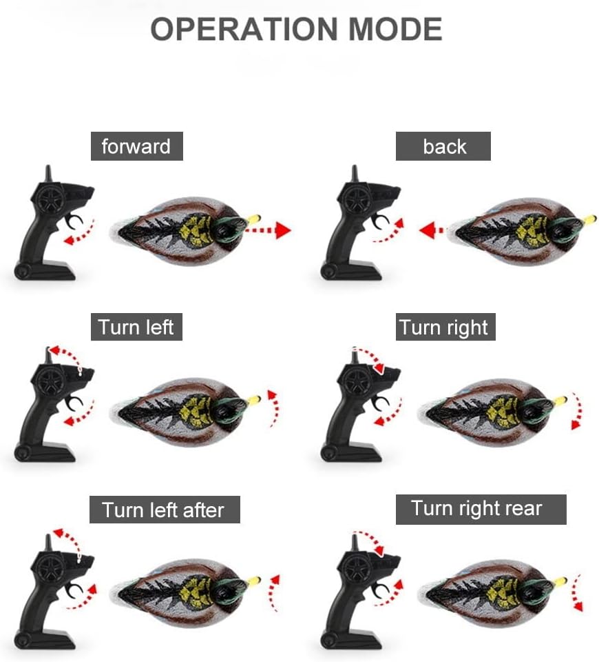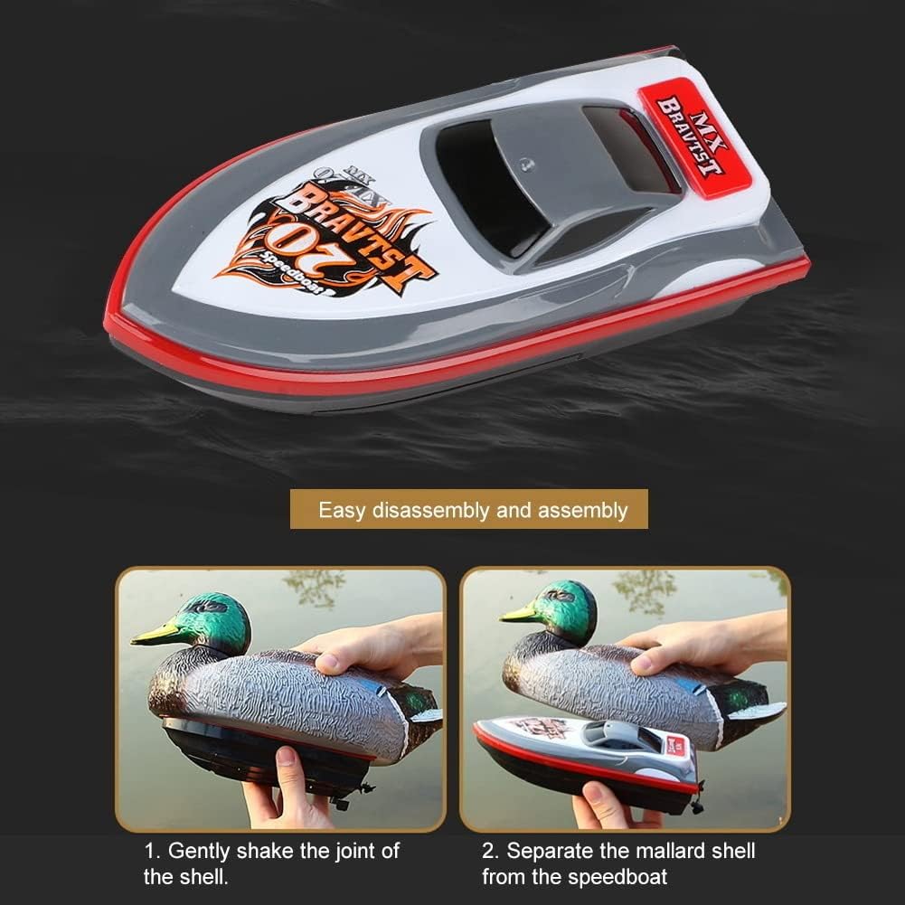 Funzione impermeabile: protezione da bassa tensione quando la tensione è troppo bassa. La velocità diminuirà automaticamente del 40%, ricordando ai consumatori di richiamare la barca telecomandata. Le prestazioni di tenuta sono buone perché la porta di ricarica è dotata di un tappo impermeabile in gomma e il fondo della barca è completamente sigillato con una regolazione impermeabile. Avvio stabile: L'albero di guida dell' è in con la de l' e può essere aperto rapidamente dopo aver rilevato il liquido. Allo stesso tempo, le eliche gemelle bilanciate vengono utilizzate per rendere il fuoribordo più fluido senza doversi preoccupare dell'inclinazione. Movimento: Quattro operazioni e indietro, simulando la velocità ed il movimento del vero e muoversi liberamente sul. 2. Telecomando a 4 GHz: con un telecomando a 2,4 GHz, la distanza del telecomando è più lontana e molte persone non saranno disturbate durante l'uso. La resina simula una testa d'anatra ed è di forma realistica. Precauzioni per l'uso: Simulare una barca telecomandata aiuta a prevenire parassiti, oche e altri uccelli acquatici di lasciare lo stagno. Guidare efficacemente gli uccelli acquatici e proteggere la piscina.