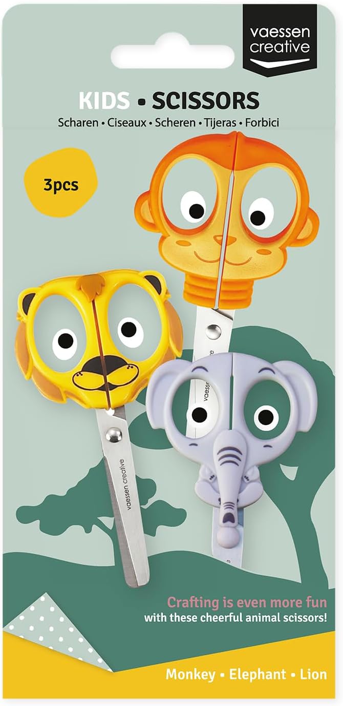 FORBICI PER BAMBINI – Questo allegro set di forbici è pensato per i piccoli creativi: ogni forbice ha un simpatico e colorato design animale che rende il taglio ancora più divertente SICUREZZA PER I PIÙ PICCOLI – Grazie alle punte arrotondate, le forbici sono sicure per bambini dai 3 anni in su; genitori e insegnanti possono lasciarli usare con tranquillità, sotto supervisione fino agli 8 anni PER MANCINI E DESTRIMANI – Le forbici sono adatte sia a bambini mancini che destrimani, offrendo comfort e precisione senza la necessità di modelli speciali QUALITÀ RESISTENTE – La combinazione di plastica robusta e acciaio inox rende queste forbici durevoli e perfette per un uso intensivo, per tante attività creative CONTENUTO DEL SET – Il set include 3 forbici creative da 12,7 cm ciascuna, ideali per bambini dai 3 anni in su; ogni manico ha un design a tema animale: scimmia, elefante e leone – per un divertimento ancora maggiore