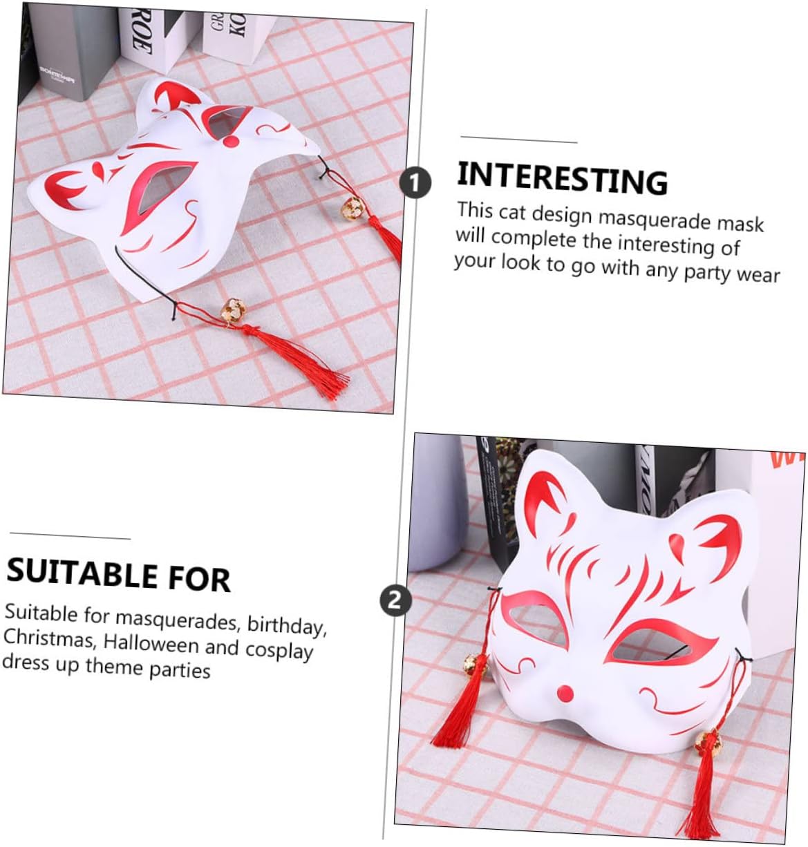 elenco dei pacchetti 2 maschere Caratteristiche - Adatto a varie attività: perfetto per danza in maschera, carnevale, danza, Halloween, festa di Natale, carnevale, danza, sfilata di moda, festa in costume, ecc. - Bellissimo e ben fatto: elementi adorabili e bellissimi motivi, molto adatti per le tue maschere cosplay in maschera. - finitura superba: nessuna caduta di vernice, nessun residuo di colla in eccesso, nessun gatto scolorito. -dimensioni: circa 19,00x17,50x0,10 cm/7,47x6,88x0 decorazioni per il ballo di fine anno. - colore: maschere rosse - materiale: maschere per gatti in plastica - taglia unica, questa maschera ha una fascia regolabile per adattarsi alla circonferenza della testa della maschera animale della maggior parte delle persone. - Indossa questa maschera da travestimento con nappe e campanelli, aggiungi alcuni nuovi elementi, sei una maschera da travestimento più attraente. Informazioni sul prodotto Maschere di stile Questo articolo è una maschera per travestimento, realizzata in materiale plastico leggero di alta qualità, comoda da indossare, adatta per costumi, feste da ballo, Halloween, feste in maschera, Natale, Capodanno. regalo per gli amici. eccellente lavorazione giapponese, squisito design a forma di gatto e forma, adorabile e alla moda
