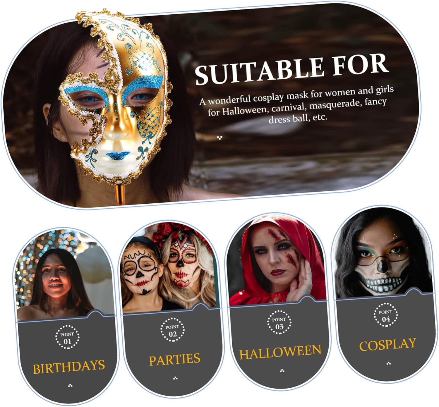 Elenco dei pacchetti 1 × Caratteristiche maschera in maschera - Colore: giocattolo scherzo blu cielo - Dimensioni: 50,50x12,50x5,00 cm/19,85x4,91x1 Maschera cosplay di Halloween. -materiale: decorazioni per feste in plastica - la maschera è una maschera di ruolo femminile perfetta per Halloween, carnevale, ballo in maschera, festa in maschera, ecc. - Realizzata in materiale plastico resistente, questa maschera è comoda in modo da poter indossare una maschera da festa in costume su un . - la maschera è anche un accessorio decorativo perfetto per i tuoi amici o familiari che parteciperanno sempre alle feste in costume. - fantastici accessori fotografici per scattare selfie e scattare foto con la famiglia e gli amici con questa maschera decorativa per feste. – Il suo design creativo ti farà sembrare più elegante e affascinante sull'ornamento della maschera da festa. Descrizione dei prodotti Maschera cosplay di Halloween Vuoi indossare una maschera personalizzata per un ballo in maschera o uno spettacolo di danza? questa semimaschera sarà una scelta! un bell'arredamento per farti risaltare alla festa. Maschera da festa del festival, una meravigliosa maschera cosplay per donne e ragazze per Halloween, carnevale, ballo in maschera, ballo in maschera, ecc.