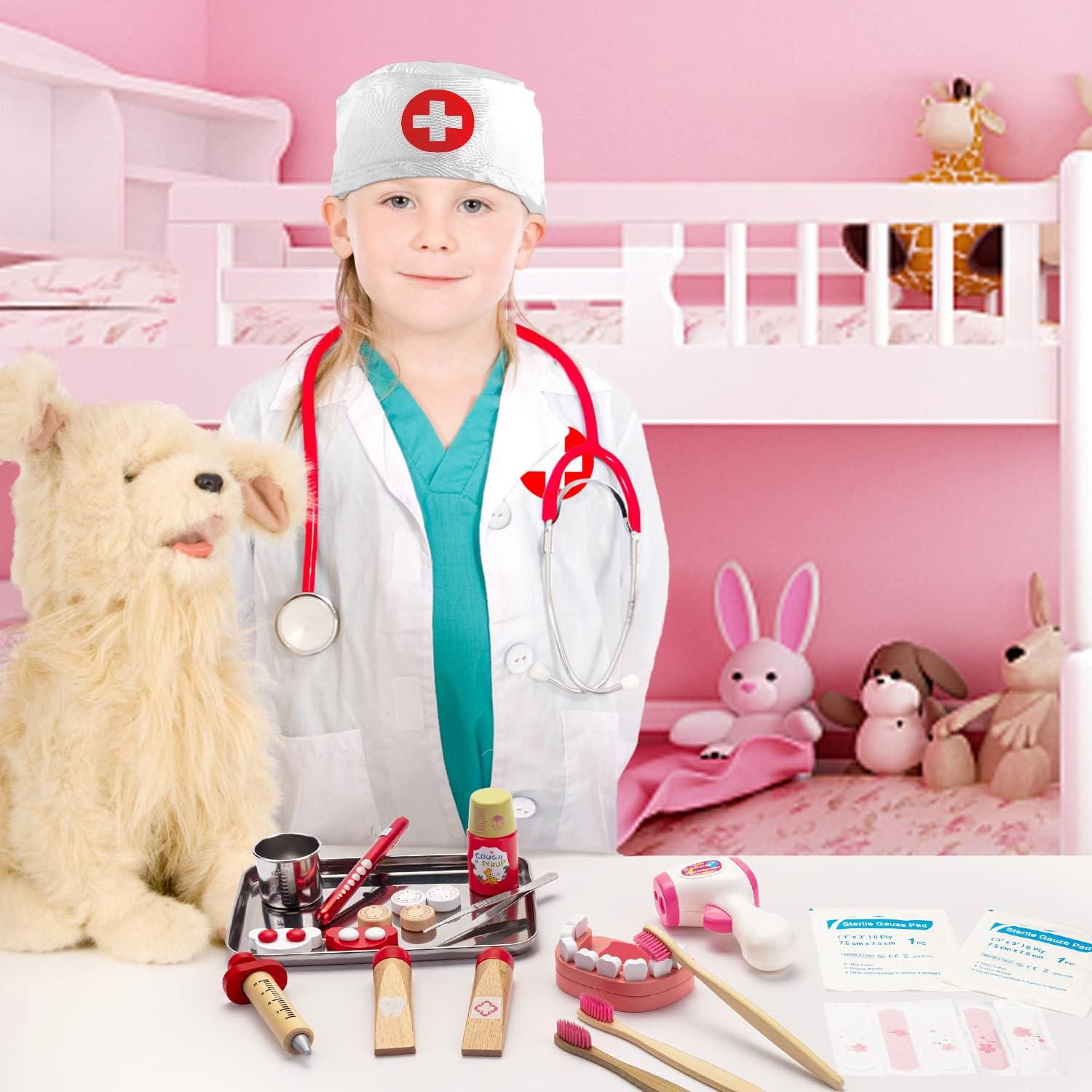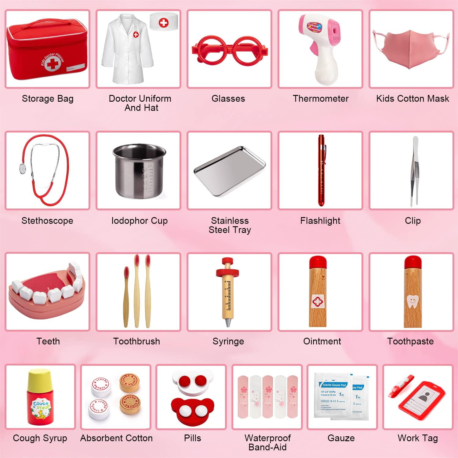 Set da gioco del medico da 32 pezzi: Include utensili medici realistici per il gioco di ruolo per esaminare e curare i pazienti. Numerosi accessori: incluso un vero stetoscopio, camice e cuffia da medico, vassoio, coppetta per iodio in acciaio inossidabile, siringa in legno, pinzette, capsule, cotone idrofilo, occhiali, termometro, protezione lavabile per bocca e naso, benda e vari utensili per la cura dei denti per la pulizia e il trattamento. Design a misura di bambino: bordi arrotondati in legno/plastica/acciaio inossidabile e parti testate per la sicurezza in dimensioni adatte ai bambini. La robusta borsa in tessuto è facile da maneggiare. Introduce i bambini al “vero mondo del medico” in modo giocoso. Effetto divertente e didattico: un modo giocoso per dissipare la paura delle visite dal medico promuovendo al tempo stesso il gioco fantasioso, premuroso e sensibile. Regalo ideale: Valigetta da medico per bambini dai 3 anni in su. Un regalo perfetto senza schermo per il gioco pratico, regalo perfetto per varie occasioni come feste, giochi di ruolo, premi di classe, regali di giocattoli per le vacanze, calze e compleanni.