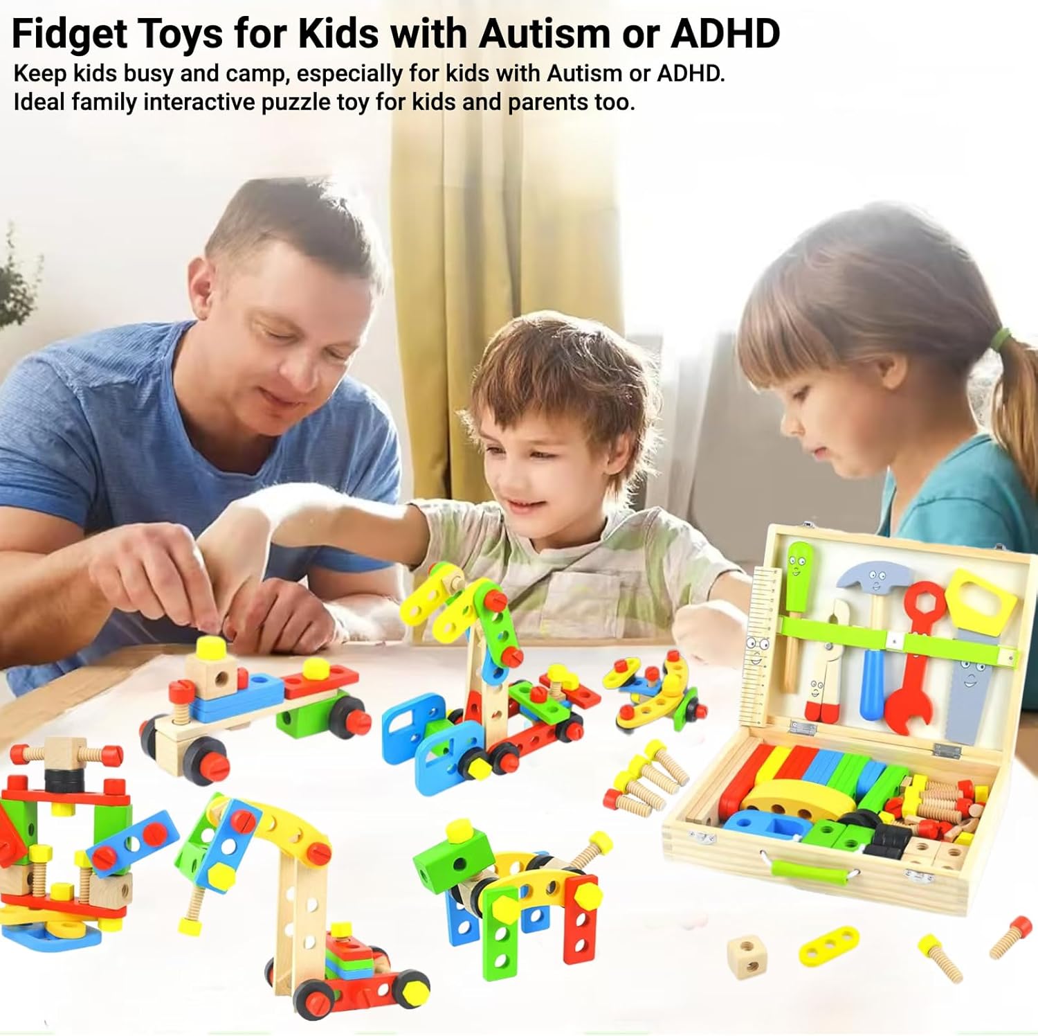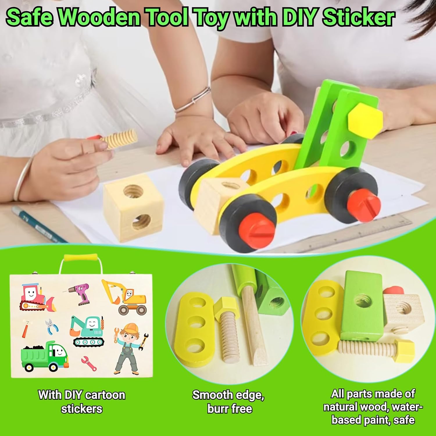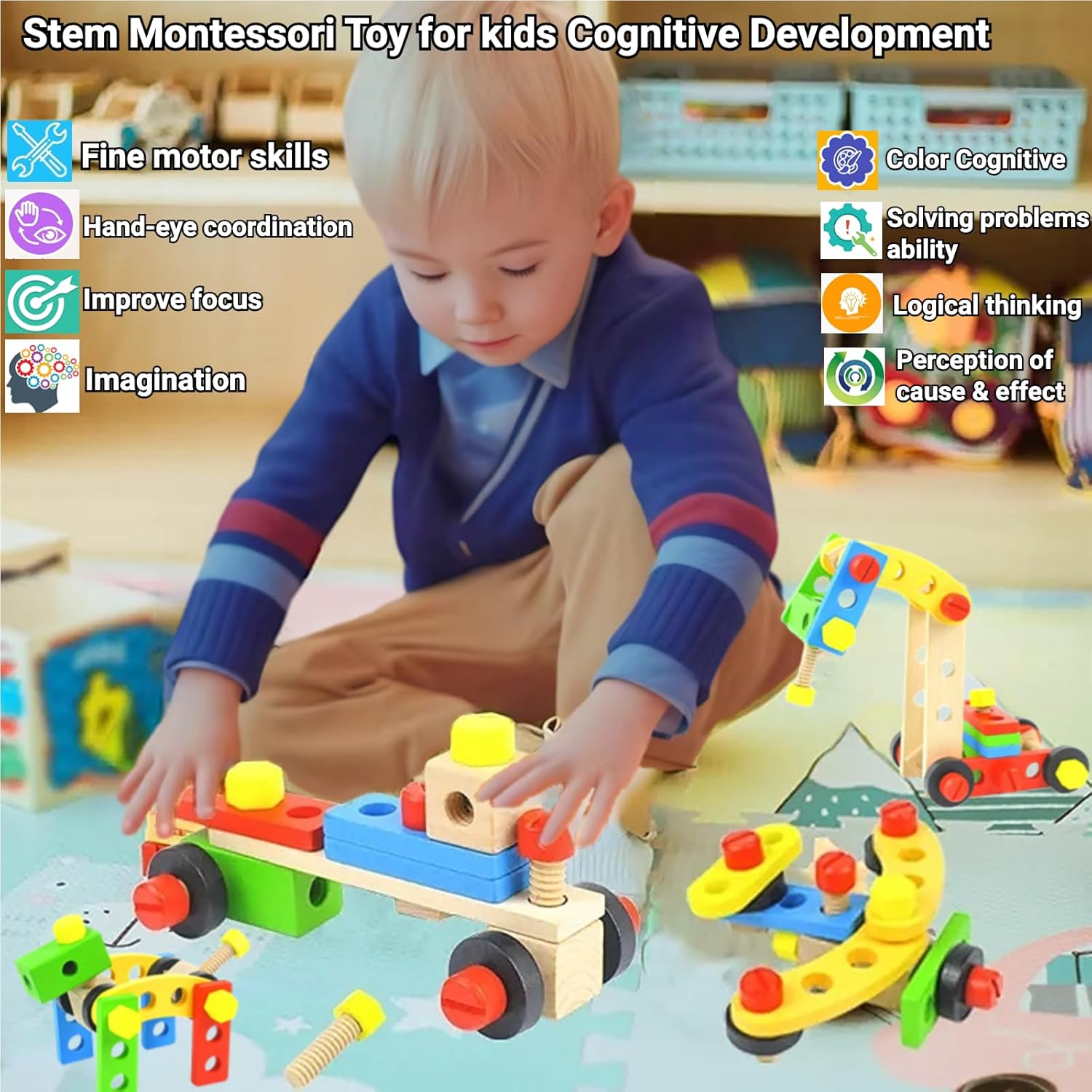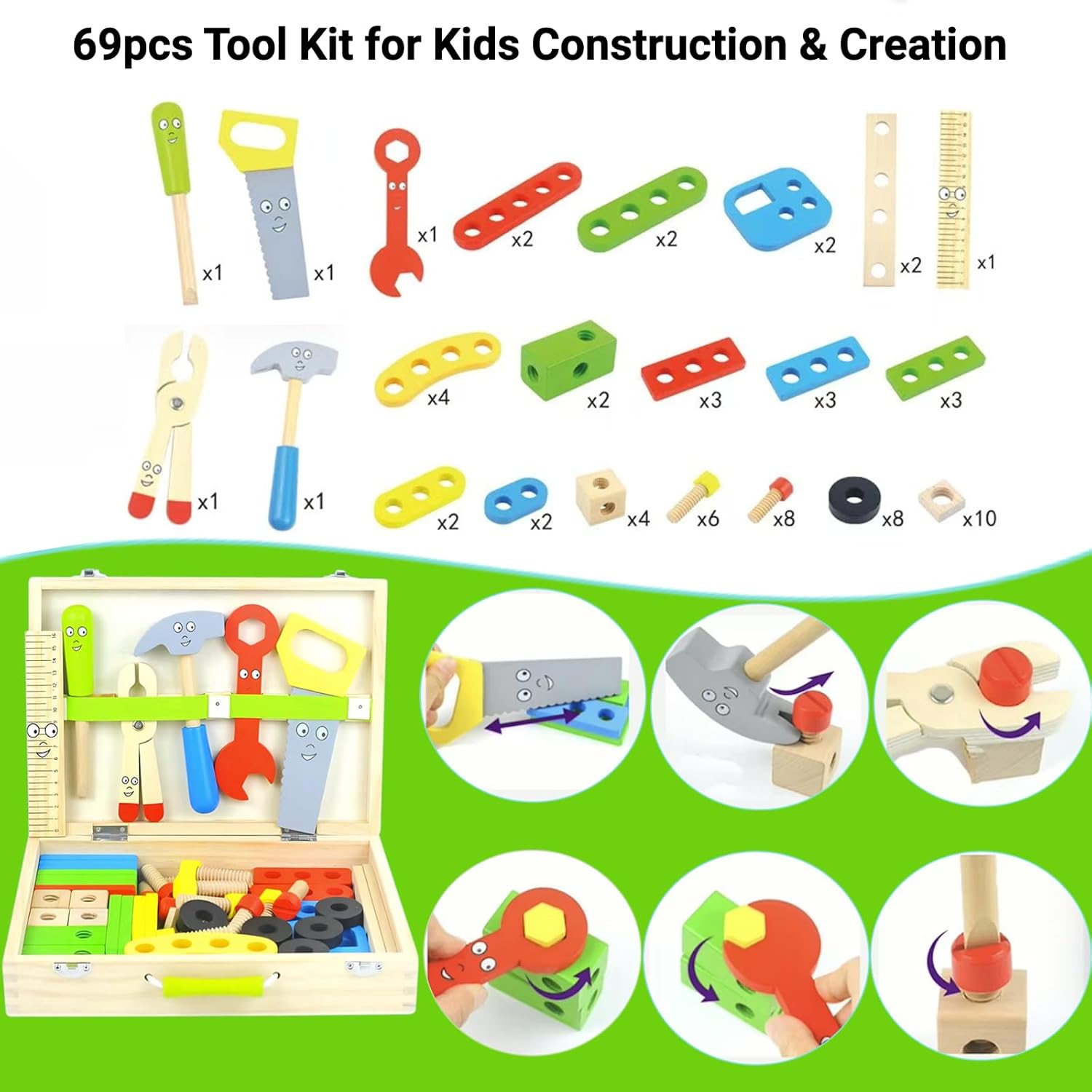 [Kit di attrezzi per bambini da 69 pezzi per costruzione e creazione per bambini] Il giocattolo di attrezzi in legno Zilynhom per bambini di 3-5 4-6 5-7 anni è dotato di 69 componenti tra cui martello, sega, cacciavite, viti, chiave inglese, righello, pinze, blocchi di costruzione, accessori per l'assemblaggio di giocattoli ecc. che consentono ai bambini di costruire e creare diversi modelli di giocattoli e animali come aeroplani, gru, carri armati, robot, carrelli, cani, cavalli, fiori ecc. Lascia che i bambini si divertano senza limiti. [Giocattolo Montessori Stem per lo sviluppo cognitivo dei bambini] Basato sul concetto educativo Montessori, questo giocattolo per la costruzione di steli stimolerà il lavoro pratico dei bambini e aiuterà a sviluppare le loro capacità motorie fini, l'ordinamento dei colori, la coordinazione occhio-mano, l'immaginazione, il pensiero logico, la capacità di risolvere i problemi, la percezione di causa ed effetto ecc. Lascia che i bambini imparino mentre giocano. Laboratorio di apprendimento precoce ideale per bambini e bambine dai 3 agli 8 anni. [Giocattoli Fidget per bambini con autismo o ADHD] Con strumenti colorati e decine di modelli da costruire, questo giocattolo da banco per attività sensoriali per bambini catturerà l'interesse e la curiosità dei bambini, li farà esplorare, tenerli occupati, calmi, liberare energia e divertirsi, specialmente per i bambini con autismo o ADHD. Giocattolo puzzle interattivo ideale per la famiglia, sia per bambini che per genitori. [Giocattolo di utensili in legno sicuro con adesivo fai da te] Tutti i componenti e gli accessori di questo giocattolo sensoriale in legno per bambini dai 3 ai 4 anni sono realizzati in legno naturale e massiccio, con bordi lisci, senza sbavature, senza sostanze nocive e sicuri per i bambini. Sono dotati di adesivi fai da te, lascia che i tuoi bambini si divertano di più, offrendo ai genitori un'esperienza di pace. [Il miglior regalo per bambini e servizio soddisfacente] I giocattoli Zilynhom Stem sono un regalo perfetto per compleanni, festa dei bambini, Ringraziamento, Natale e Capodanno per bambini dai 3 anni in su. Se hai problemi con i nostri giocattoli sensoriali per l'autismo per bambini piccoli di 3 4 5 6 7 anni, contattaci liberamente, ti offriremo il miglior servizio e la migliore soluzione per te.
