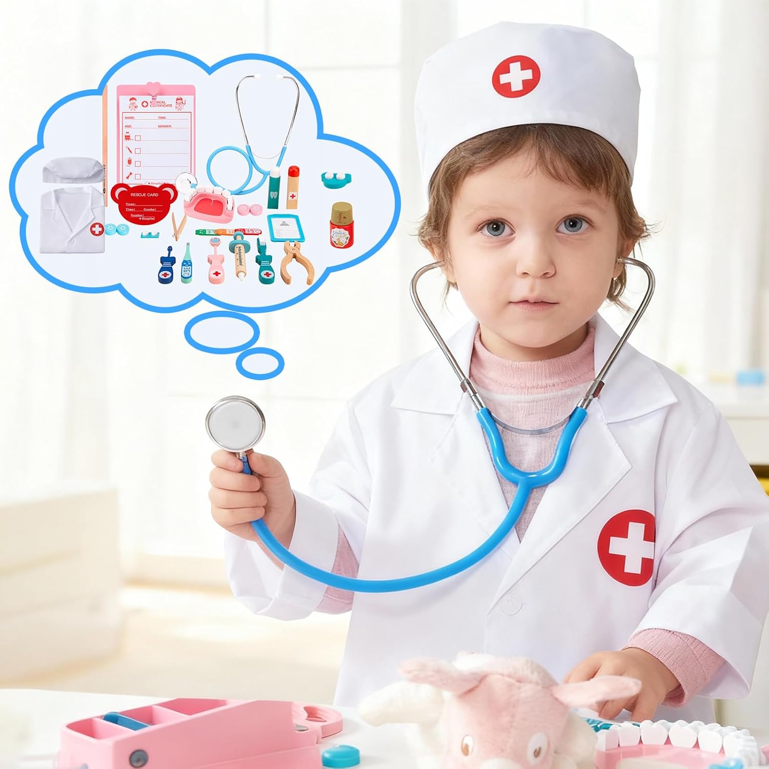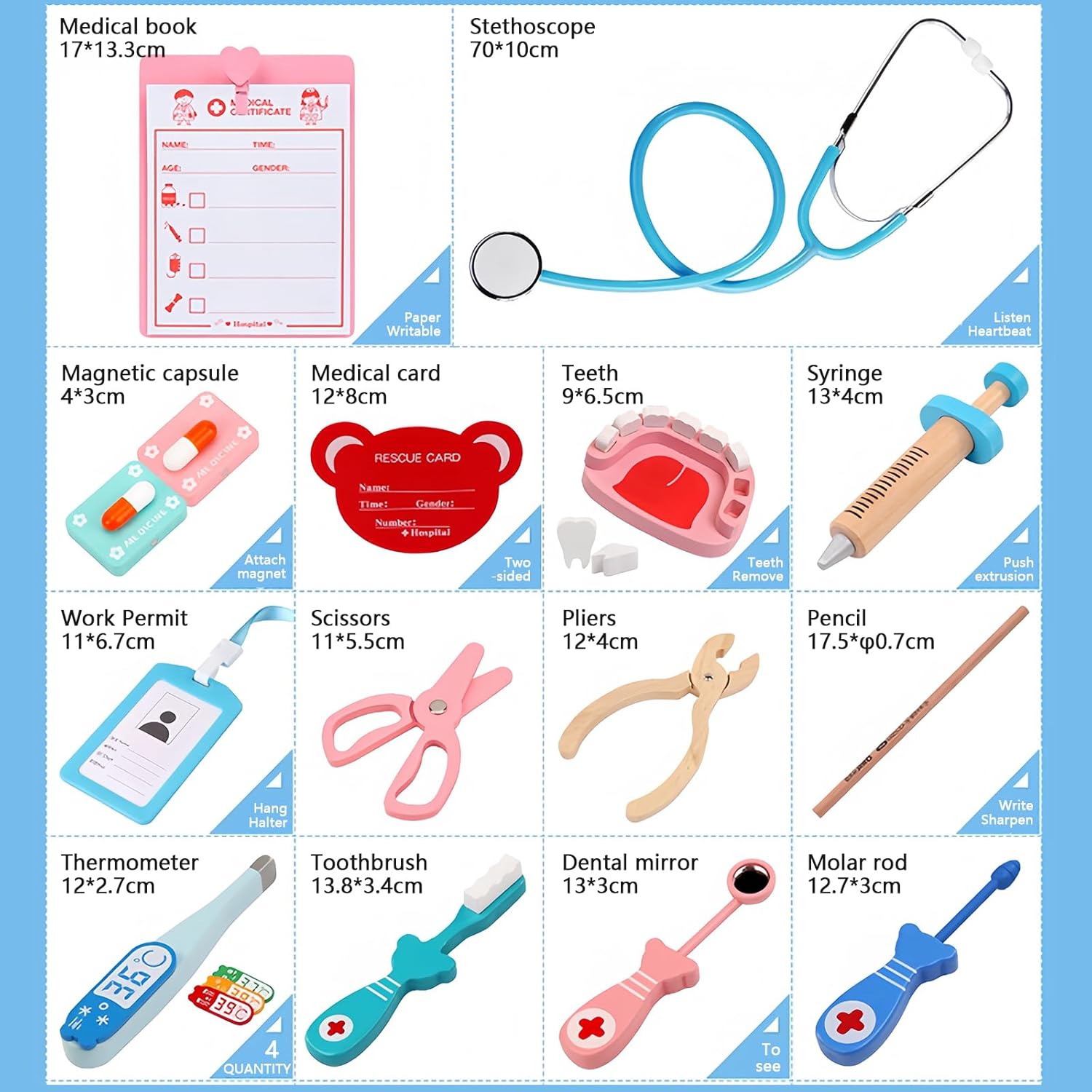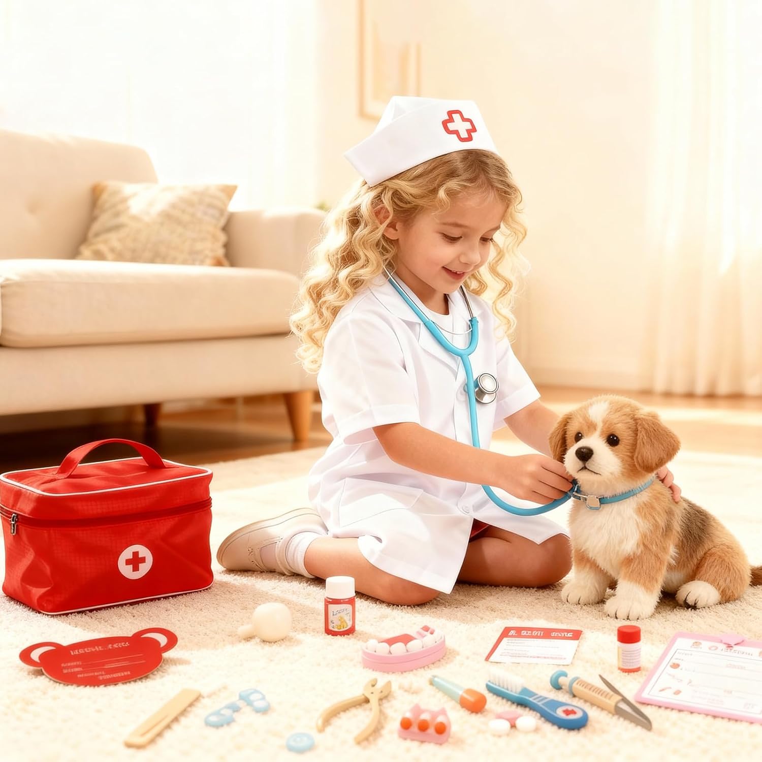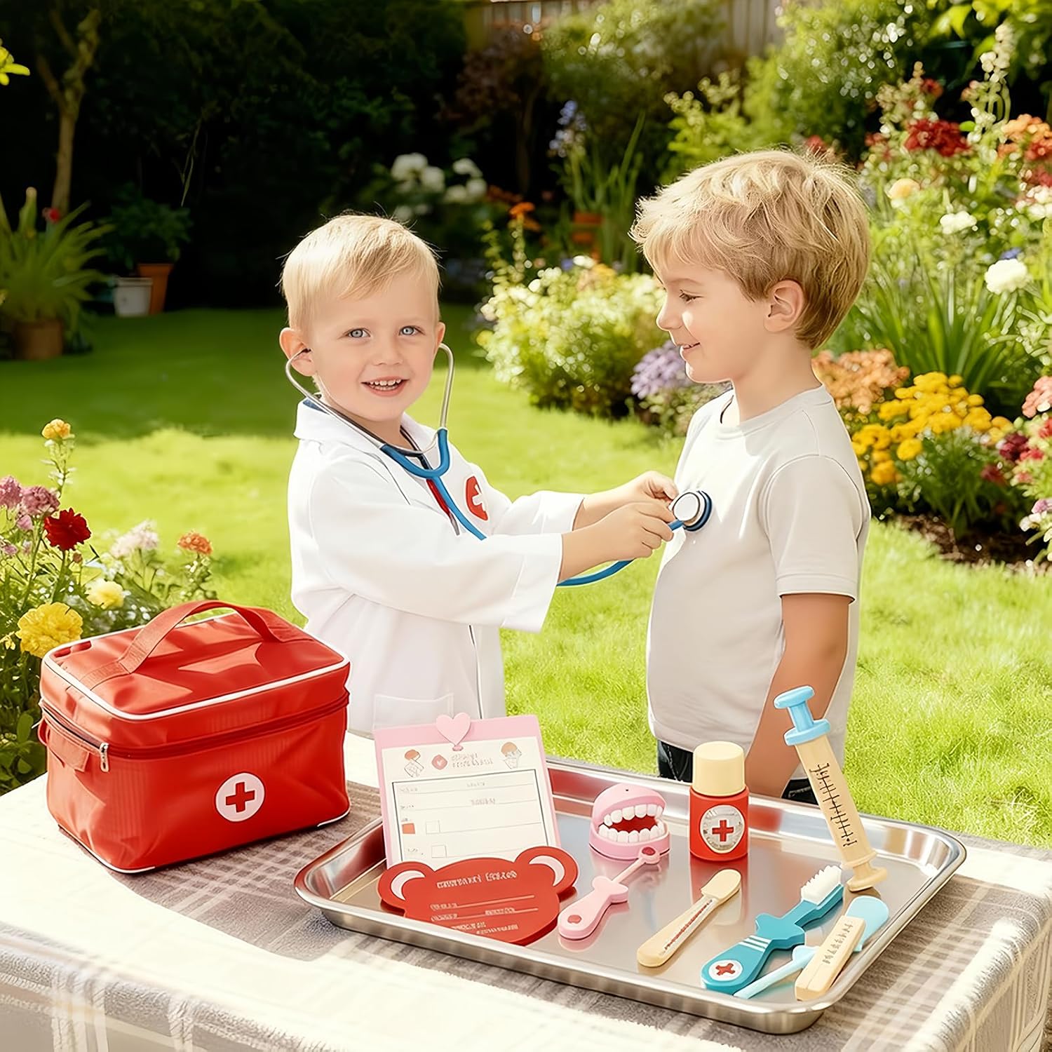Gioco di ruolo realistico: Stetoscopio funzionante (non invasivo), siringa a ritorno a molla, termometro scorrevole, “misuratore di pressione” a bracciale, bombola dell’ossigeno, benda, ricette mediche e altro per un check-up completo. Camice e cappello da dottore bianchi: Camice e cappello lavabili in lavatrice con chiusura a strappo e elastico regolabili; include badge nome scrivibile. Struttura sicura e atossica: Parti in legno lisce senza bave con vernice a base d’acqua; nessuna batteria; progettato esclusivamente per il gioco di finzione. Organizzazione portatile: Capiente borsa del dottore con divisori e scheda di controllo che incoraggia i bambini a mettere in ordine; leggera (circa 450 g) per viaggi e giochi a casa di amici. Educativo e rinforza la fiducia: Impara le parti del corpo e i nomi degli strumenti mentre si esercitano empatia e comunicazione; la “prova a casa” aiuta a ridurre l’ansia per le vere visite mediche. Durevole e facile da pulire: Pezzi in legno/ABS che si puliscono con un panno; tessili lavabili in lavatrice—ideali per casa, angoli di gioco drammatico della scuola dell’infanzia e sale d’attesa. Pronto per essere regalato: Look professionale bianco adatto a compleanni, festività, giornata delle professioni, recite scolastiche e feste di gioco di ruolo. Contenuto della confezione (~29 pz): Stetoscopio ×1, misuratore di pressione ×1, termometro ×1, siringa ×1, bombola dell’ossigeno ×1, benda, flacone di medicina, martelletto dei riflessi, otoscopio, ricettari, cartella con clip, camice e cappello bianchi, badge nome scrivibile, borsa da trasporto e altro (vedi lista in confezione).