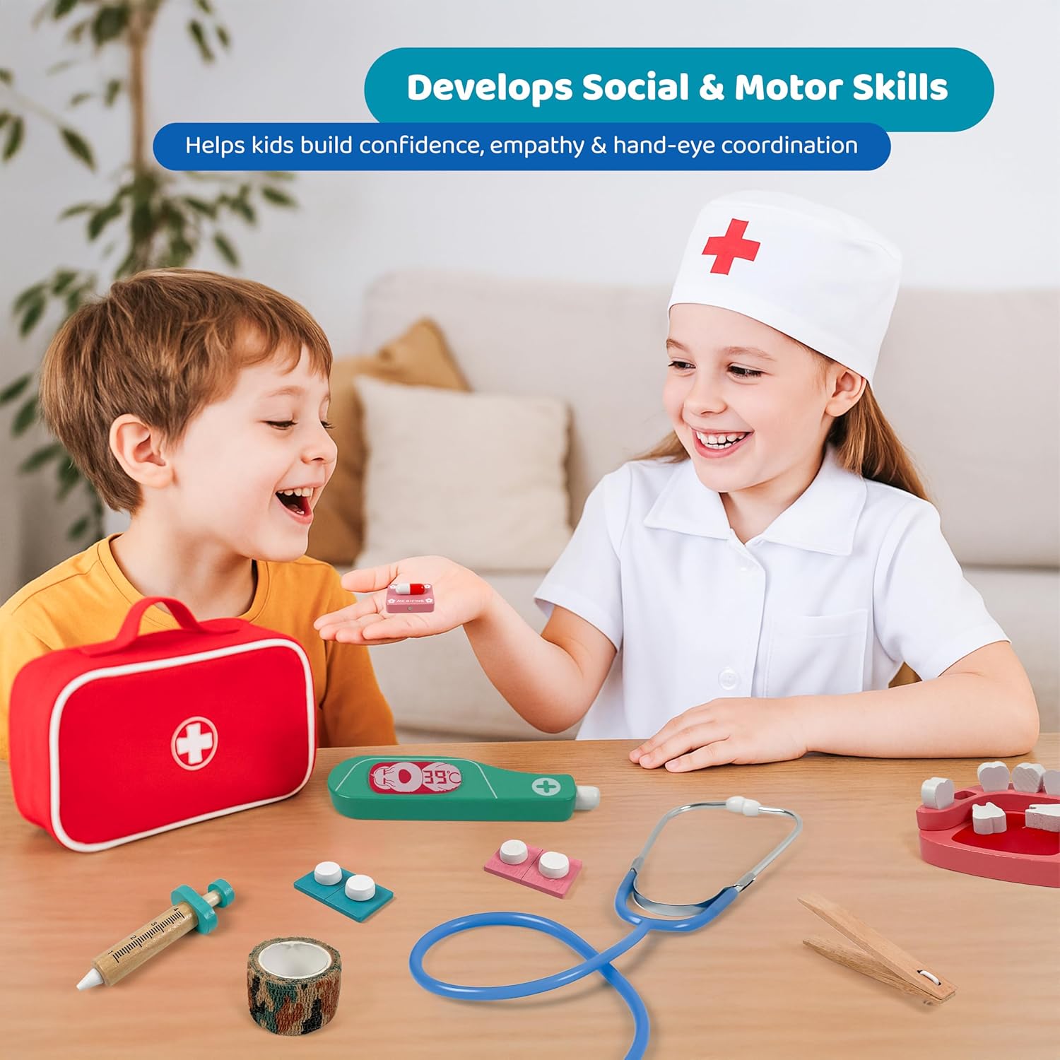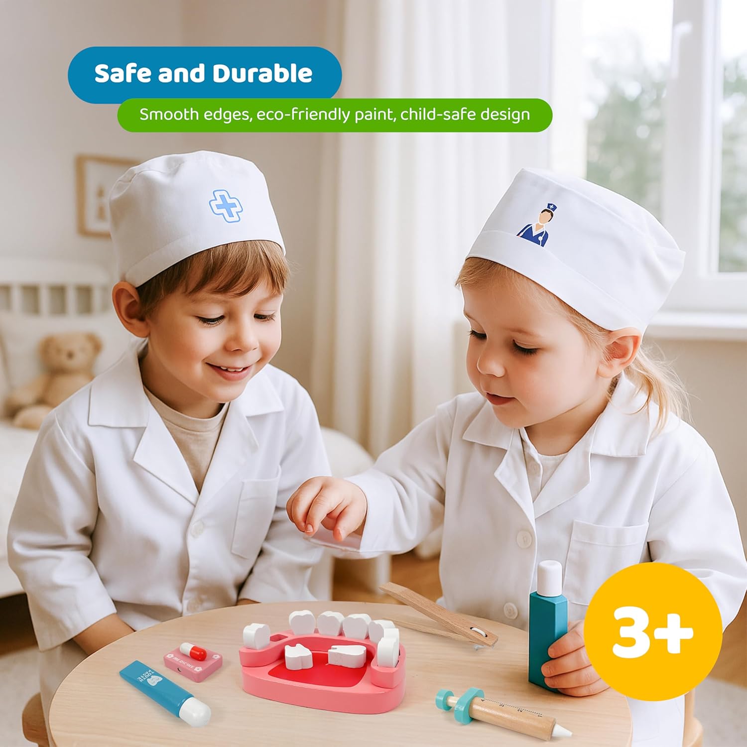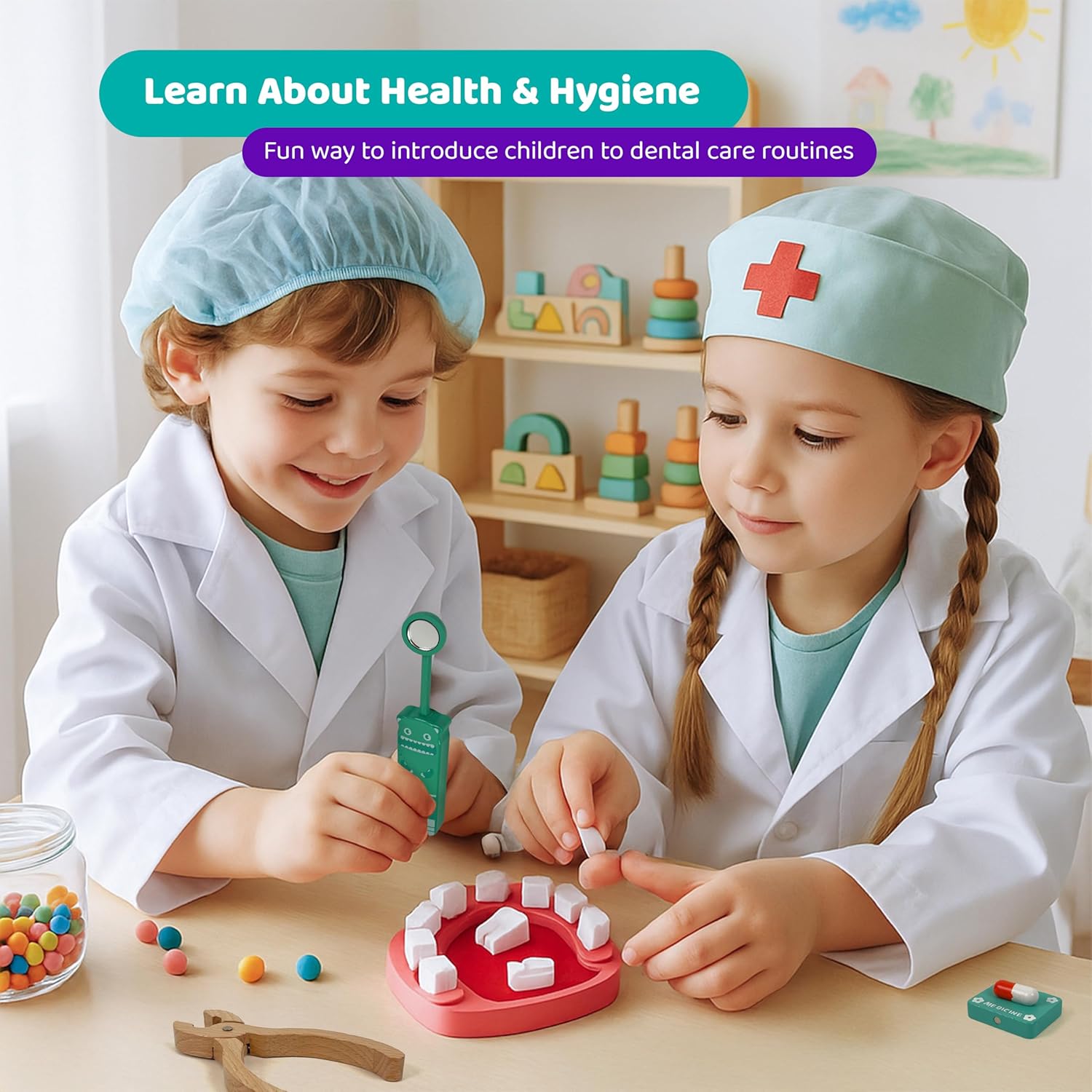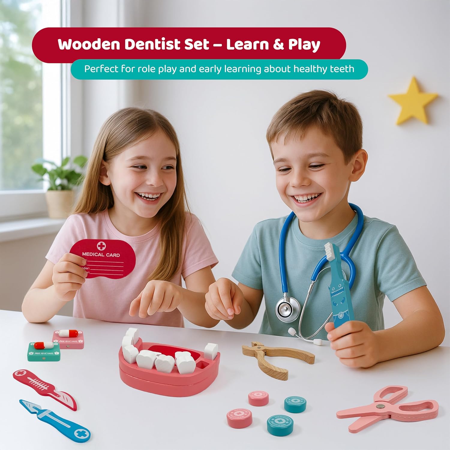 Scopri i denti giocosamente: con questo set di denti ricco di dettagli, i bambini possono imparare giocosamente come funziona un dentista. I denti mobili, gli spazzolini da denti e gli strumenti medici promuovono la comprensione della salute e dell'igiene. Stimola l'empatia e la fiducia in se stessi: il gioco di ruolo aiuta i bambini a ridurre le paure delle visite mediche. Riproducendo le visite dal dentista, sviluppano compassione, competenza sociale e rafforzano la loro autostima. Tutto in una valigia: i 34 pezzi – dallo stetoscopio alla siringa alle banconote – sono conservati in una robusta custodia per il trasporto. Ideale da portare con sé e per ore di divertimento, anche in viaggio Sicuro e adatto ai bambini: tutti i pezzi sono realizzati in legno resistente, dipinti con colori atossici e hanno bordi arrotondati. Perfetto per le mani piccole: sicuro e comodo da tenere in mano. Giocattolo educativo per piccoli esploratori: il set supporta le abilità motorie, la coordinazione occhio-mano e stimola il pensiero creativo. Un regalo ideale per i bambini dai 3 agli 8 anni per imparare, giocare e stupirsi.