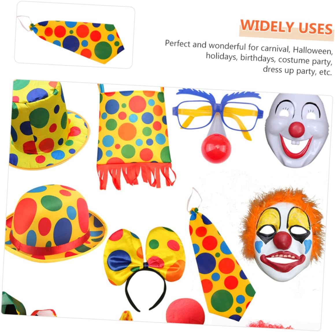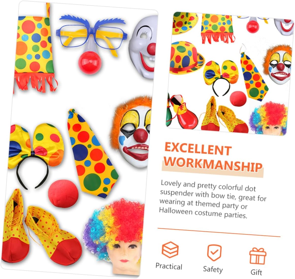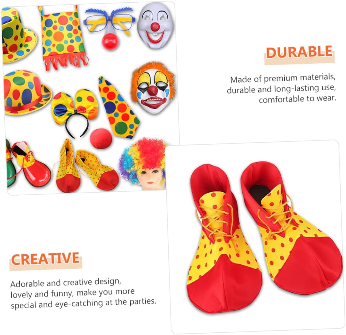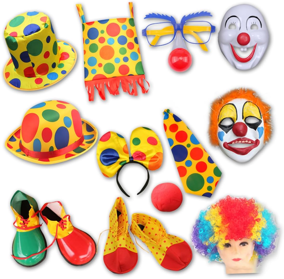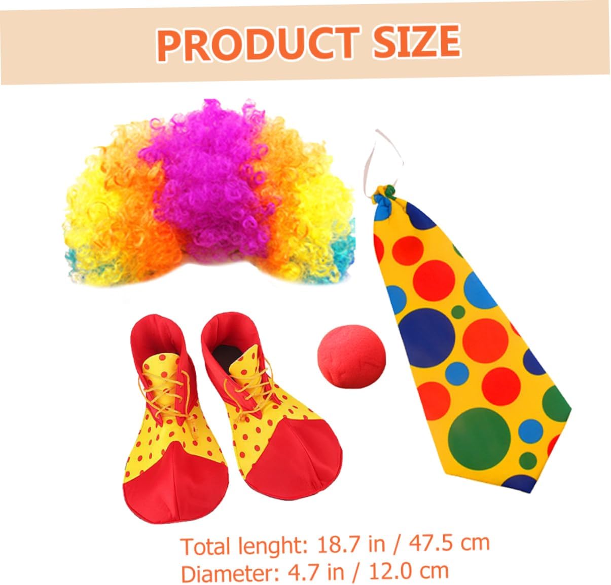 dei 1 x naso finto 1 x cravatta 1 x parrucca 1 x paio di scarpe Caratteristiche - Dimensioni: 47,50X12,00X0,20cm, 37,00X18,00X7,00cm/18,67X4,72X0,08in, 14,54X7,07X2,75in naso da clown - Materiale: cravatta da clown in tessuto - Colore: Costume da clown di Halloween con assortiti - Sono facili e comode da indossare e ti regalano un'esperienza piacevole con la cravatta da clown di Halloween. - Adatto alla maggior delle persone, come donne, uomini e , ti regala un'esperienza di utilizzo piacevole con le scarpe da clown cosplay. - Puoi acquistarli per te stessa o regalarli alla persona amata, regalale un piccolo costume da clown a per donna. - Una combinazione di parrucca, naso e cravatta per rendere il tuo costume da clown un accessorio divertente e accattivante. - Ampio utilizzo, adatto per feste di compleanno, eventi scolastici, feste di Natale, Halloween e altri costumi da clown cosplay per eventi speciali. Informazioni sulle merci Costume da clown per feste: usalo per travestirti da clown e fai ridere i tuoi , amici o familiari. Il kit per il costume da clown ti piace o piace ai tuoi ? Stai organizzando una festa per un'occasione speciale? Se sì, non cercare oltre, questi accessori per il costume da clown saranno la scelta migliore per te.