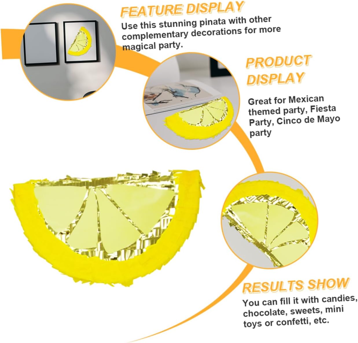 Piñata al limone: il design a forma di limone è elegante e affascinante e aggiunge bellezza e colore alla tua casa. con giocattoli di piñata pieni. Piñata messicana: questa tradizionale piñata messicana è fatta di carta e decorativa, piñata per la festa, piñata messicana: il design a forma di limone è creativo e carino e aiuta a creare ricordi divertenti. Piñata al limone fatta a mano Piñata di compleanno - puoi riempirla con dolci, cioccolato, caramelle, mini giocattoli o coriandoli ecc. Tradizionale piñata messicana Giocattolo della piñata al limone - adatta per riunioni di famiglia, feste di compleanno, feste del Cinco de Mayo, Natale ecc., con piñata ripiena