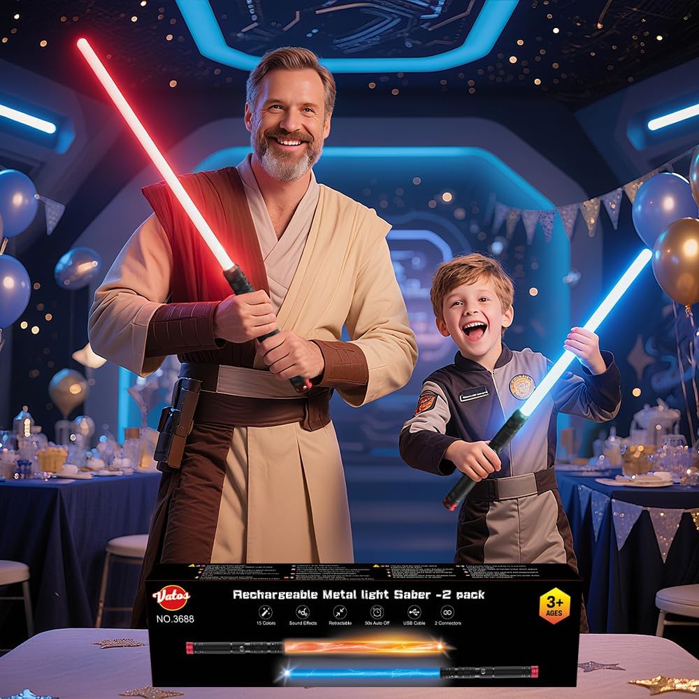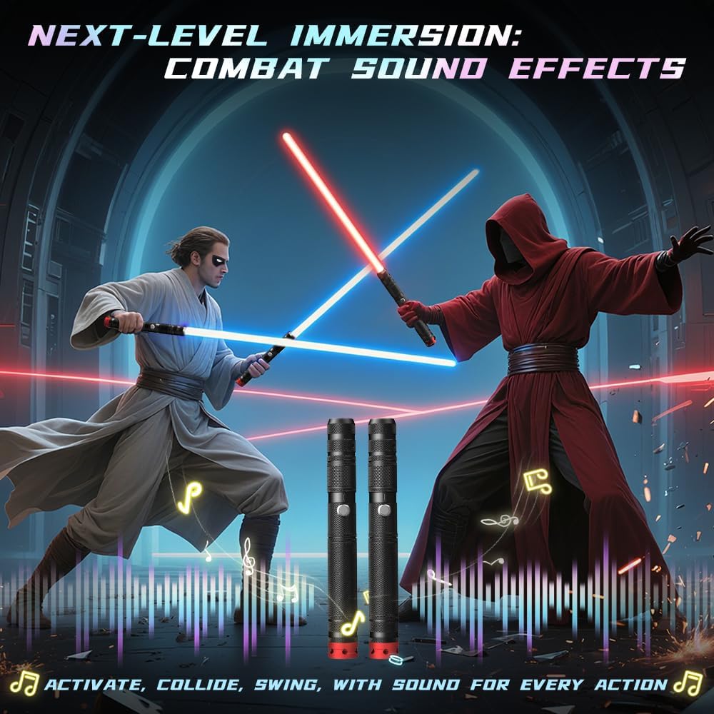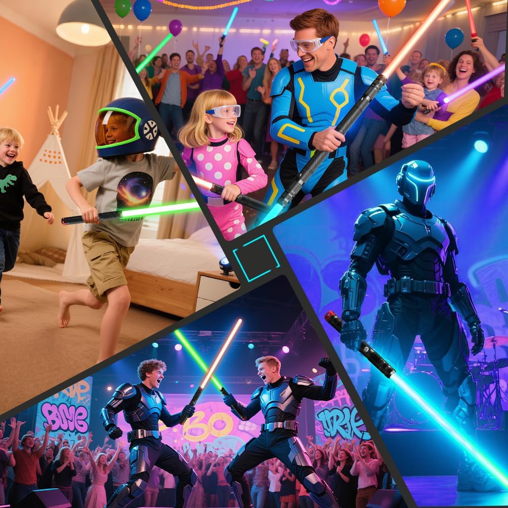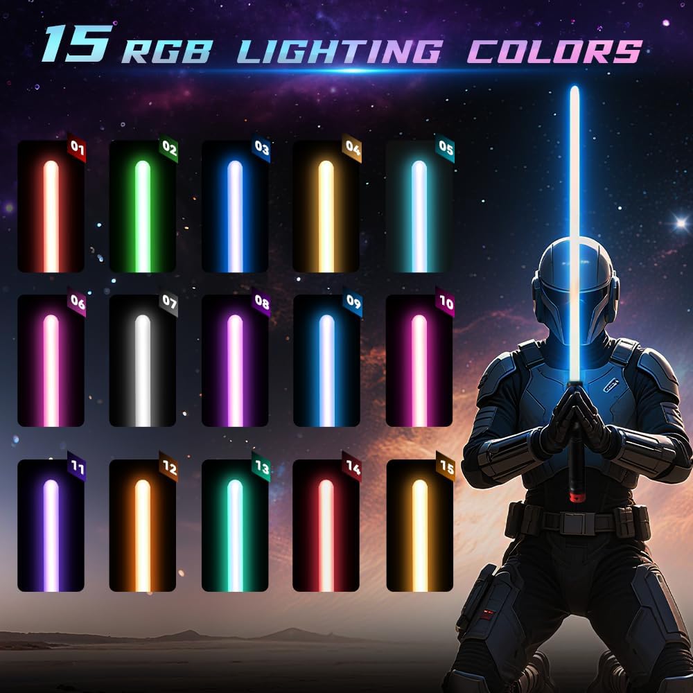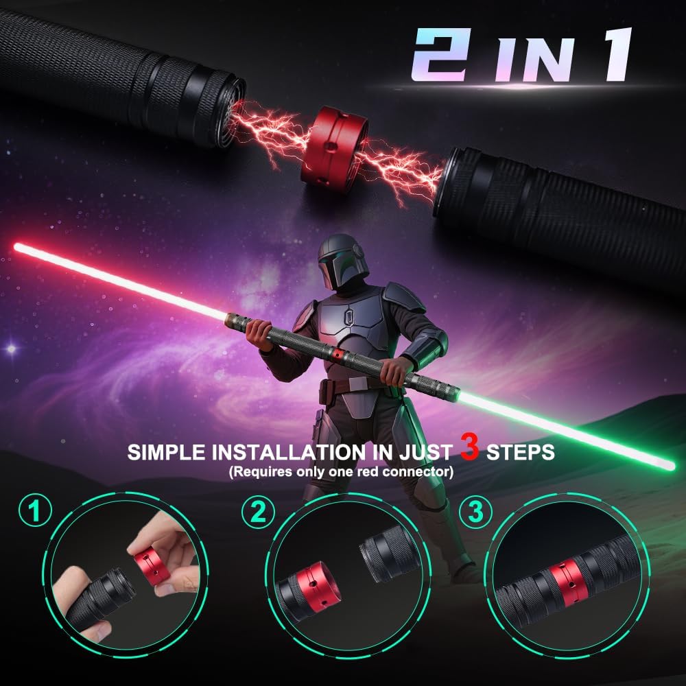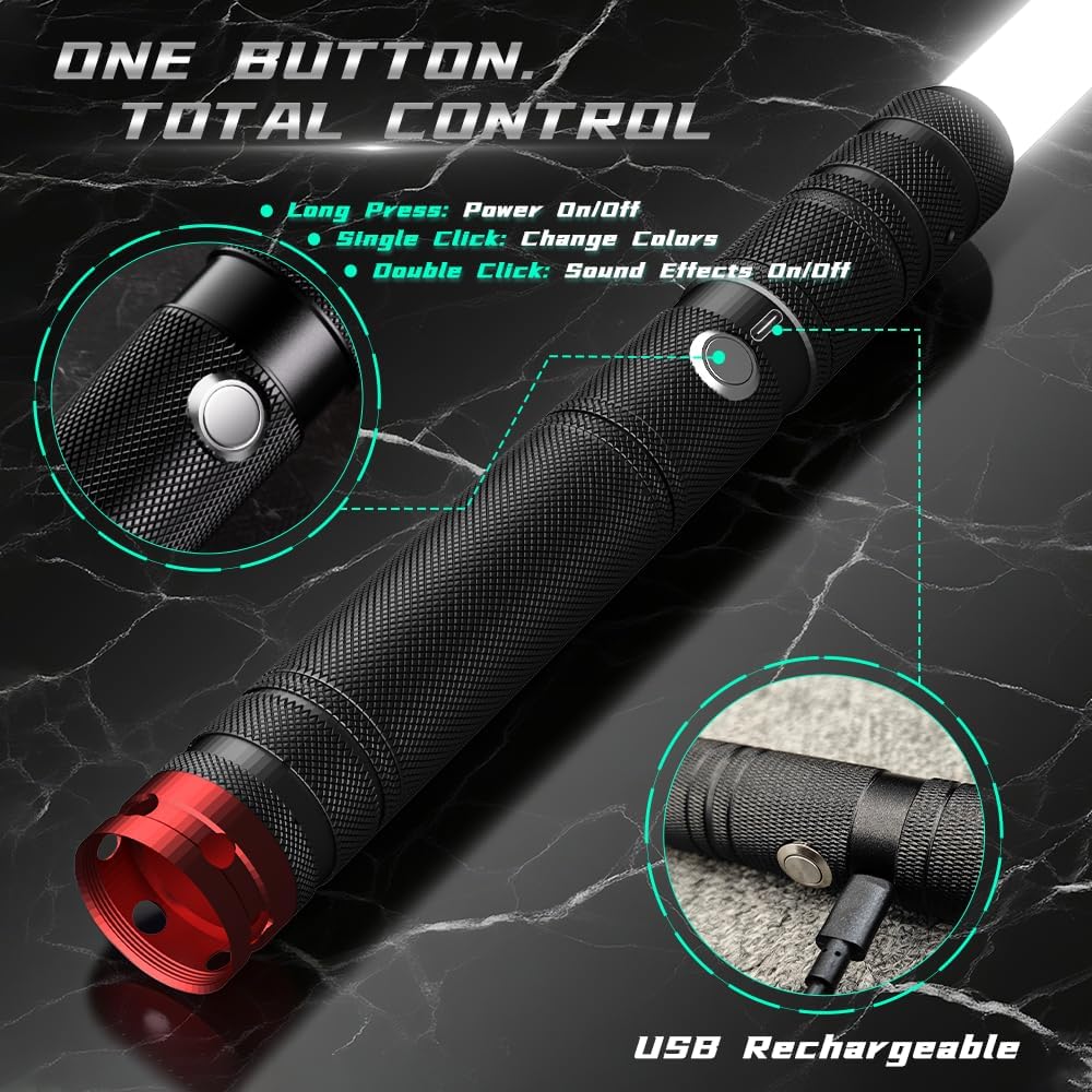 【Spada laser in metallo ricaricabile tramite USB】 L'impugnatura in lega di alluminio accuratamente realizzata con design a filettatura antiscivolo garantisce una sensazione eccellente e fornisce una presa stabile. Il tubo luminoso in PC ispessito migliorato emette luce intensa, meno incline alla rottura. È dotato di una batteria al litio ricaricabile integrata che viene caricata tramite un'interfaccia di tipo C e fornisce 3-5 ore di funzionamento. Il design complessivo è semplice e durevole, rendendolo adatto sia ai collezionisti che all'uso quotidiano., Spettacolo di luci RGB a 15 colori: dal rosso fuoco al verde brillante al blu intenso, ci sono 15 colori vivaci tra cui scegliere. Puoi passare da un colore all'altro con la semplice pressione di un pulsante. Mentre i bambini si dondolano e si scontrano con la spada laser, le luci lampeggiano e danzano automaticamente, rendendo l'esperienza ancora più vivace ed emozionante. Tutti i colori sono creati con LED di alta qualità che forniscono una luce morbida, uniforme e priva di abbagliamento, garantendo sicurezza e offrendo al tempo stesso un'esperienza visiva meravigliosa.,Effetti sonori di battaglia coinvolgenti: i suoni di battaglia realistici danno vita all'esperienza di gioco. Dopo l'attivazione si sentirà un caratteristico tono di avvio che suona come un "ronzio". Durante le battaglie, le armi si scontrano con suoni di combattimento fantastici e unici. Ogni effetto è stato realizzato con cura per fornire un'esperienza di combattimento coinvolgente. Se preferisci il silenzio, tocca semplicemente due volte l'interruttore per disattivare immediatamente l'audio.,Design di montaggio 2 in 1: fornisce opzioni di gioco più flessibili. Due spade laser indipendenti possono essere facilmente combinate in un'unica spada lunga utilizzando il connettore rosso integrato. Ogni spada laser è lunga 65 cm, il che la rende ideale per i bambini che possono tenerla con una mano. Quando le due spade laser vengono combinate utilizzando il connettore rosso, la lunghezza totale raggiunge 127 cm e si trasforma istantaneamente in una maestosa spada lunga (Nota: è necessario solo un connettore rosso per connettersi). Che si tratti di Halloween, Natale, compleanno o cosplay di tutti i giorni, attirerà sicuramente l'attenzione. È perfetto anche per l'interazione genitore-figlio. Genitori e bambini possono impugnare insieme la spada laser in battaglie sicure e divertenti, creando momenti familiari indimenticabili