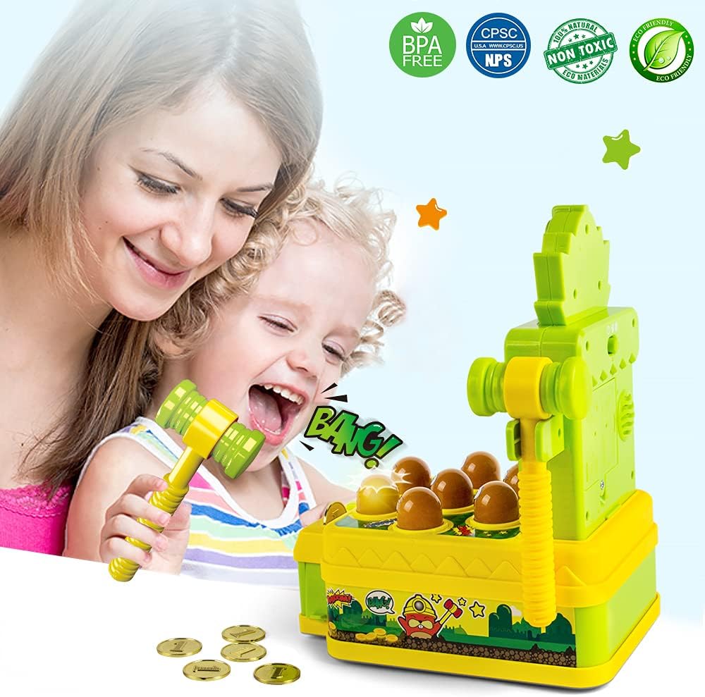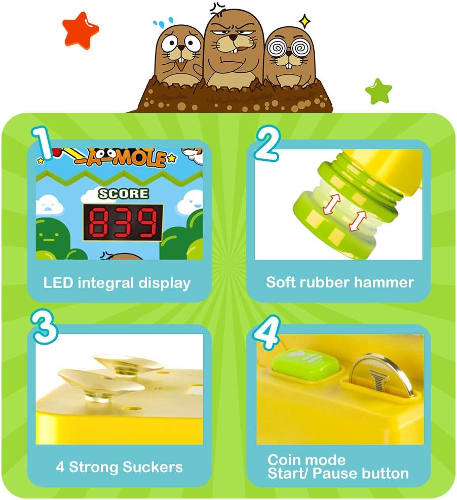 【GIOCO WHACK (Hit the Mole)】 Tutti i bambini adorano il gioco Whack (Hit the Mole), un popolare gioco arcade dagli anni '70. Ora puoi portare a casa questo giocattolo da tavolo in miniatura per i più piccoli. Sarà sicuramente una sorpresa per i tuoi bambini. 【OTTIMO GIOCATTOLO PER LO SVILUPPO】 Il gioco VATOS Whack è perfetto per tutte le età dai 3 anni, per tutti i gusti e tutte le occasioni, come feste, festival, educazione prescolare, regali. Può favorire la coordinazione occhio-mano, allenare le capacità motorie, aumentare la concentrazione, favorire la comunicazione interpersonale colpendo i nei che si illuminano. Eccellente giocattolo interattivo per ragazzi e ragazze dai 3 anni in su., LONTANO DALLO SCHERMO E VERSO IL TEMPO DELLA FAMIGLIA: Lascia la TV, il cellulare, il computer; Genitori e figli possono fare un gioco di famiglia Whack per aumentare l'interazione genitore-figlio e riaccendere la serata familiare. Non battere ciglio, impugna il martello, concentrati sul mini gioco arcade elettronico, colpisci le talpe illuminate per sommare il punteggio. Più questo viene fatto, più alto sarà il punteggio finale. 【DIVERTIMENTO E SICUREZZA PRIMA DI TUTTO】 Il giocattolo per bambini è stato certificato da un laboratorio di terze parti come non tossico e privo di piombo/BPA/ftalati. I suoi bordi lisci, il design unico, liscio e unico e la sua durata consentono ai bambini di giocarci in sicurezza. Viene fornito con 2 martelli morbidi; i bambini non si fanno male. I giocatori possono ottenere un punteggio elevato individualmente o sfidare amici e familiari! Sono necessarie 3 batterie AA (non incluse). 【ESPERIENZA DI GIOCO ARCADE ELETTRONICO REALISTICO】 Il gioco a impatto offre 2 modalità: modalità di gioco di prova e modalità moneta. Visualizzazione elettronica del punteggio sanitario e contatore del punteggio, effetti sonori autentici, simpatiche talpe, proprio come nel gioco originale. Esistono più livelli, ciascuno crescente di un livello; il livello di difficoltà aumenta