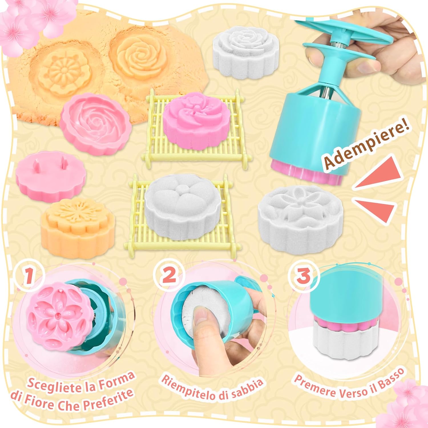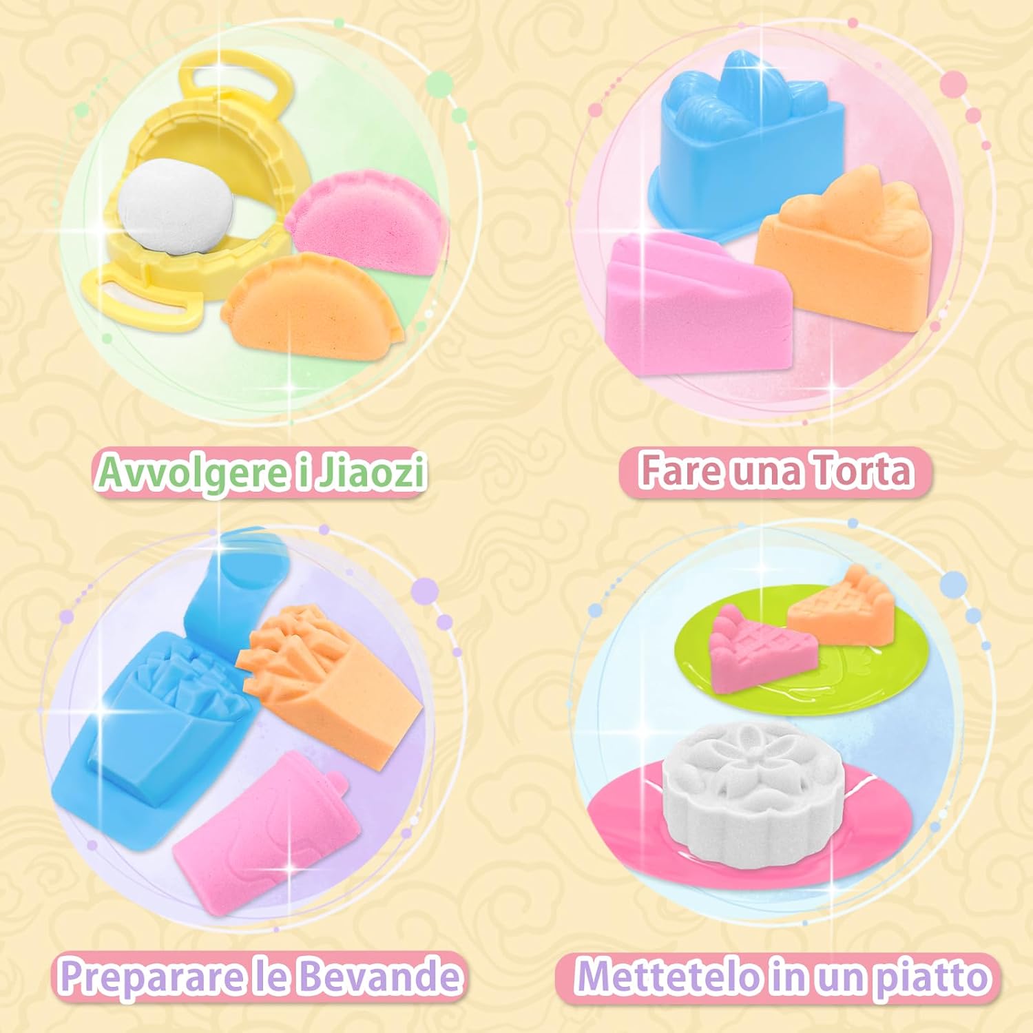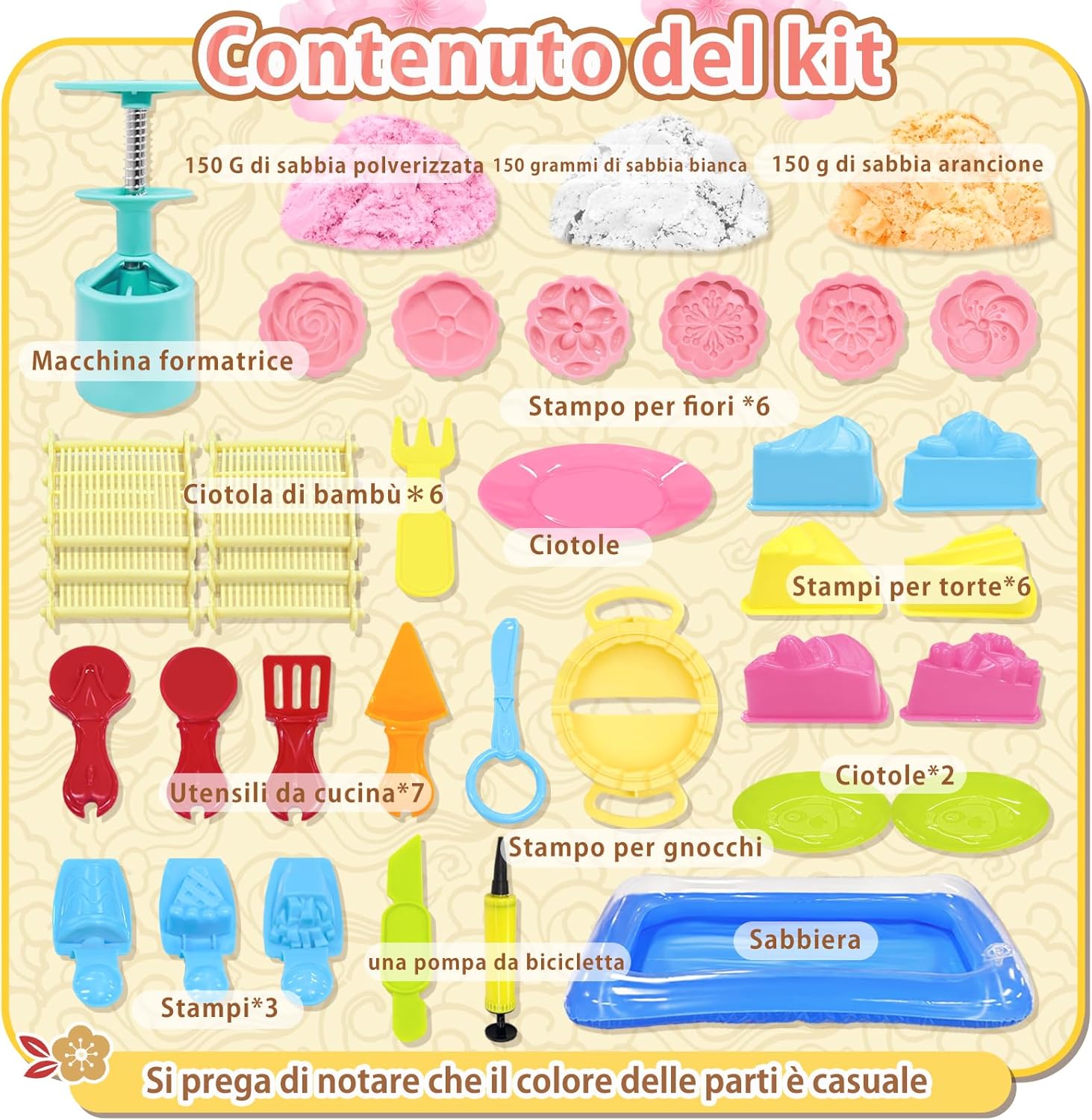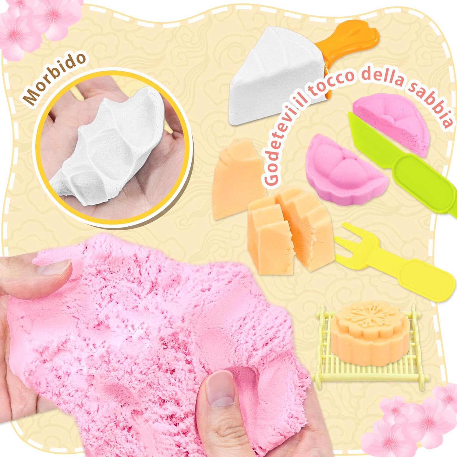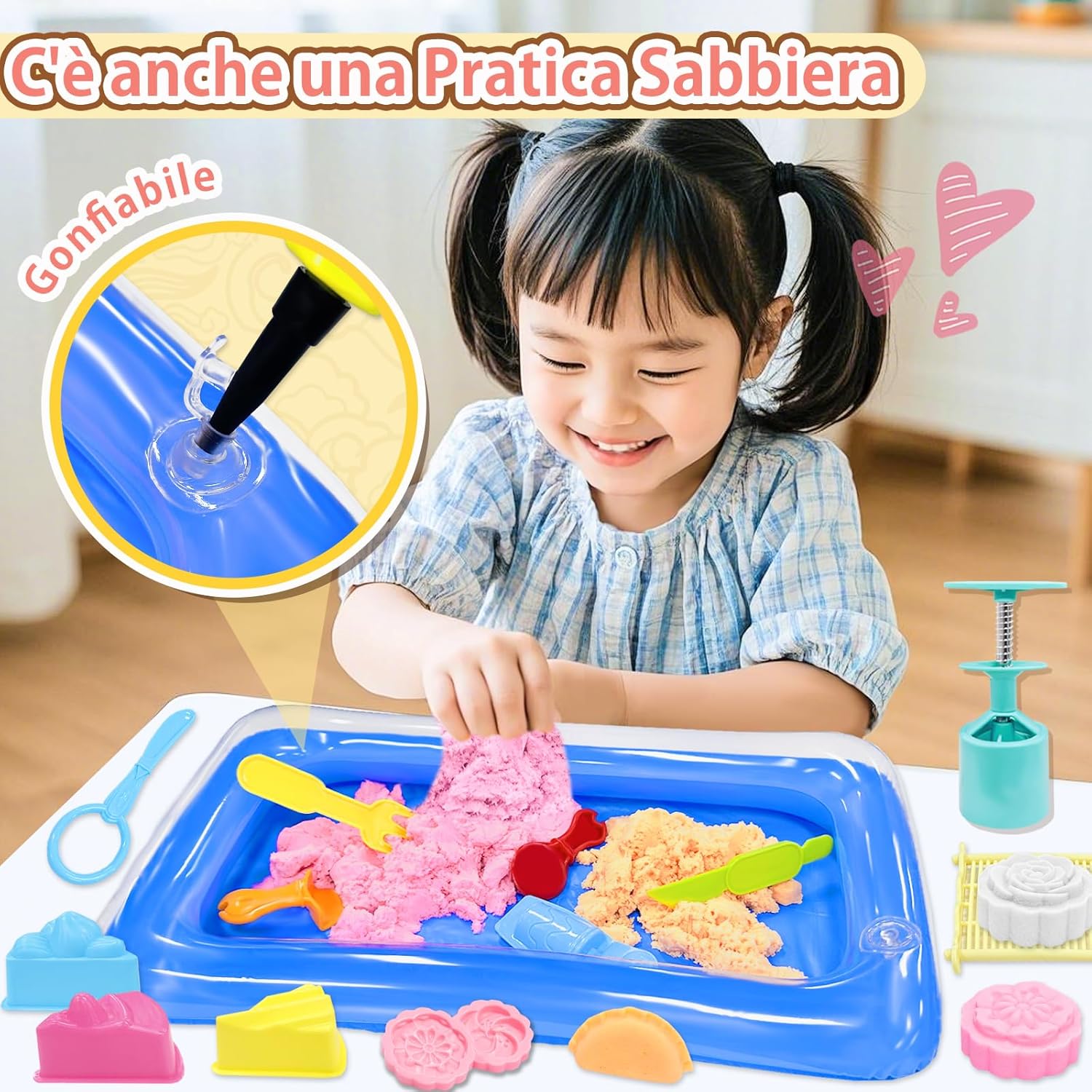 Kit Sabbia Magica: il set di giocattoli Sabbia Magica contiene 32 strumenti, tra cui uno stampo per mooncake, una tortiera, 3 confezioni di Sabbia Magica di diversi colori, una pompa, una sabbiera gonfiabile e strumenti per la sabbia che permettono ai bambini di sperimentare il divertimento di preparare il cibo incoraggiando la creatività attraverso il gioco Creatività illimitata: i bambini possono usare stampi per mooncake e tortiere per usare la loro immaginazione e creare la magia della sabbia in forme diverse, per migliorare le loro abilità pratiche ed estetiche Facile da pulire e da riporre: Il set di giocattoli Magic Sand è dotato di una pompa e di una sabbiera gonfiabile. I piccoli usano la pompa per gonfiare la sabbiera, che non solo è progettata per proteggere efficacemente la sabbia dalla dispersione e facile da pulire, ma aiuta anche a migliorare la coordinazione occhio-mano dei bambini Il tocco meraviglioso della sabbia sensoriale: la consistenza unica della sabbia magica, simile alla farina fine, permette ai bambini di sentire il flusso e la plasticità della sabbia sulla punta delle dita, e i bambini possono anche usare gli strumenti di sabbia per scavare, impilare e modellare per coltivare il senso spaziale e le capacità di pensiero logico Regali per bambini: i genitori possono accompagnare i loro figli a giocare insieme e creare dolcetti di sabbia magica per migliorare il rapporto genitori-figli e rendere la vita familiare più armoniosa, VBACALA Magic Sand è un perfetto regalo per bambini, regalo di compleanno, regalo di Halloween, regalo di Natale, incentivo alla vita