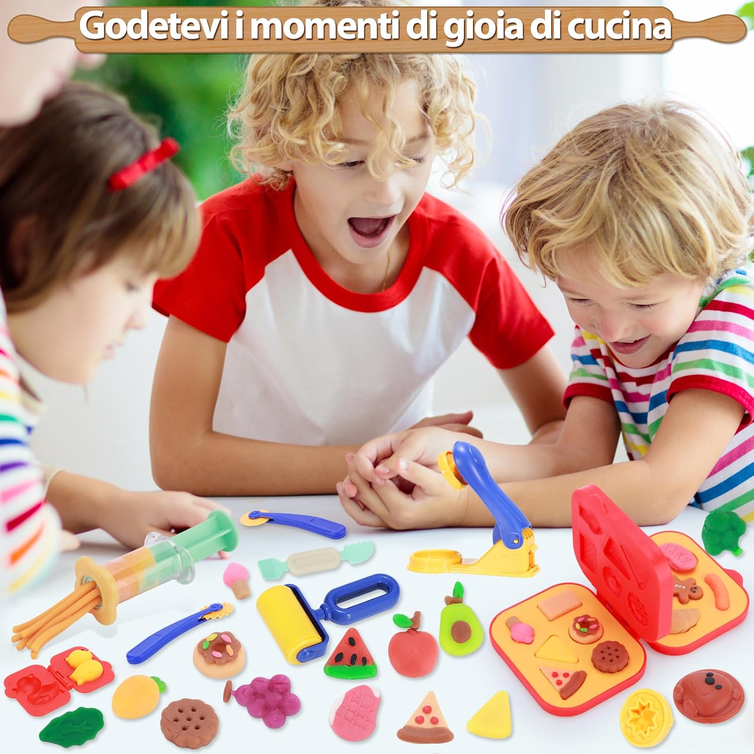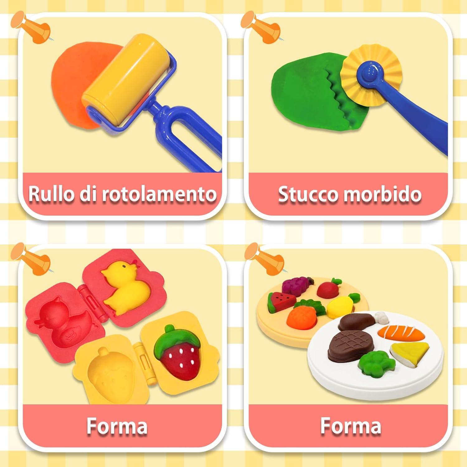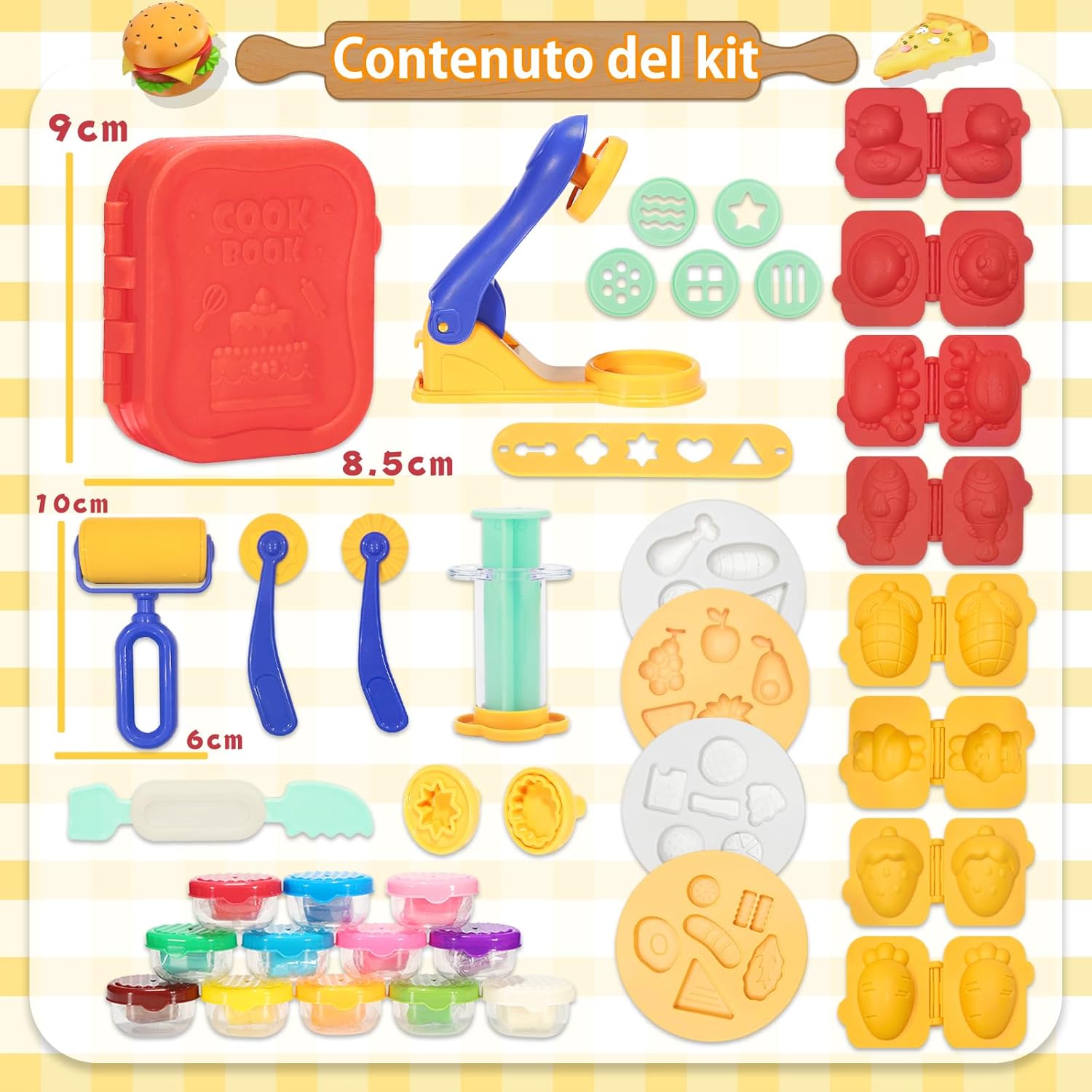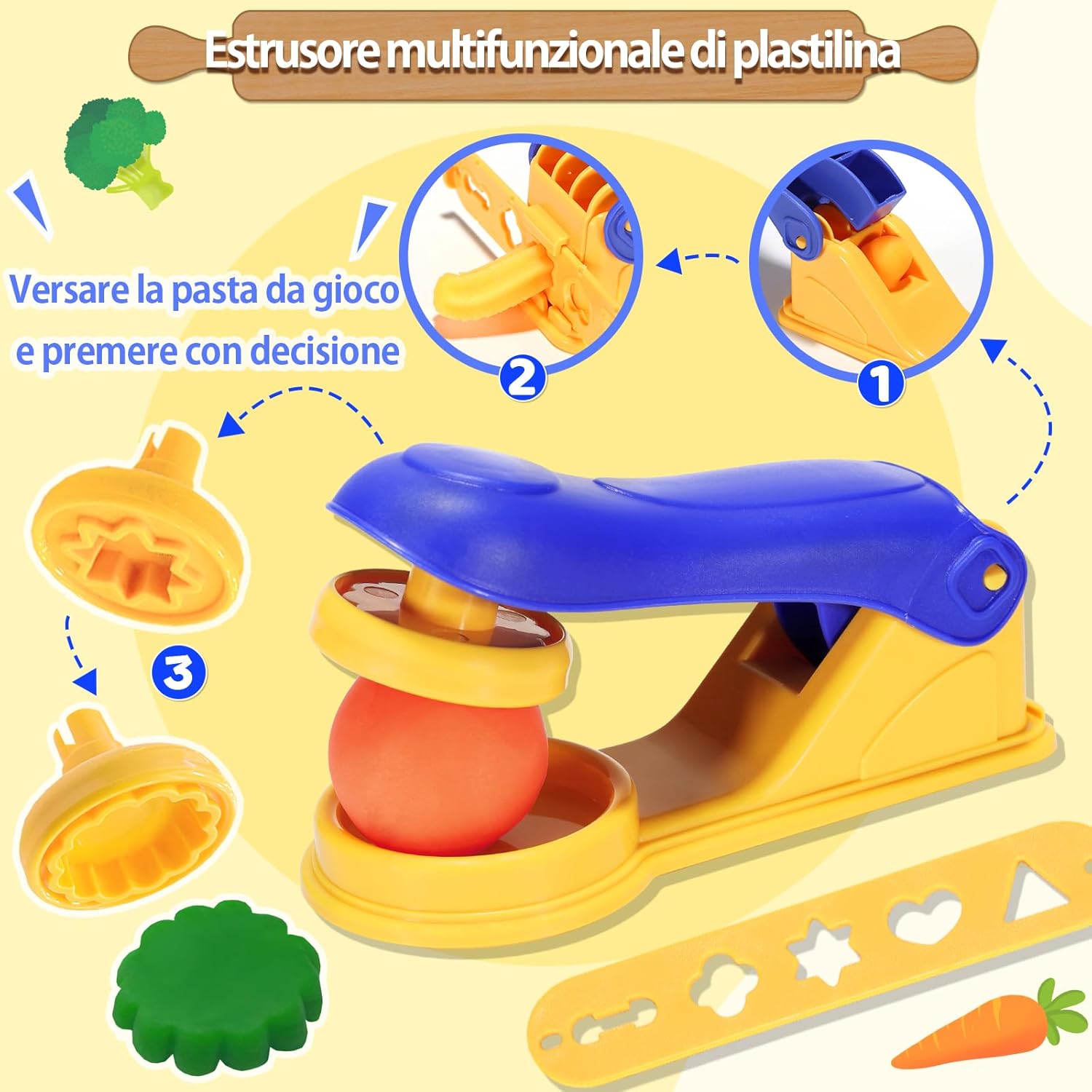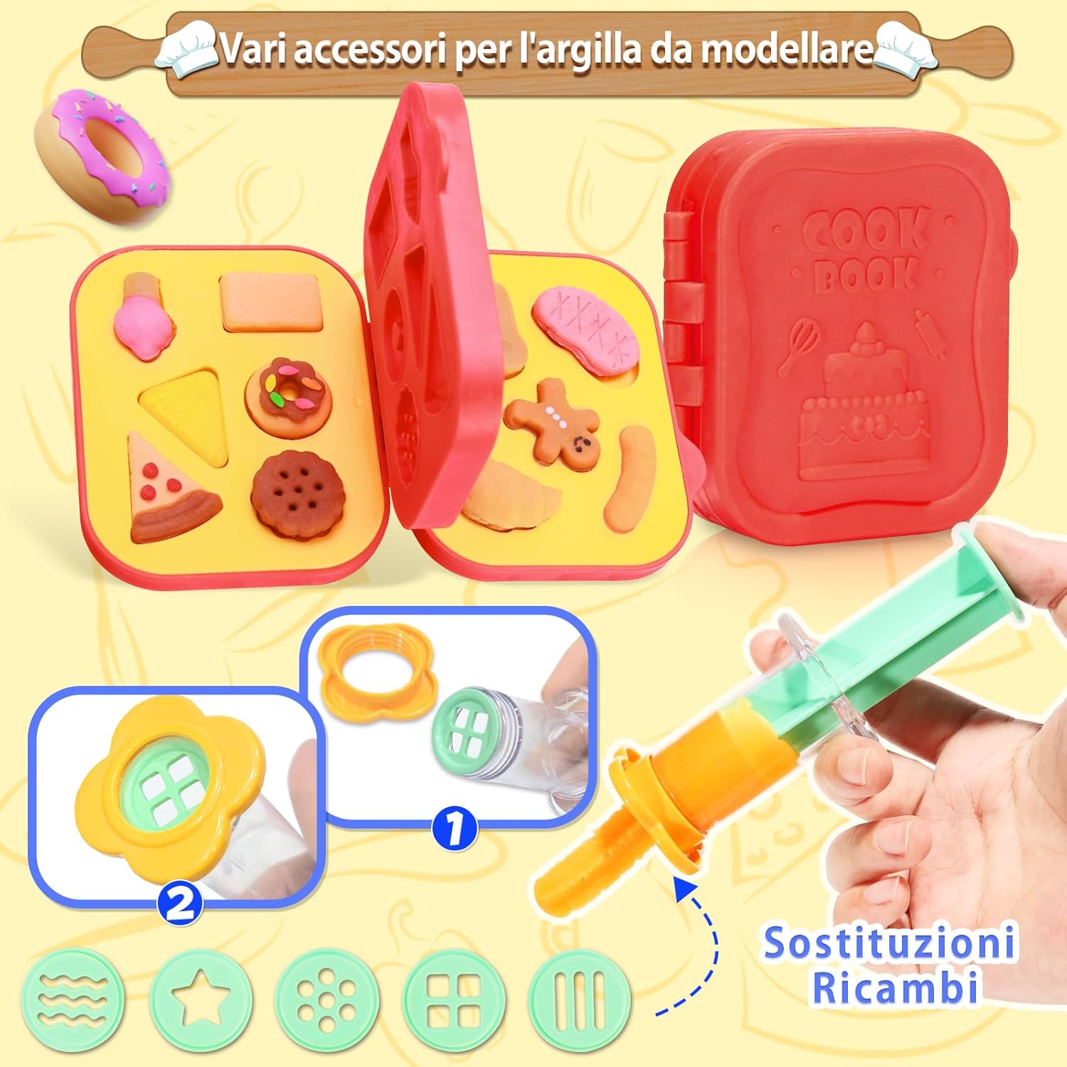 🧁[Kit Plastilina]: Kit di accessori per la plastilina composto da 41 pezzi, tra cui 12 vasetti di pasta da modellare, 1 estrusore per pasta da modellare, 1 libro di stampi da cucina per pasta da modellare, 4 accessori, 6 stampi per frutta animale, 1 macchina per la pasta, rulli, un coltello per tagliare la pasta da modellare e altri strumenti per la pasta da modellare. 🌈[Un Grande Giocattolo Prescolare]: Questo set di plastilina da gioco creativa per bambini dai 3 anni in su non solo aiuta i vostri figli a migliorare le loro abilità pratiche e a stimolare la loro immaginazione e creatività. È anche educativo per imparare l'intero processo di cottura del cibo e migliorare la concentrazione e la coordinazione del bambino. 🍰[Strumento per Impastare]: Dimensioni perfette per le piccole mani, accessori per plastilina per i bambini per tagliare, modellare, pressare e arrotolare, l'argilla da modellare può essere impastata in tutti i tipi di forme, creazioni infinite per i bambini a casa o a scuola. 🍨[Plastilina per Bambini]: Gli accessori per plastilina sono realizzati in plastica ABS resistente e di alta qualità per garantire la sicurezza dei bambini. La pasta da modellare è fatta di farina di grano, sale e acqua, colori brillanti, consistenza morbida, può essere usata più volte; se la plastilina è secca e screpolata, basta spruzzare una piccola quantità d'acqua, impastare più volte e la pasta da modellare tornerà alla sua forma originale! 🎁[Plastilina da 3 Anni]: VBACALA Gioco da plastilina della cucina creativa regalo, con bella confezione, può rapidamente attirare l'attenzione di bambini e bambine di età compresa tra 3 anni e oltre, adatto per i regali di compleanno, regali di Natale, Halloween, feste, festival, scuola. Perfetto per i bambini che amano giocare a fare gli chef ed essere creativi con gli strumenti della pasta da gioco.