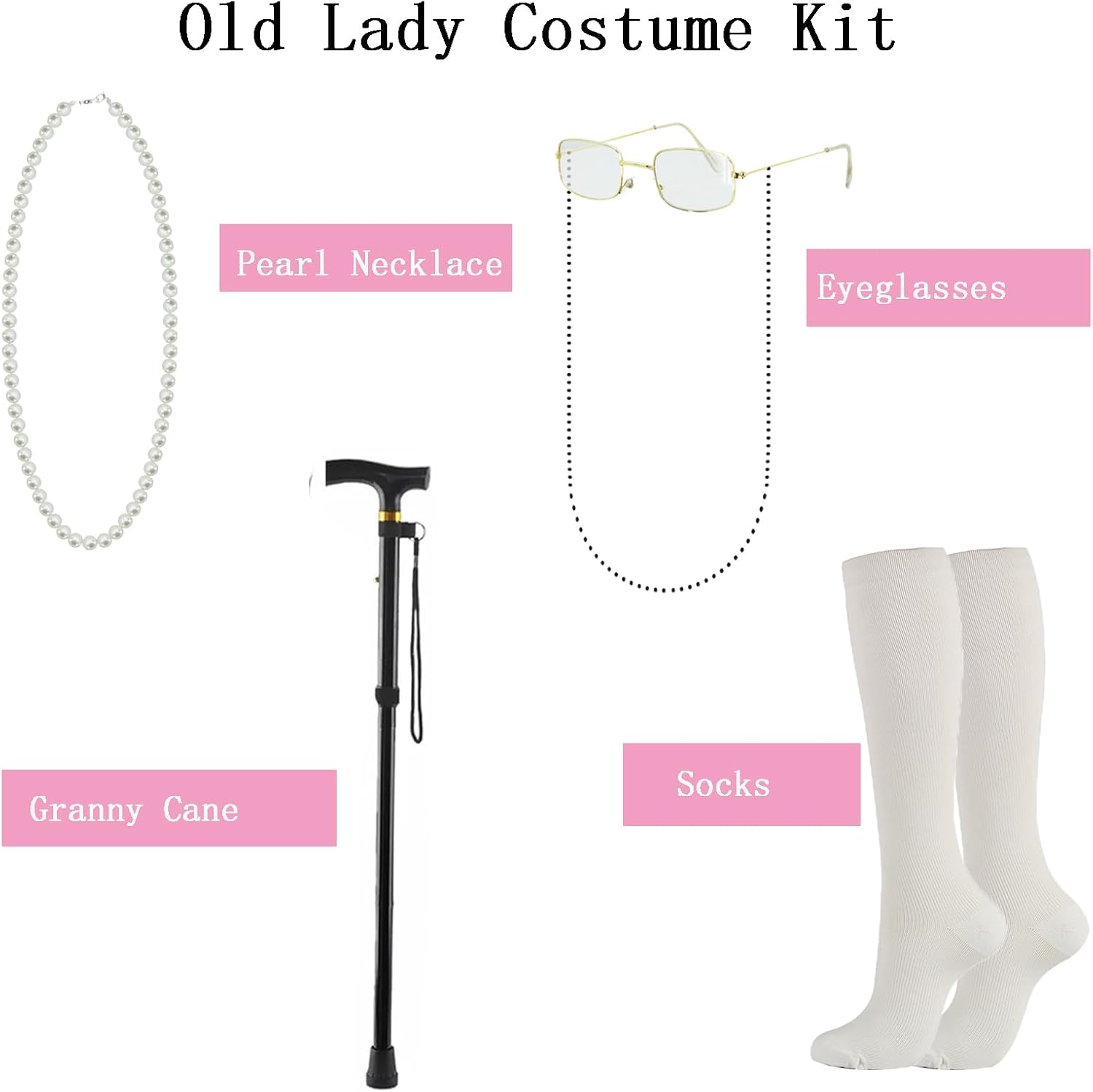 Das Outfit passt perfekt. Das Set beinhaltet das Komplettpaket für den Auftritt als ältere Dame. Man muss sich keine Gedanken um passende Accessoires machen. Sogar der Stock ist klappbar und in der Größe verstellbar. Die Lockenwickler werden separat geliefert. Sie sind nicht bereits in die Perücke gewickelt, wie es auf den Produktbildern den Eindruck macht. Man muss sie selbst eindrehen oder kann sie auch weglassen.