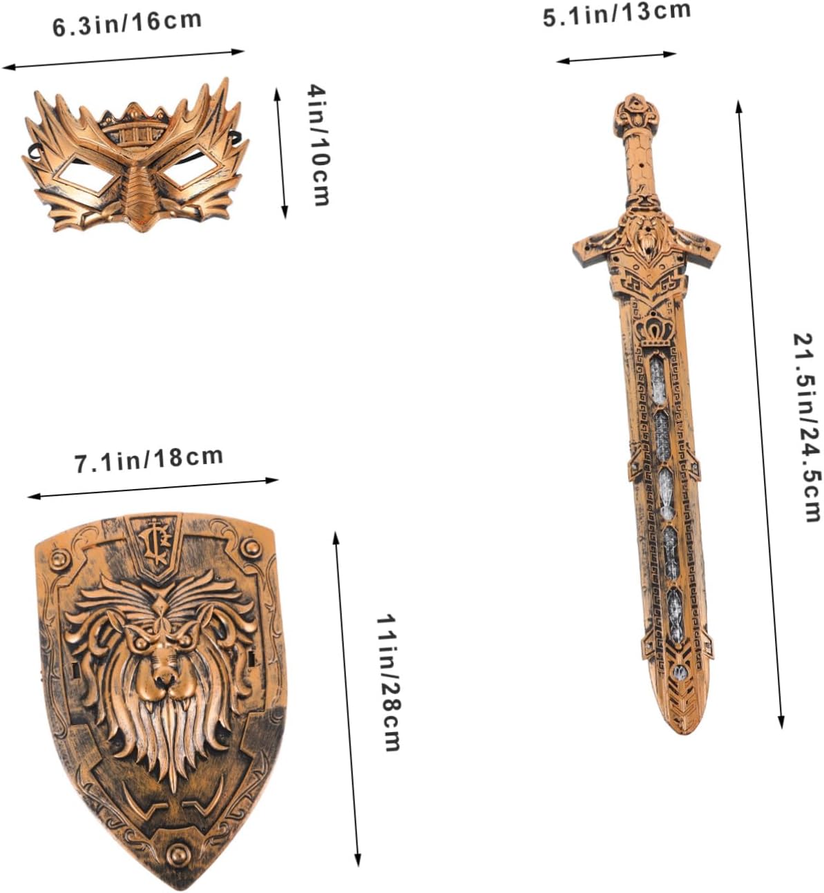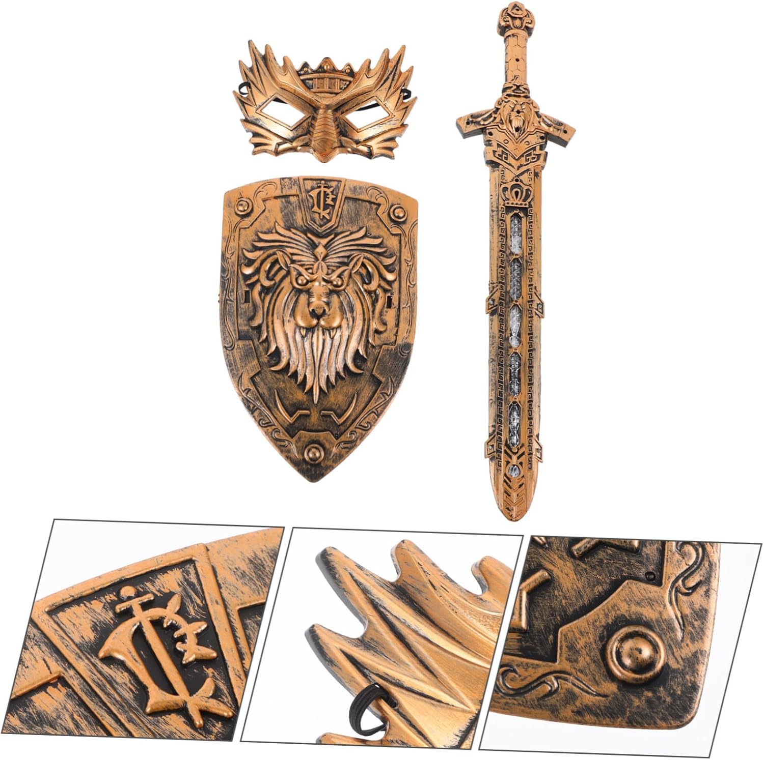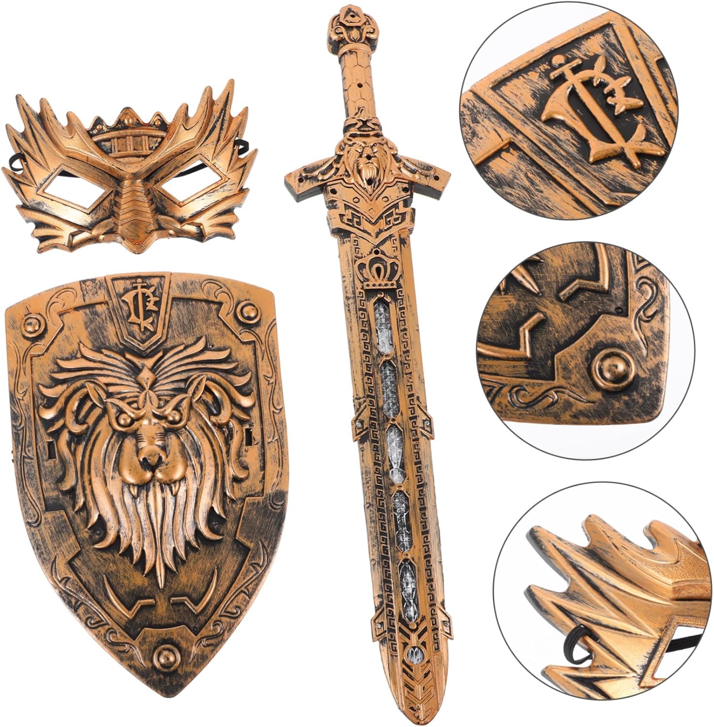 Scudo: questo set di scudo, maschera ed è sicuro e garantisce un uso duraturo senza rompersi o deformarsi facilmente, scudo cosplay per accessori cosplay: con il suo design liscio e arrotondato, lo scudo può attirare interesse e fornire un'esperienza di gioco divertente, scudo cosplay per giochi di ruolo: questo set di oggetti cosplay può essere utilizzato per vari scopi, tra cui feste di Halloween, come oggetto di scena e accessori per costumi, scudo scenico Come oggetto di scena: le dimensioni moderate di questo scudo realistico lo rendono facile da afferrare e tenere in mano e garantisce una piacevole esperienza di gioco. Scudo da festa con spada: la lunghezza corretta dello scudo cosplay lo rende facile da afferrare e trasportare ed è ottimo per l'uso come scudo da gioco