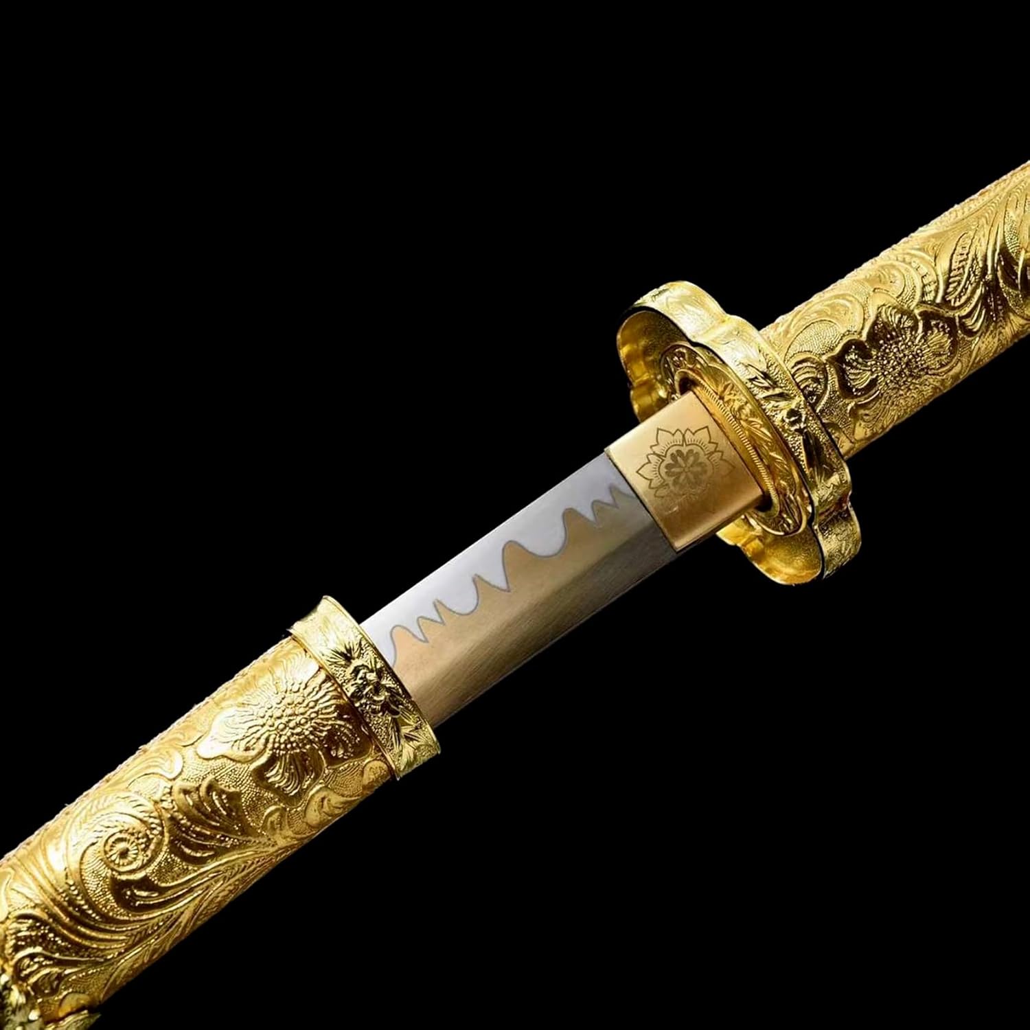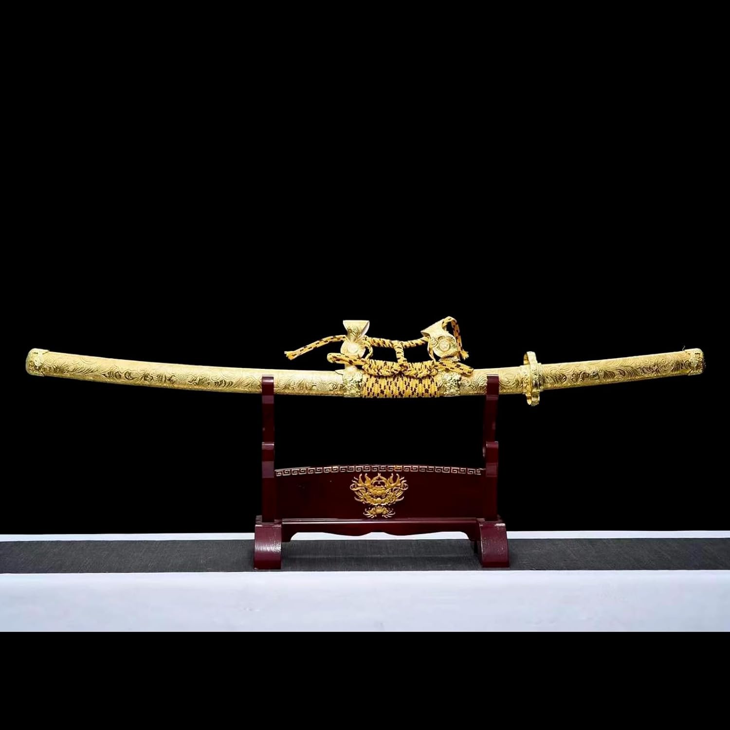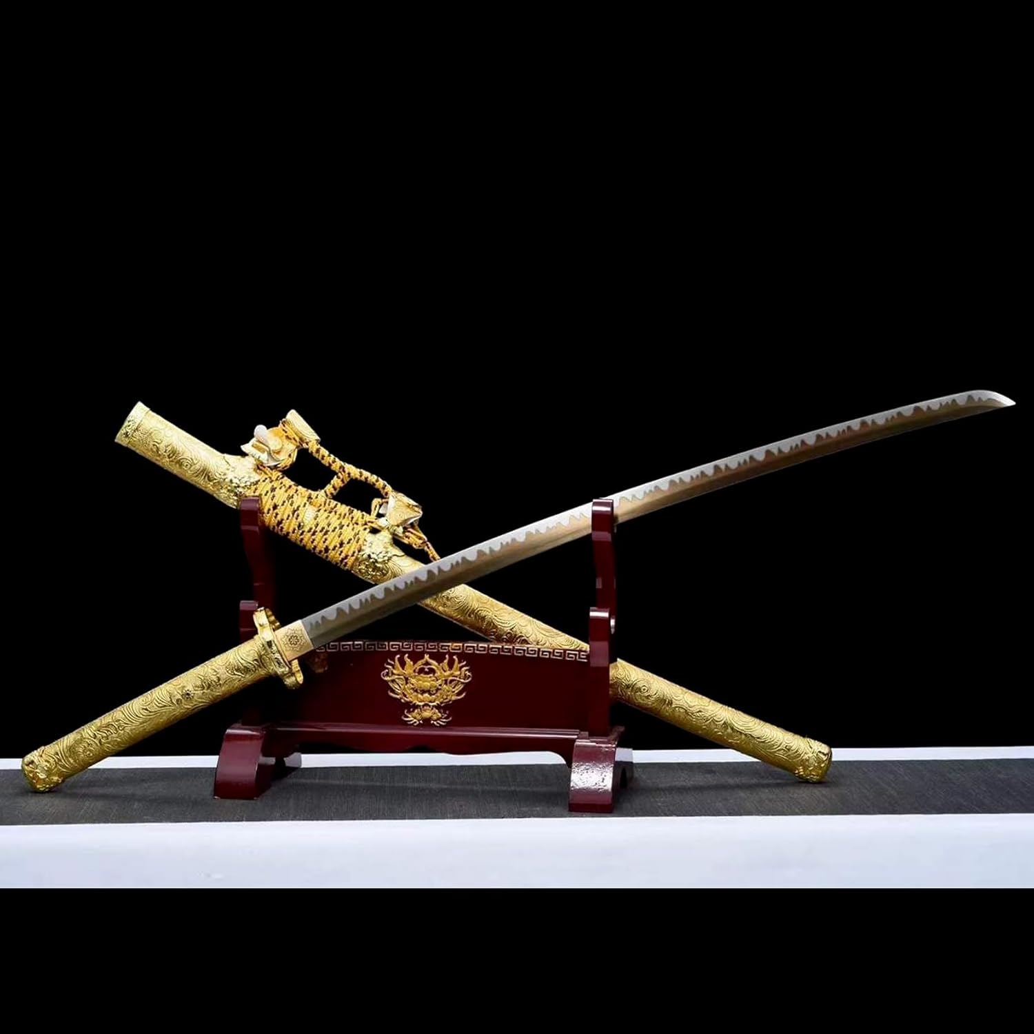 La lama è realizzata in acciaio per molle di alta qualità ed è prodotta utilizzando il tradizionale processo di forgiatura. Forgiato e affilato a mano per creare una lama perfetta. Le proporzioni sono cruciali per la progettazione delle armi. Le proporzioni perfette non solo rendono la katana più bella, ma ne garantiscono anche la praticità e la funzionalità. Lunghezza totale: 104 cm, lunghezza lama: 72 cm, lunghezza manico: 26,5 cm, larghezza lama: 3,2 cm, spessore lama: 0,7 cm, peso totale: 1,2 kg. Ogni katana porta con sé l'essenza dell'artigianato tradizionale. Dalla selezione del materiale alla forgiatura, dalla molatura alla tempra, ogni fase viene accuratamente lucidata dagli artigiani per garantire che ogni katana sia un'opera d'arte unica. Le Katana sono adatte per essere collezionate ed esposte in varie occasioni. Sia nello studio, nel soggiorno, nell'ufficio o nello studio di arti marziali, può diventare una decorazione e un'esposizione unica. Non solo riflette il gusto e la personalità del proprietario, ma conferisce anche alla stanza un'atmosfera misteriosa e solenne.